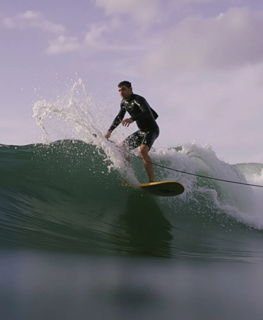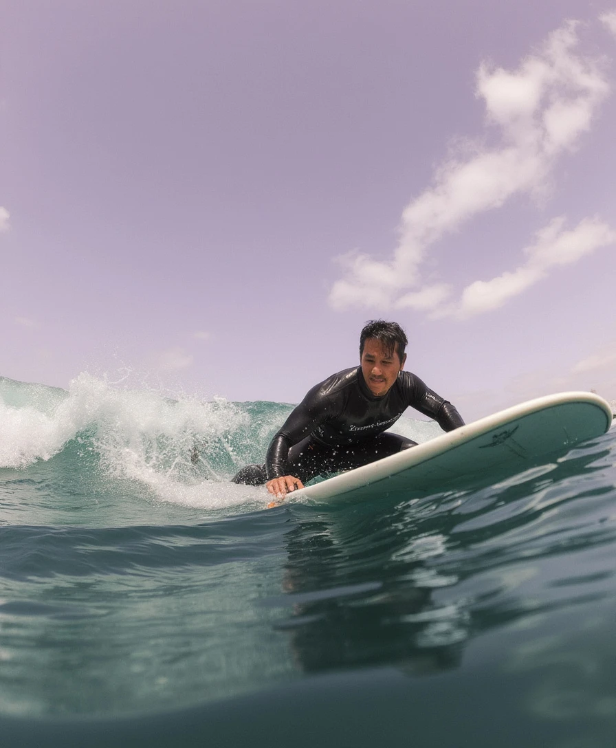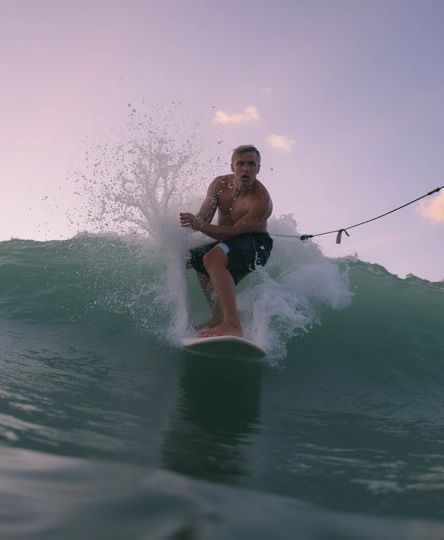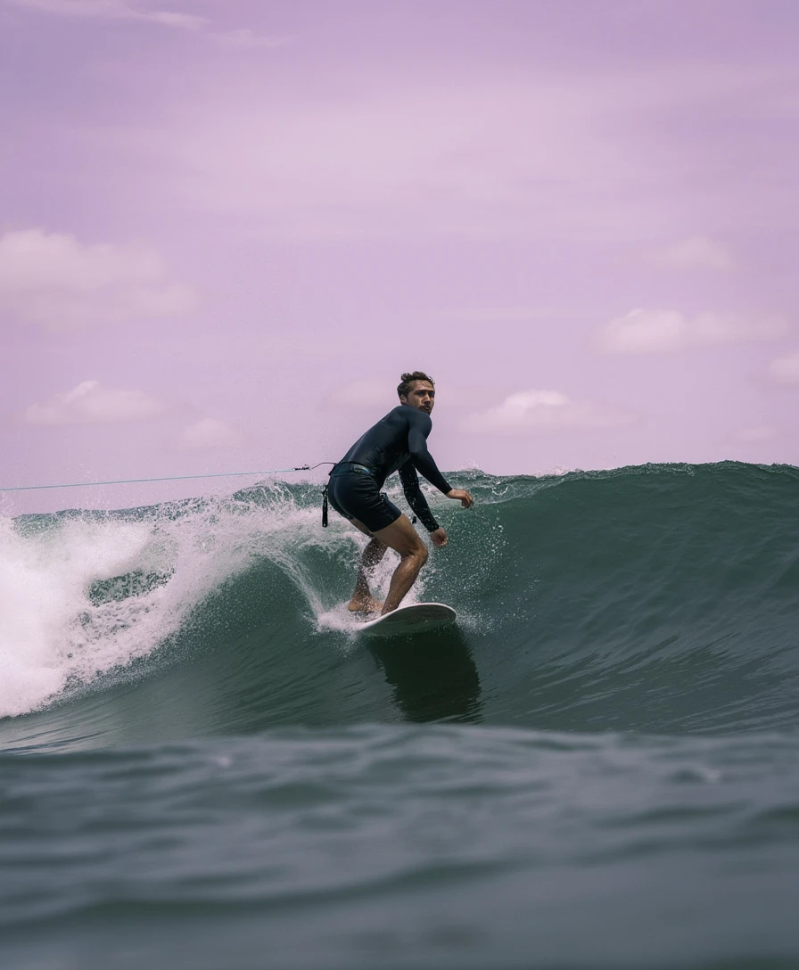 a surfer is captured in a low-angle shot, riding a wave in the ocean. the surfer is positioned on a surfboard, with their back turned to the viewer. the surfboard is equipped with a leash, connecting it to the surfer's feet. the wave they are riding is a dark green, with white foam crests and a splash of water in the upper left corner of the frame. the sky above is a soft, light purple, with a few wispy white clouds scattered across it. the surfer's face is partially obscured by the wave, adding a dynamic element to the composition.