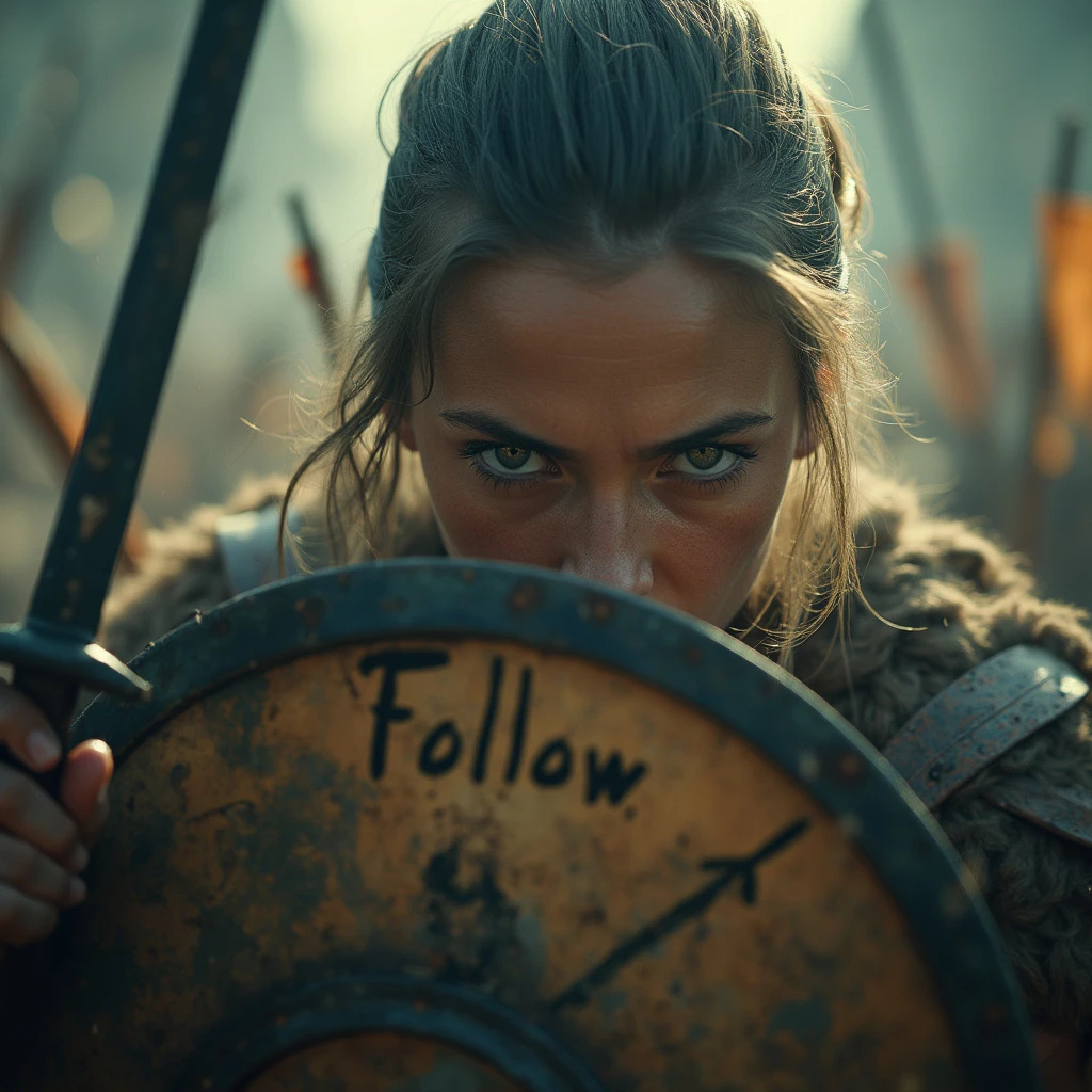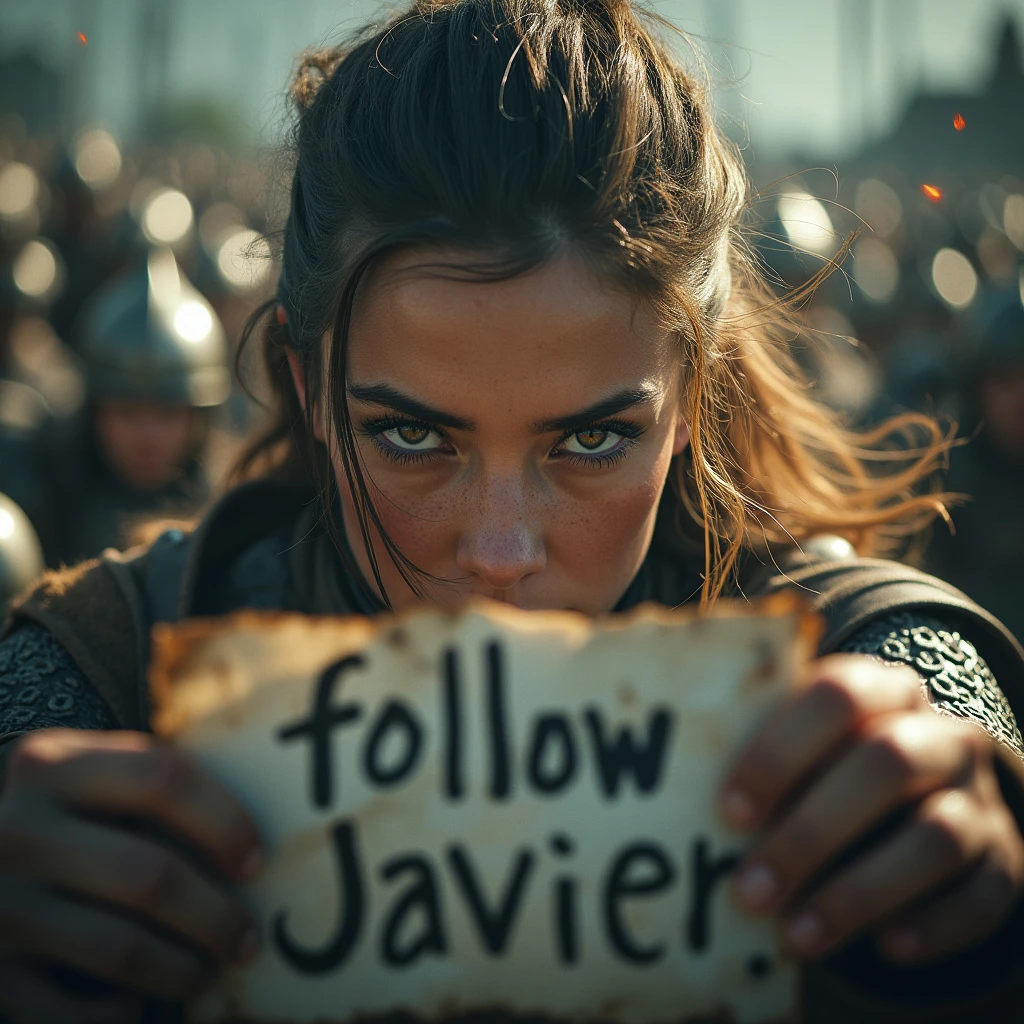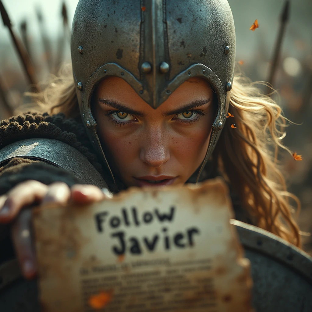 An hyper realistic and cinematic image of a Dramatic low angle close-up of the warrior's eyes narrowing as she brings her shield up, enemy blades and arrows raining down around her in a blurred, high-speed moment, frozen motion, 16k. She is holding and showing to the viewer an old paper with handwritten "Follow Javier" clearly visible