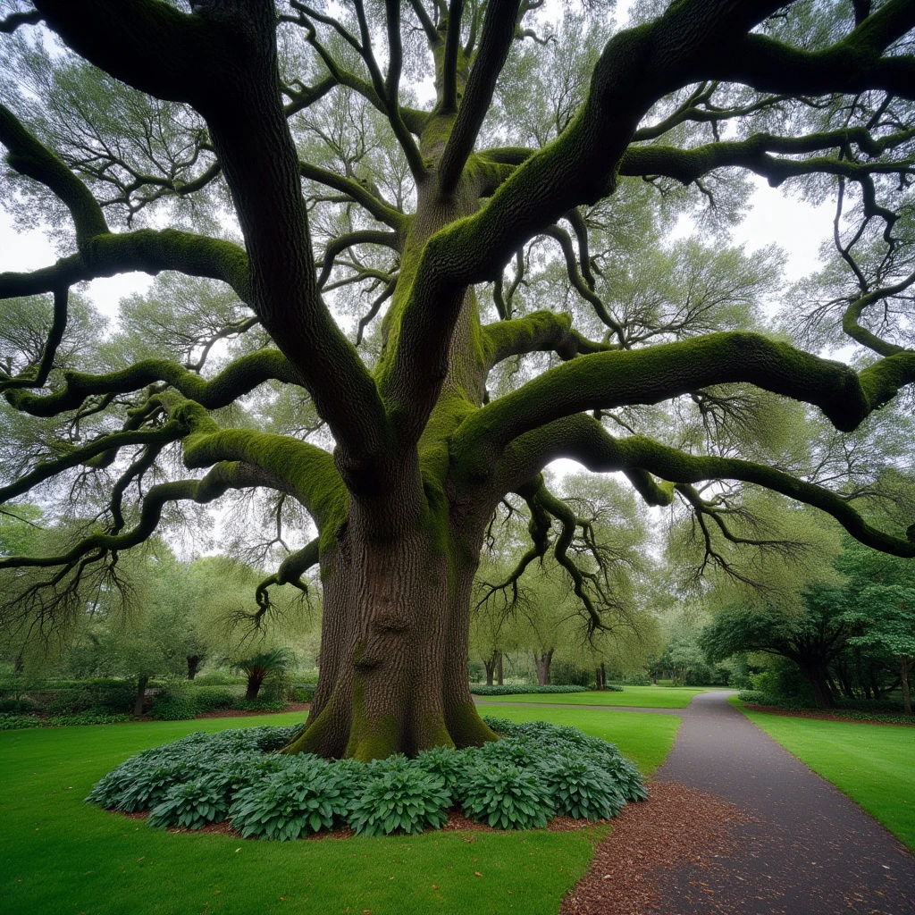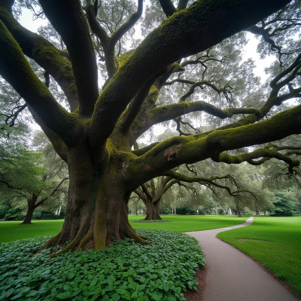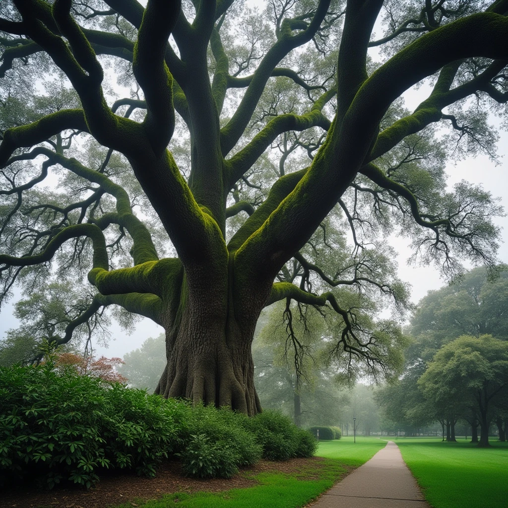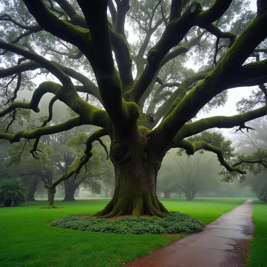 eye-level on a cloudy day, a majestic live oak tree dominates the scene. its sprawling branches, adorned with moss and lichen, create a sense of tranquility and mystery. the tree stands tall, its trunk dominating the foreground, while its branches extend out in a sweeping arc, creating a sense of depth and scale. the tree's trunk is encircled by a lush green underbrush, adding a touch of nature's beauty to the scene. to the right of the tree, a path winds through a sea of green grass, adding a touch of urbanity to the otherwise natural setting.