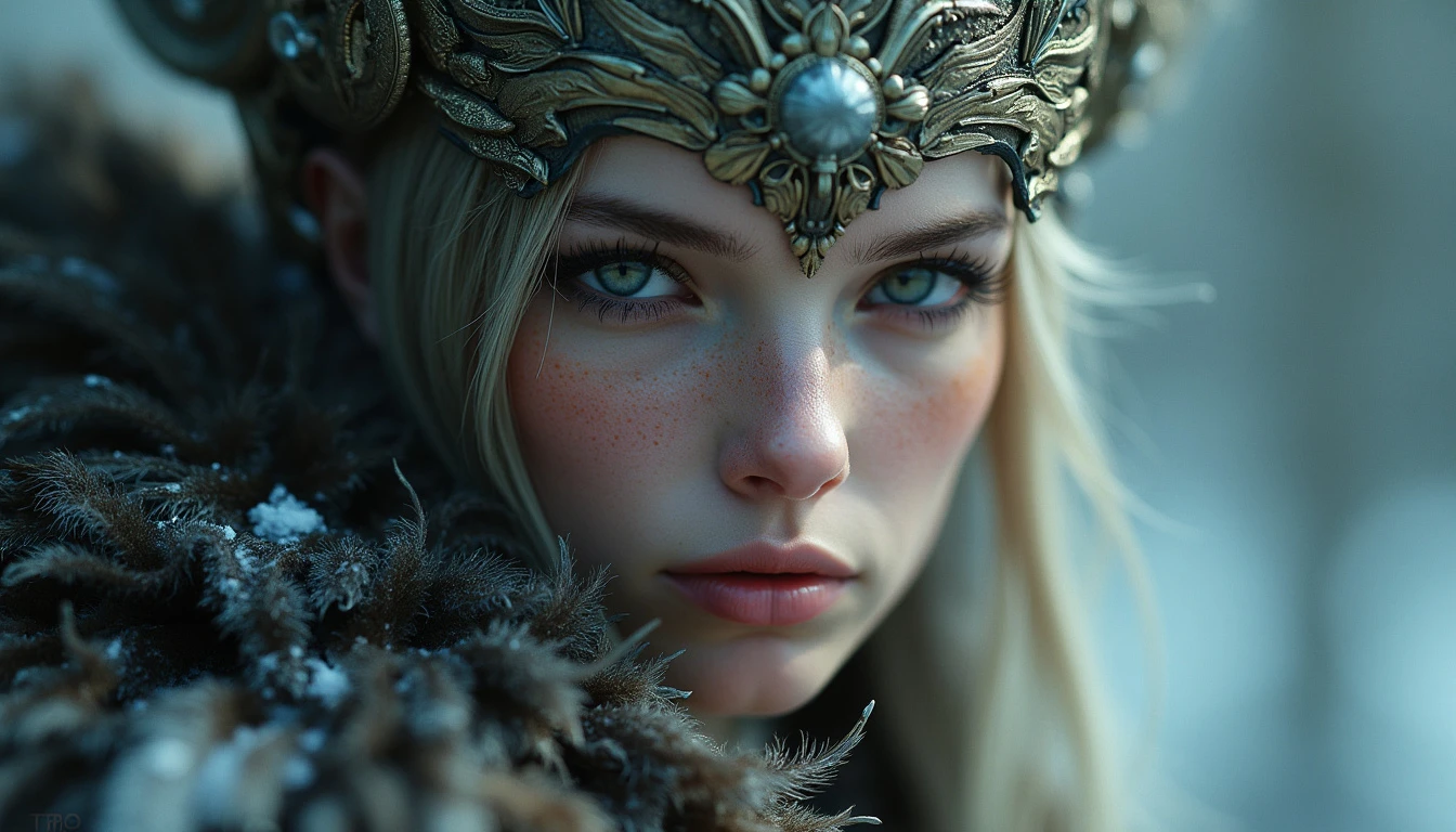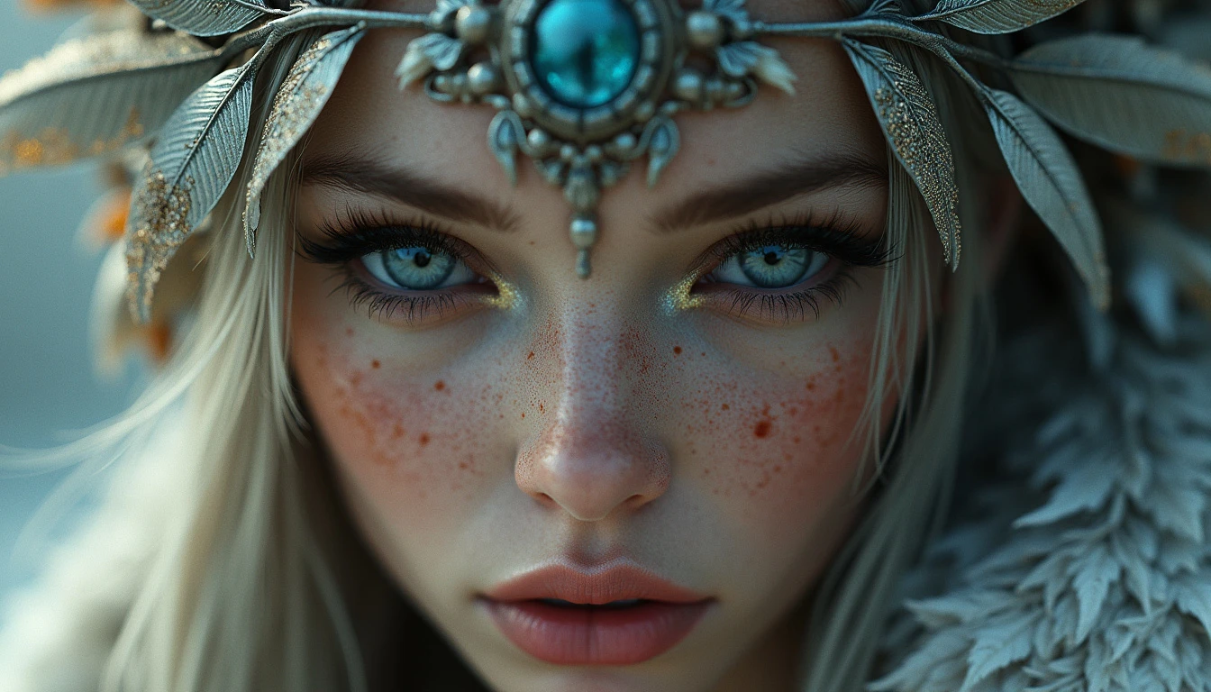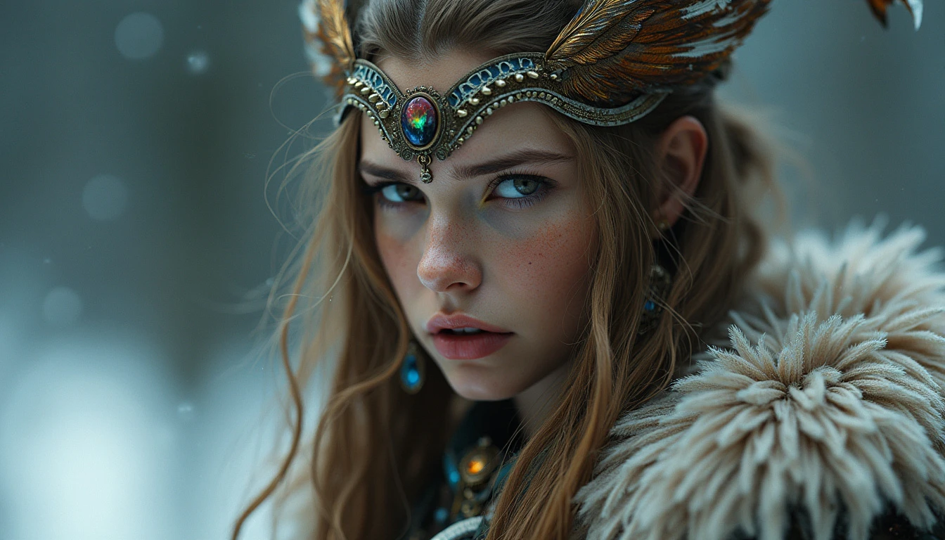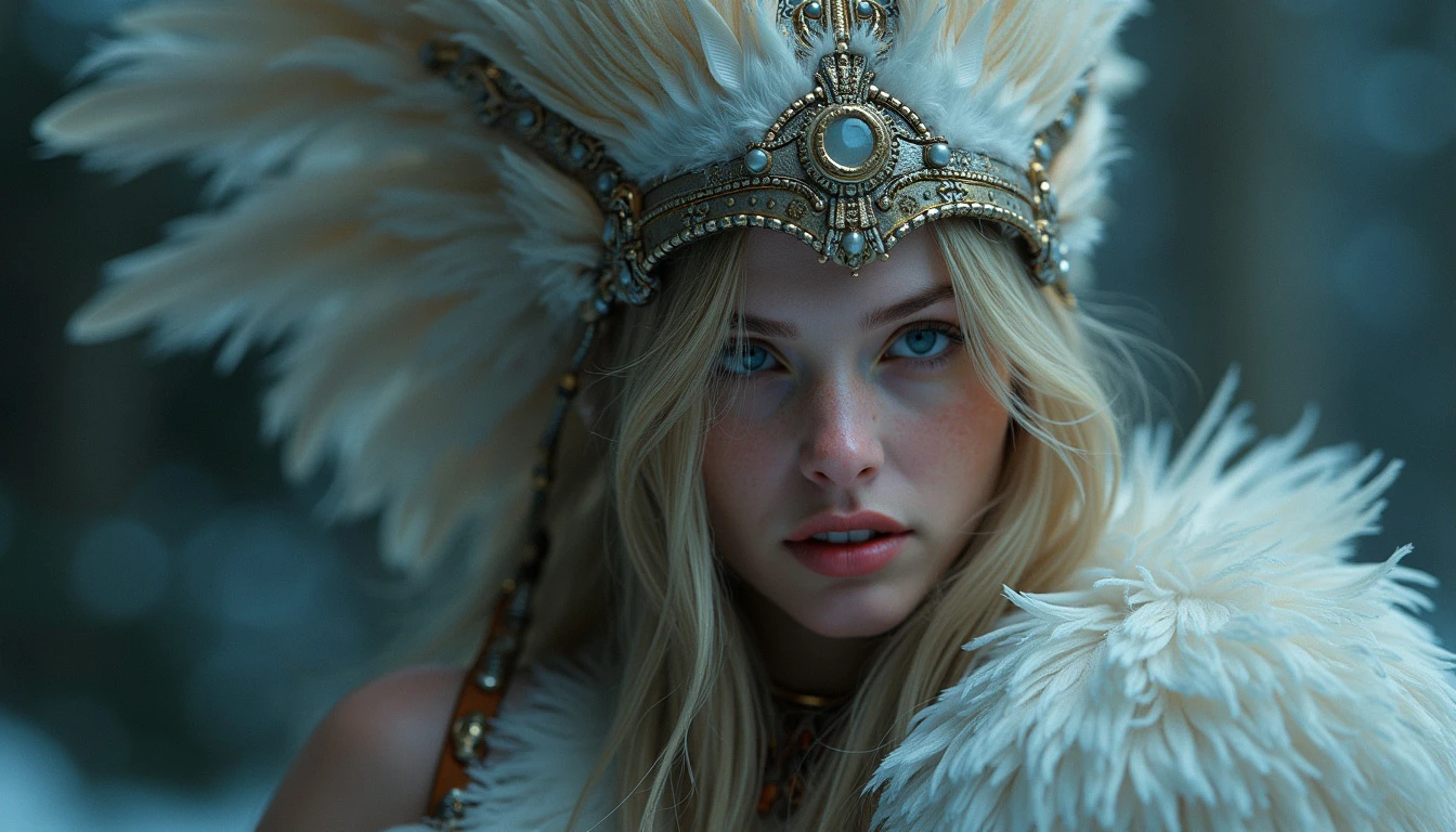 A close-up of a ultra realistic and Ultra detailed image, ultra realistic, ultra detailed artistic photography, ultra high-detail, cinematic lighting, concept art, epic, surrealistic, magic, mystical, art, creativity, macro photography, hyperdetailed, trending on artstation, sharp focus, studio photo, intricate details, highly detailed Masterpiece, realism, digital art, full body shot of a woman as mystic Valkyrie with feathered headdress and fur crop top, Norse, goddess of winter, art by Karol Bak, avian warrior, ultrarealistic hyper realistic, rim lighting, cinematic, perfect contrast, high sharpness, depth of field, ultra detailed photography, global illumination, smooth, ultra high definition, 8k, unreal engine 5, ultra sharp focus, award winning photograph