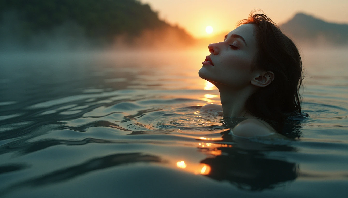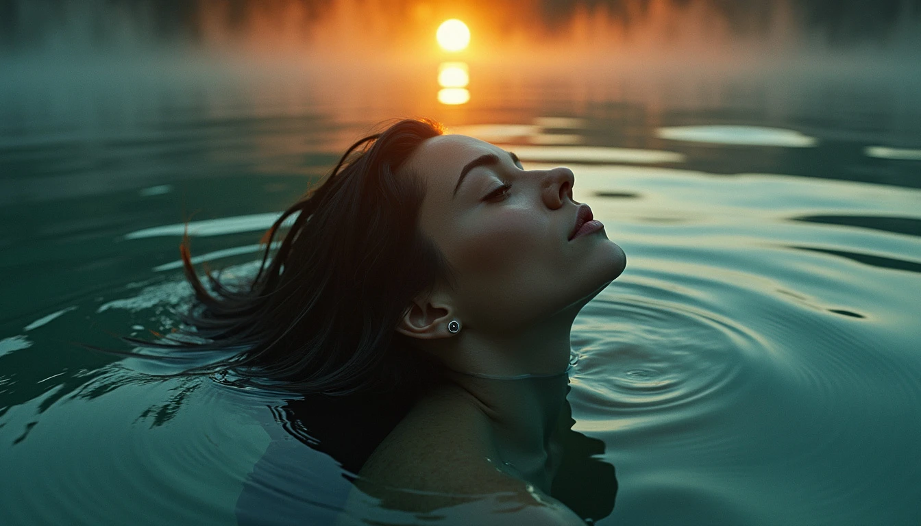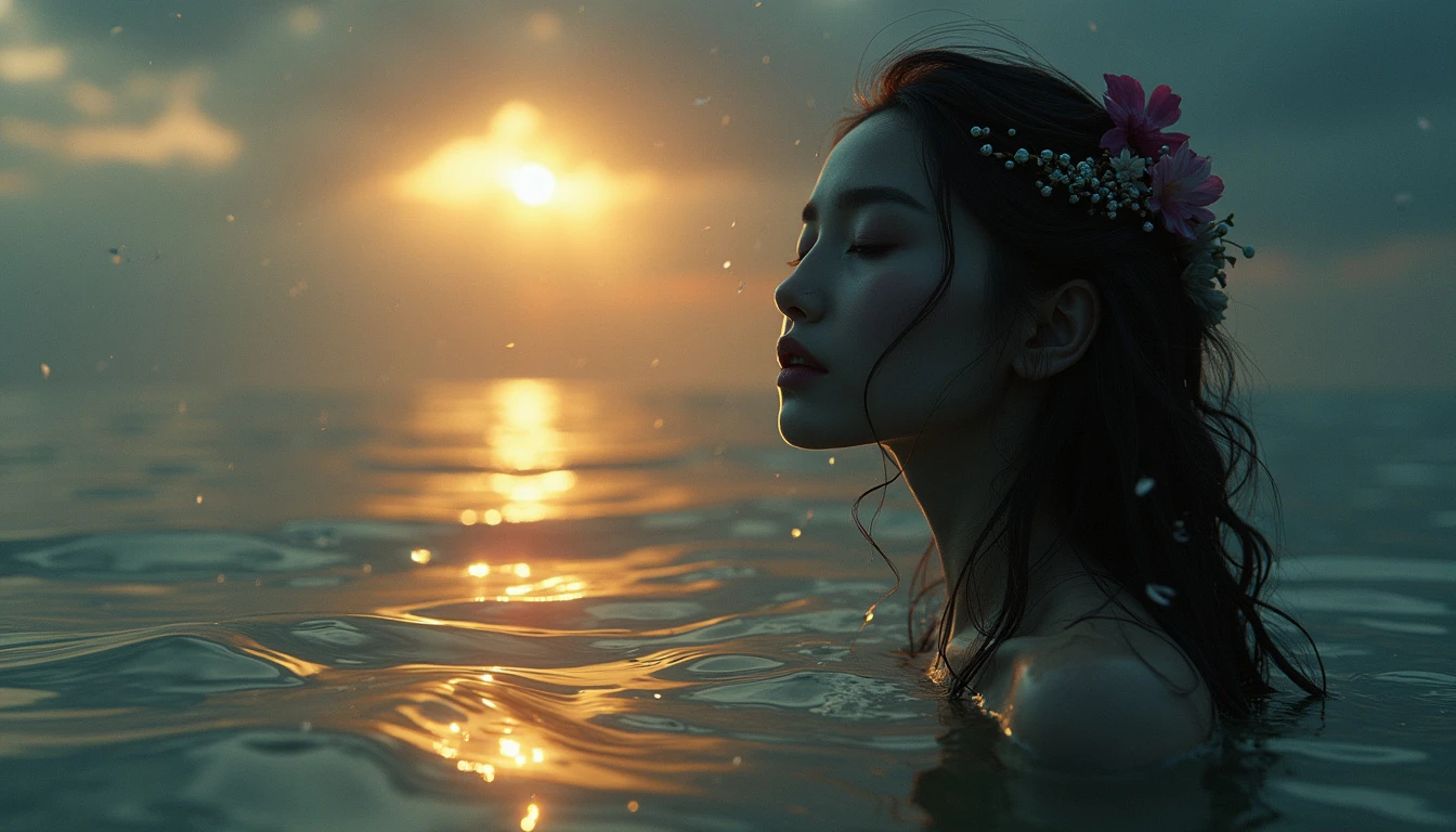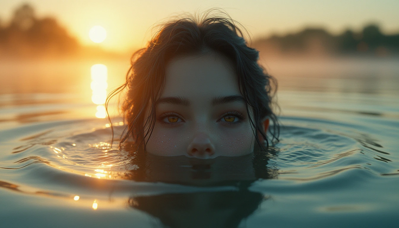 A ultra realistic and Ultra detailed image, ultra realistic, ultra detailed artistic photography, ultra high-detail, cinematic lighting, concept art, epic, surrealistic, magic, mystical, art, creativity, macro photography, hyperdetailed, trending on artstation, sharp focus, studio photo, intricate details, highly detailed Masterpiece, realism, 2/3 rule composition, high quality, 8K Ultra HD, A stunning, ethereal nymph-like woman is emerging from beneath the water, with only the upper half of her face visible above the surface. The image is set at dusk with the sun casting a beautiful backlight, creating a silhouette effect that highlights the delicate features of her face. Volumetric light beams filter through the misty air, adding a mystical atmosphere. The water is calm, with gentle ripples around her. The overall composition evokes a sense of peace, serenity, and admiration, with an artistic and dreamlike quality.