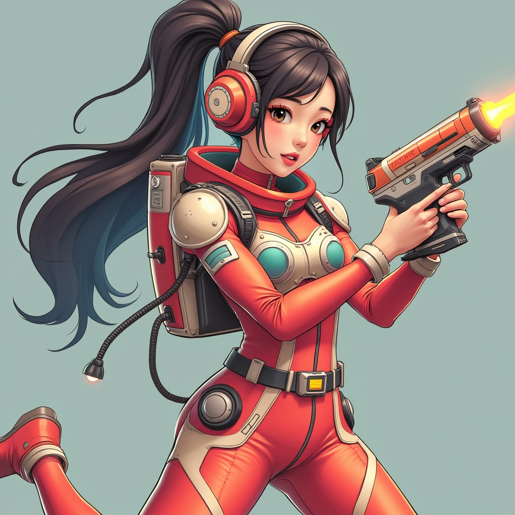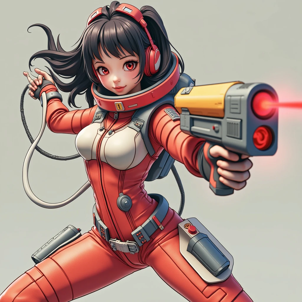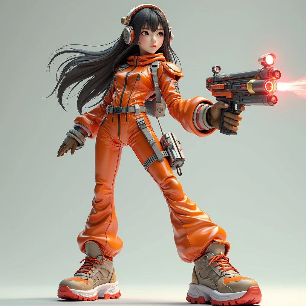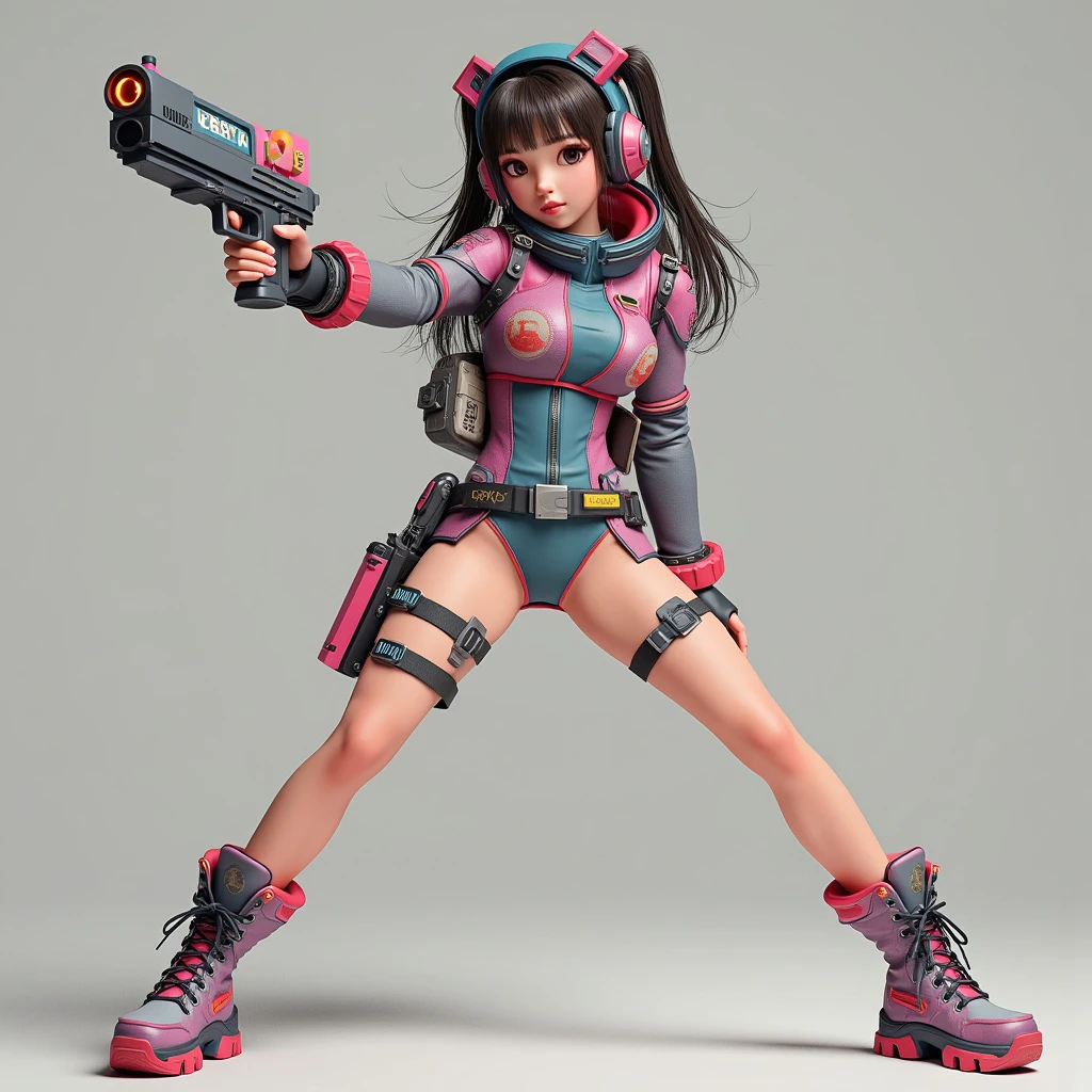 a 3D render of a beautiful Korean k-pop girl in a retro space suit holding a retro laser gun while standing in an action pose with legs spread and pointing gun at camera, ultra detail, 4k resolution, realistic, realism, photo-realism