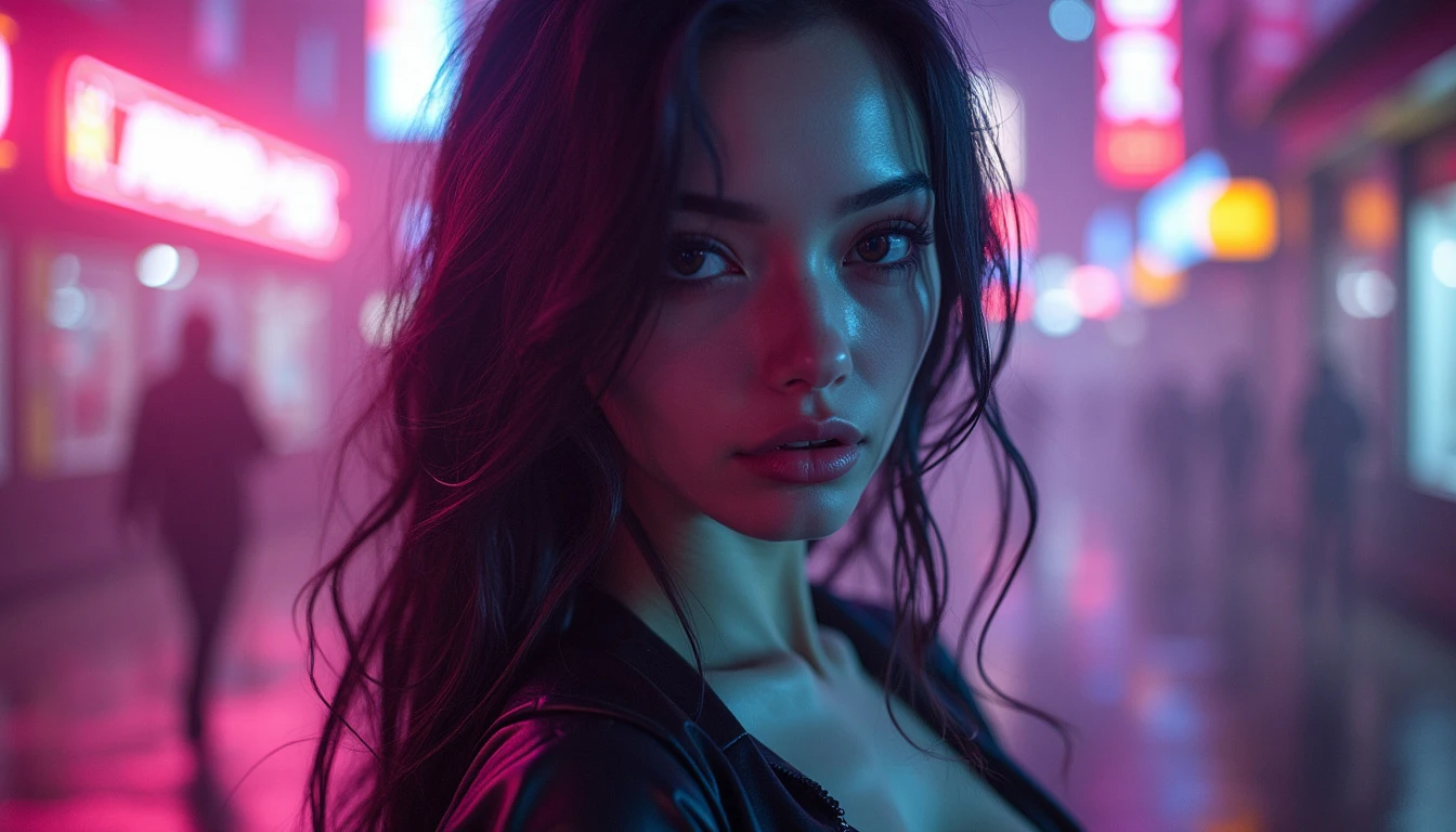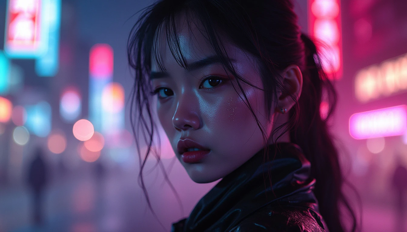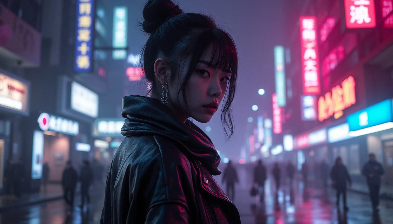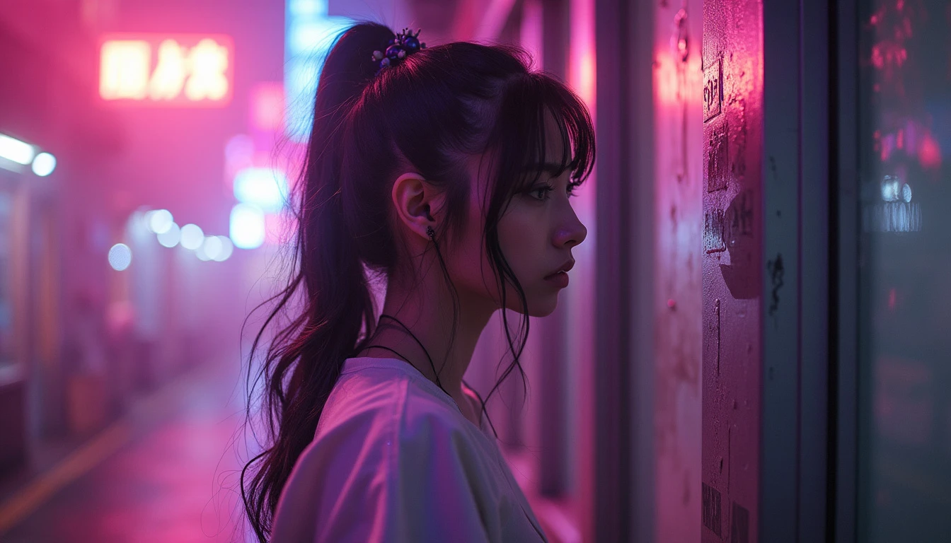 A ultra realistic and Ultra detailed image, ultra realistic, ultra detailed artistic photography, ultra high-detail, cinematic lighting, concept art, art, creativity, macro photography, sharp focus, intricate details, realism, 2/3 rule composition, high quality, 8K Ultra HD, ((Masterpiece)),atmosphere like blade runner 2049, a beautiful cyber woman in a air polluted neon city in the style of minimalist figur, light white and purple, mote kei, realist-portrait, ethereal photography, ghostly figure, close up, pictorial dram, 50mm
