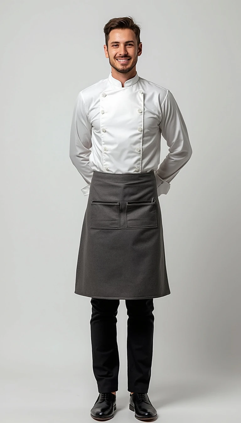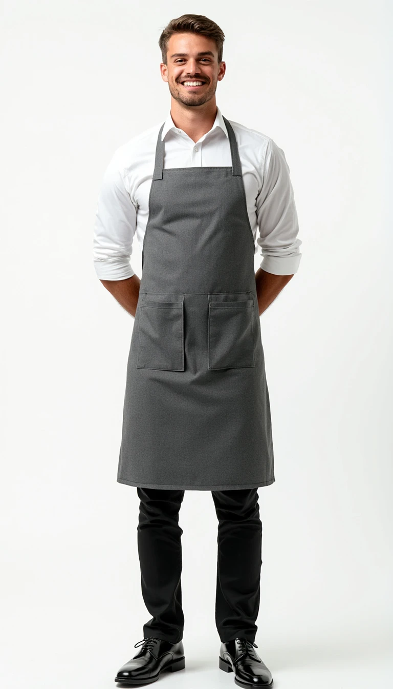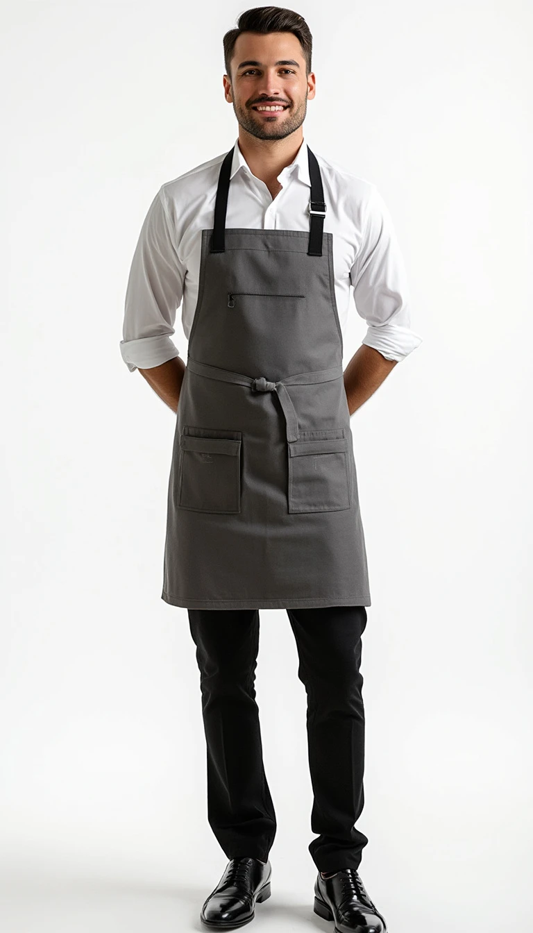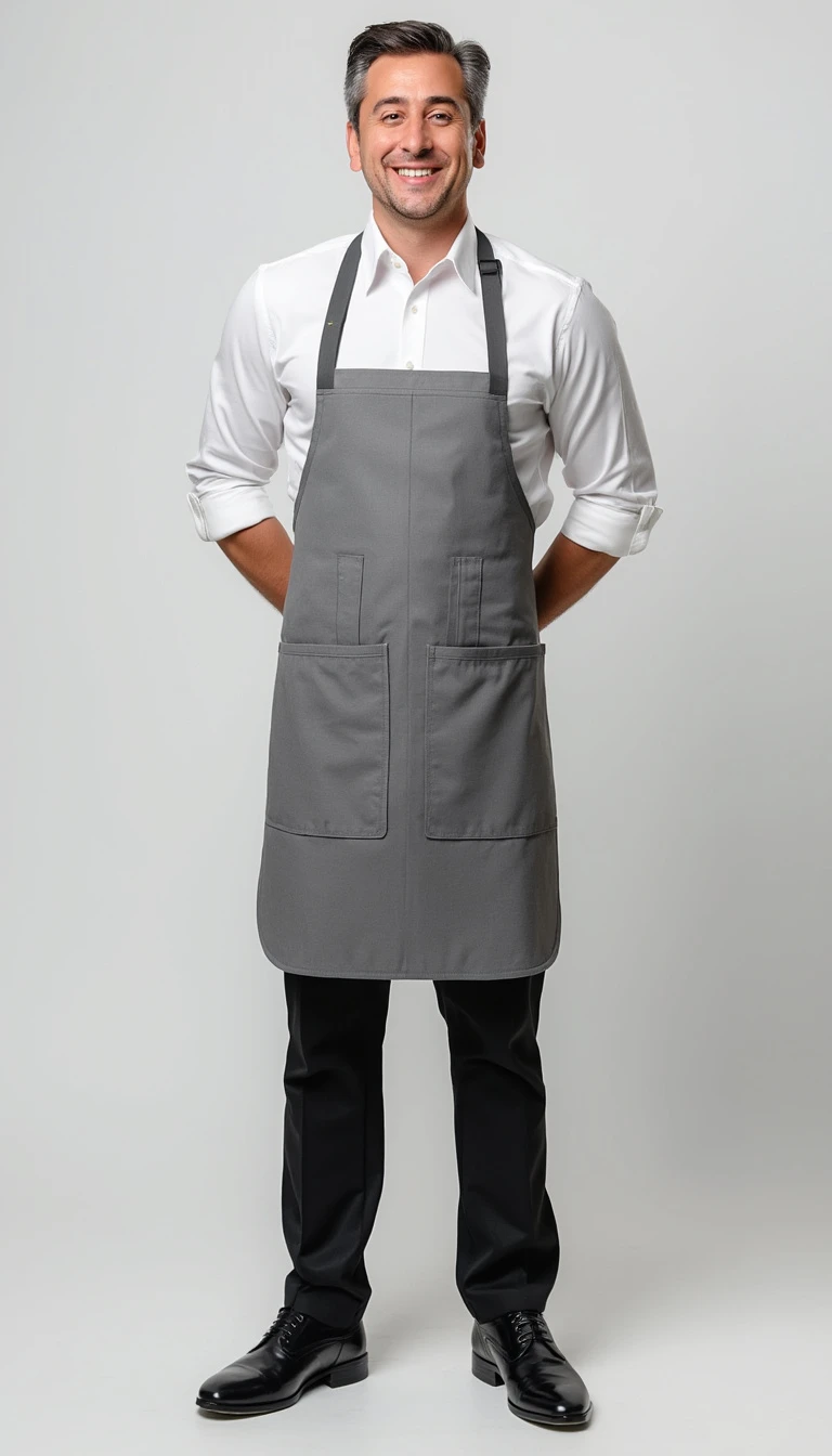 An 30 years old elegant man man standing upright. luxury restaurant waiter. Luxury pose. One hand behind. He is wearing a white dress shirt, no tie, a gray apron, luxury black dress shoe, and black trousers. He has a cheerful expression on his face. The apron has two pockets on the front. The background is plain white, emphasizing the subject.