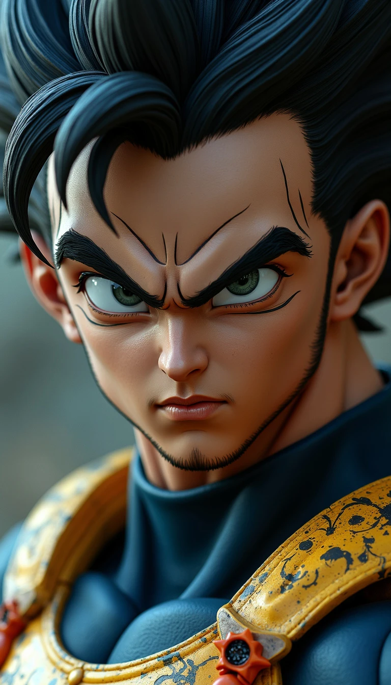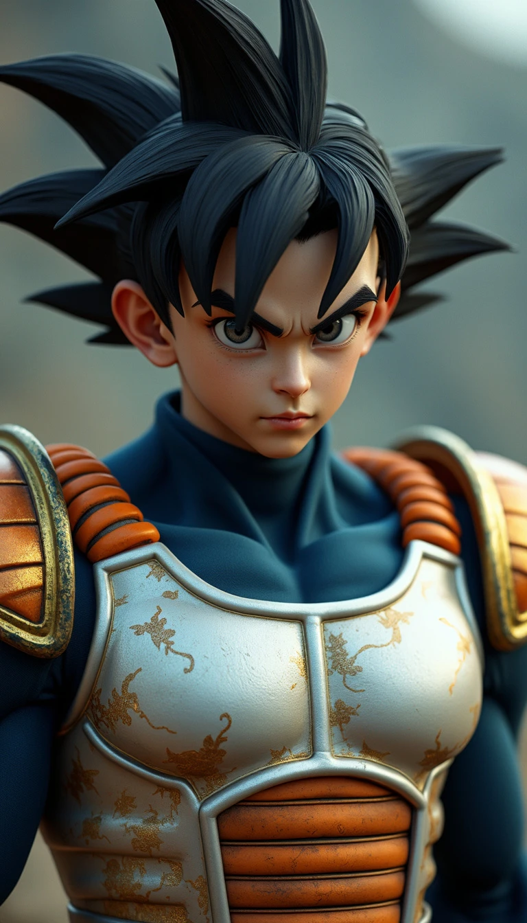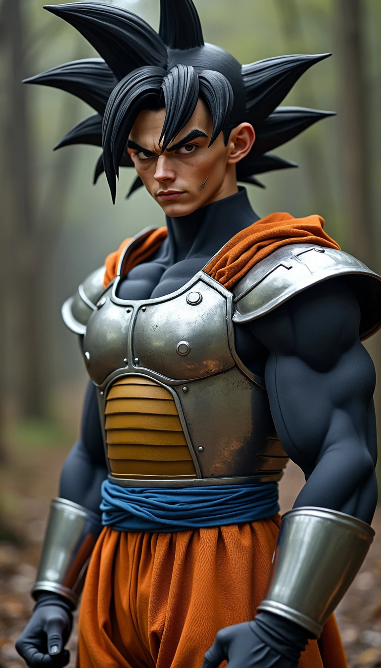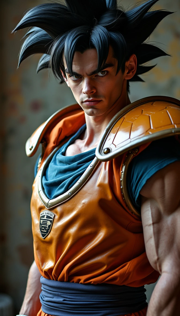 Man wearing saiyan armor from dragonball z, (((full body visible))), looking at viewer, portrait, photography, detailed skin, realistic, photo-realistic, 8k, highly detailed, full length frame, High detail RAW color art, piercing, diffused soft lighting, sharp focus, hyperrealism, cinematic lighting