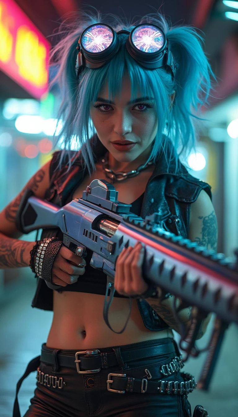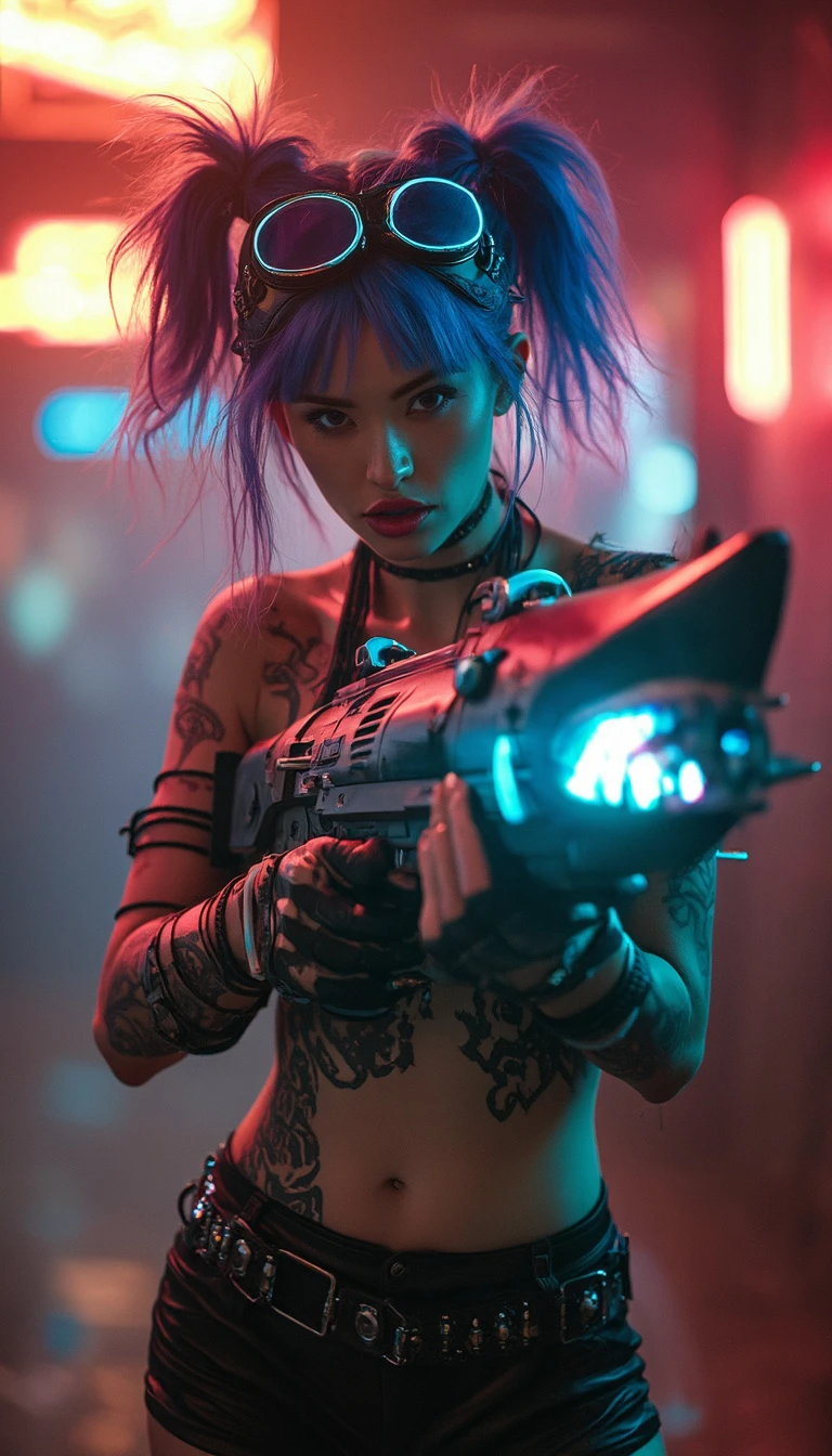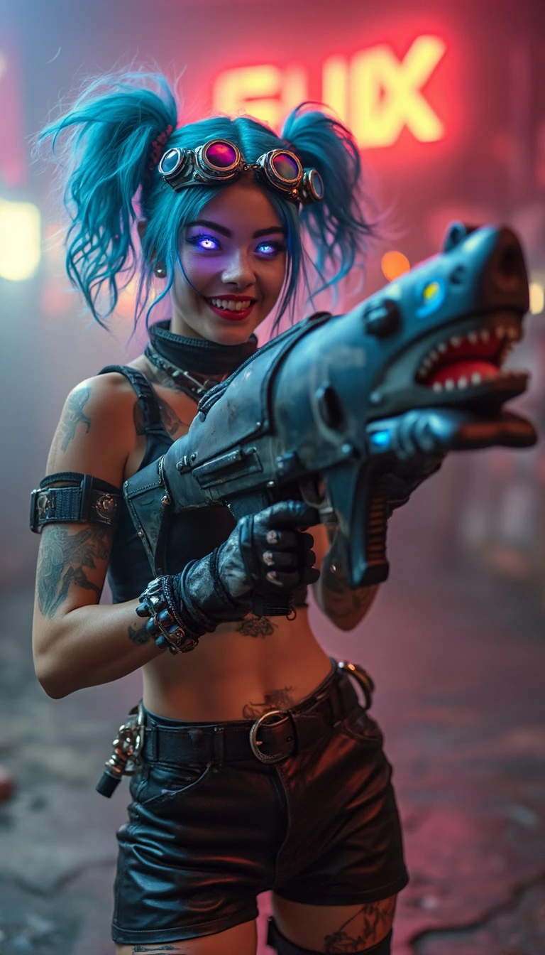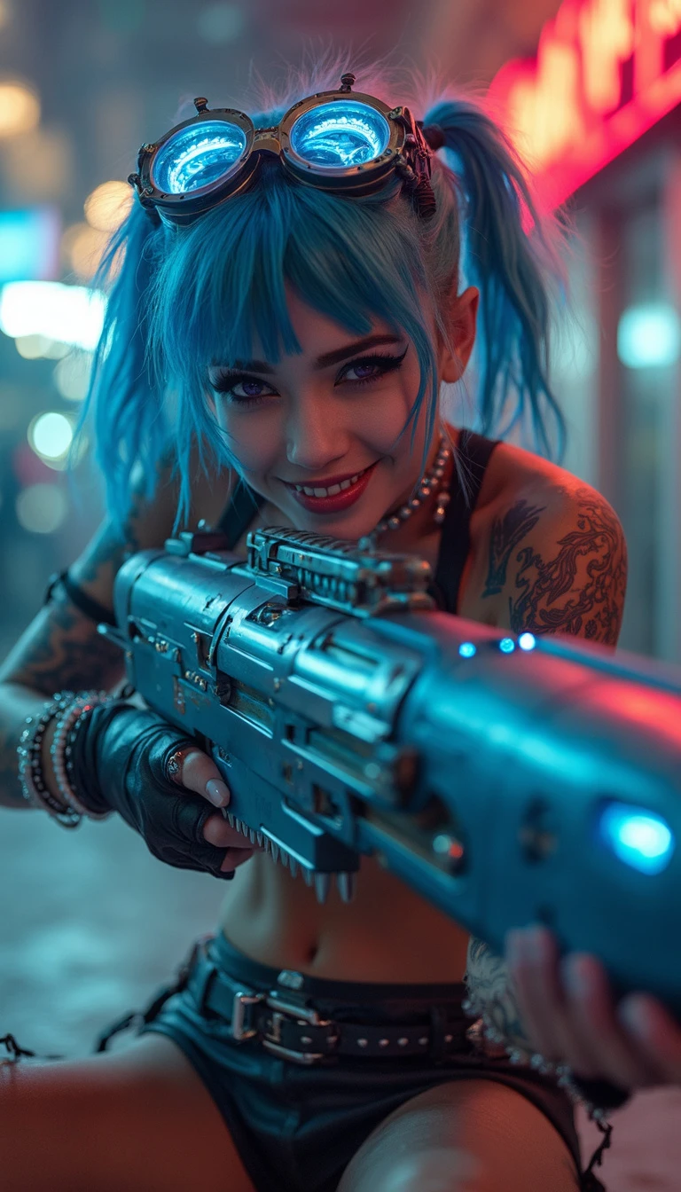Foto vintage, lomo, film, movie scene, 50mm Face: Shehas a sharp, mischievous expression with high, defined cheekbones and a wide, playful smile. Her skin is pale, giving her an almost otherworldly look in the neon-lit environment. Her eyes are a striking violet, with a gleam of chaotic energy, often highlighted by her signature, oversized goggles that glow with a faint electric blue light. Her eyebrows are arched and expressive, enhancing her energetic demeanor. Hair: Her hair is a wild, Blue double ponytails. It flows down in messy, voluminous waves, sometimes held back by her goggles, adding to her chaotic and dynamic presence. The hair is styled to look deliberately unkempt, reflecting her rebellious and unpredictable nature. Clothing: Outfit is a bold blend of punk rock and futuristic elements. She wears a cropped, leather. Her shorts are leather, ripped and distressed, revealing intricate patterns of tattoos on her skin. She accessorizes with a mix of belts, buckles, and spikes, contributing to her edgy, anarchic style. She also sports fingerless gloves and knee-high boots with metallic details. Weapon: Her weapon is a distinctive, shark-themed gun. It is a large, custom-built firearm resembling a shark, with a sleek, streamlined design and a dark, metallic finish. The gun’s body is adorned with fin-like protrusions and sharp angles, mimicking the aggressive look of a shark. It has glowing blue accents that pulse with energy, and the barrel ends in a menacing, tooth-like protrusion. The gun’s design incorporates both functionality and an intimidating aesthetic