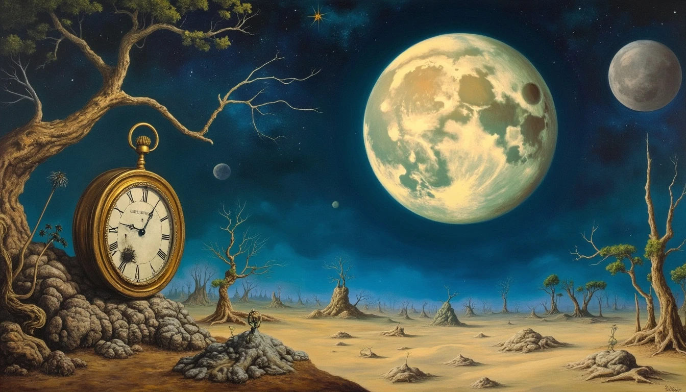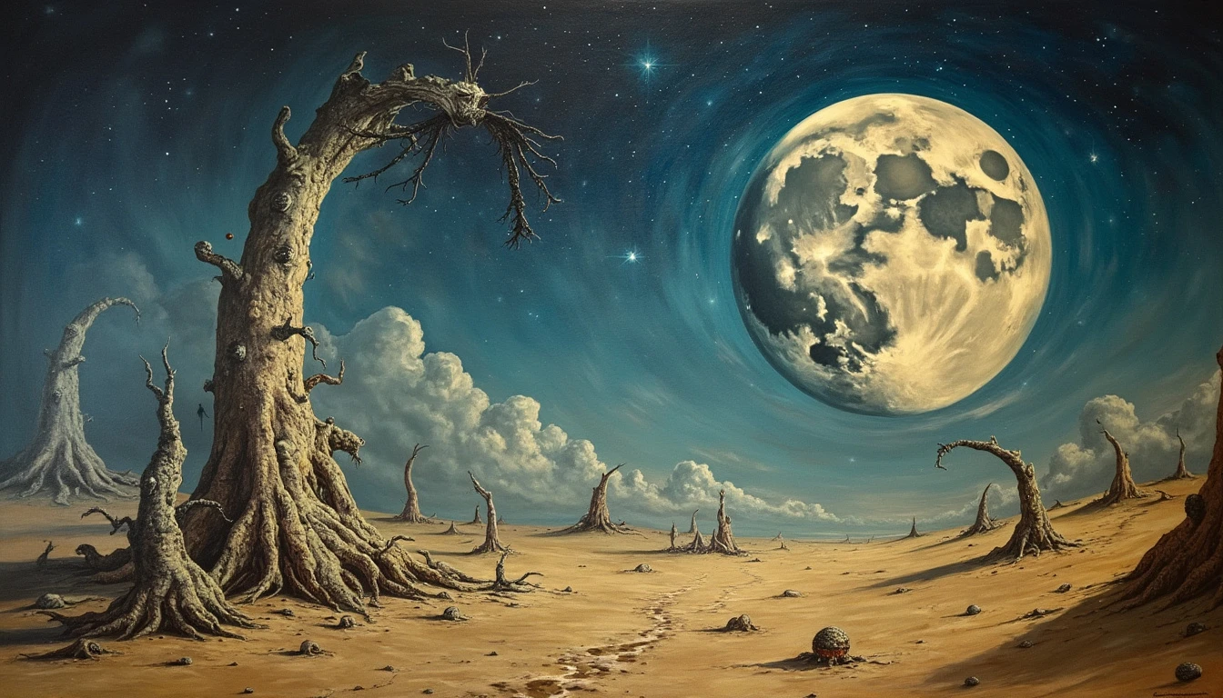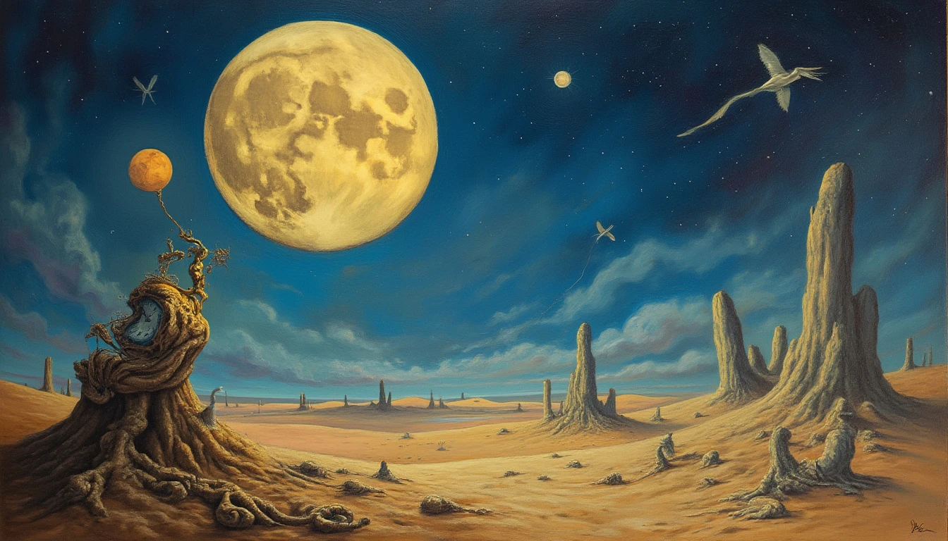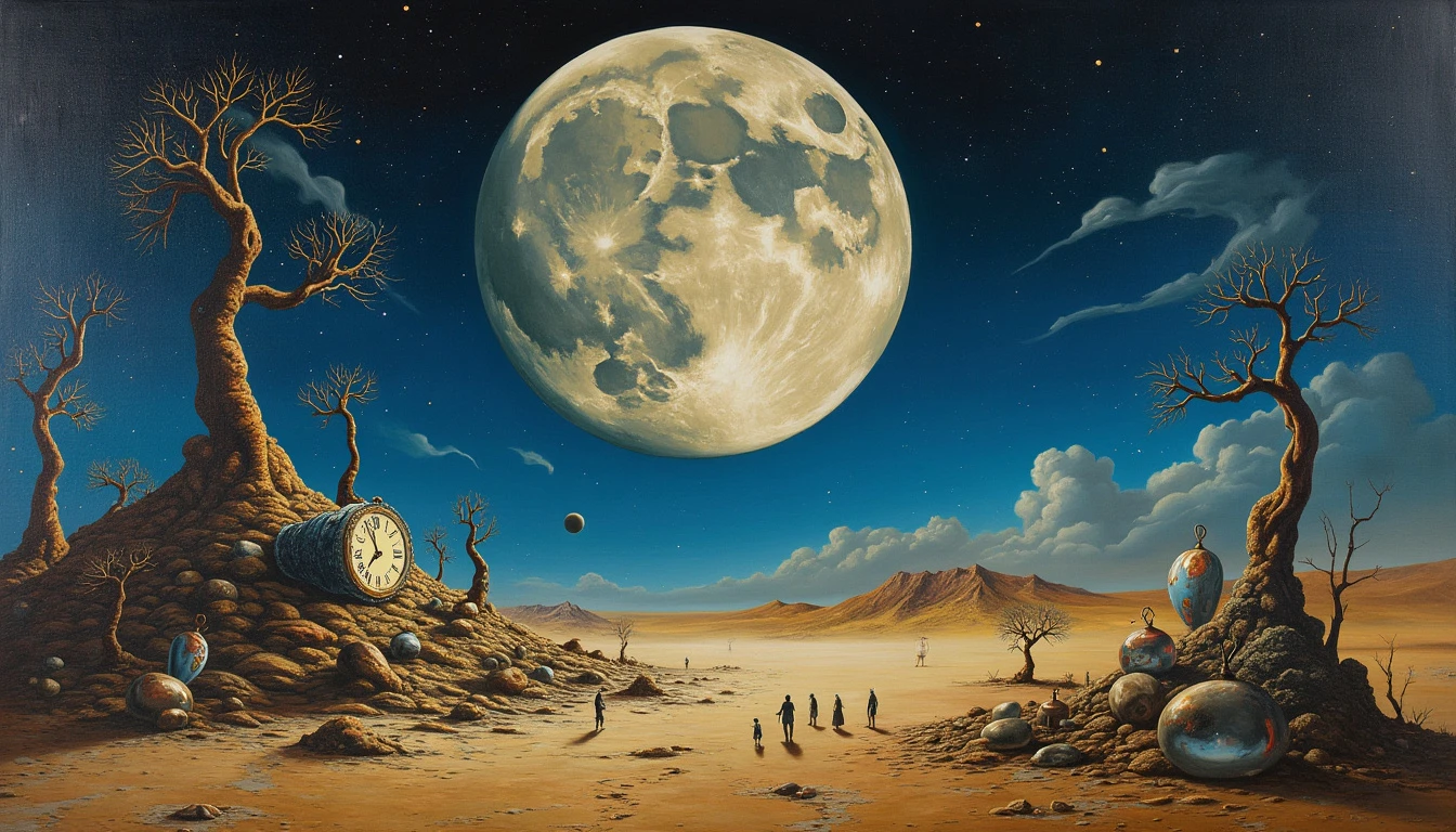 **The Moon, painted by Salvador Dalí**, in a surrealist style that merges dreamlike abstraction with meticulous detail. The painting features a large, luminous moon dominating the canvas, rendered in Dalí's signature hyper-realistic yet otherworldly manner. The moon's surface is depicted with intricate textures and shadows, creating a sense of depth and mystery. Its light casts a soft, ethereal glow across the scene, illuminating the surrounding surreal landscape. The **foreground** includes distorted, melting objects characteristic of Dalí's work: perhaps a twisted clock draped over a barren, rocky outcrop, and elongated shadows that stretch and warp in the moonlight. There may also be an unusual juxtaposition of familiar and bizarre elements, such as a desolate desert with scattered, distorted figures, blending seamlessly into the lunar light. **In the background**, the sky is a deep, swirling gradient of blues and purples, with stars rendered in a delicate, almost fragile manner, adding to the dreamlike quality. Dalí’s signature elongated, melting forms and distorted perspectives create an unsettling yet captivating atmosphere. The overall composition evokes a sense of eerie beauty and fantastical imagination, blending the boundaries between reality and dream. **Atmosphere**: The painting exudes an otherworldly, mystical ambiance, with a sense of timelessness and surreal intrigue, capturing Dalí’s unique approach to blending meticulous realism with dreamlike abstraction.