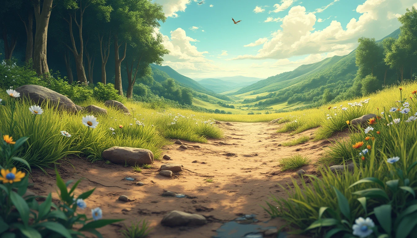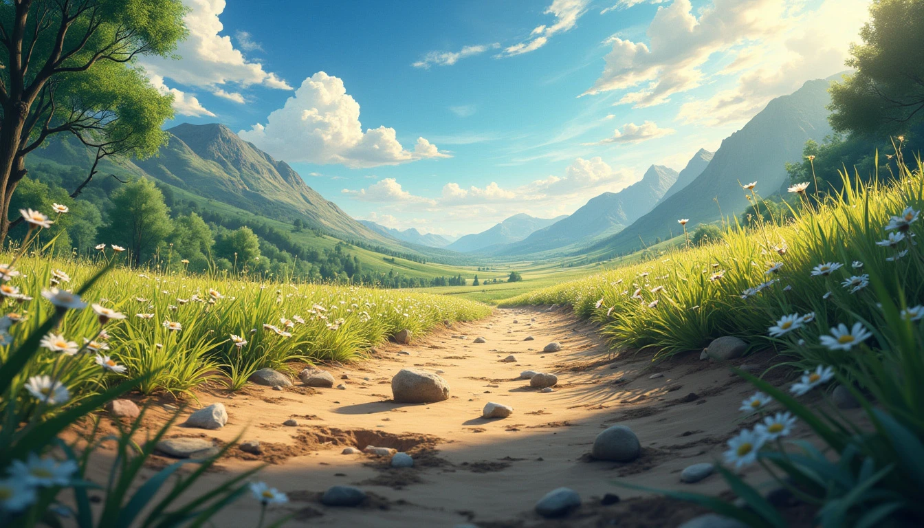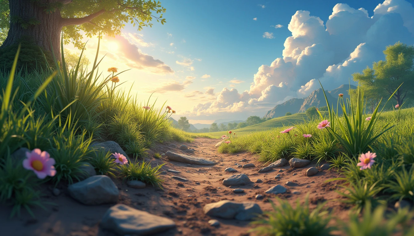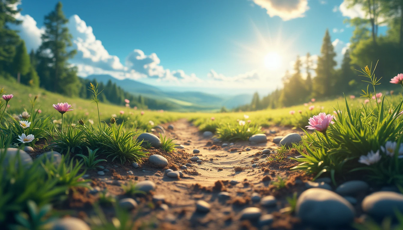 **First-Person View of Earth's Surface**, in a photorealistic style. The scene immerses you directly in the environment, providing a detailed, lifelike perspective as if you are standing on the ground. **Foreground Details**: From your vantage point, the surface is rich with textures and details. You see individual blades of grass, pebbles, and patches of dirt. Nearby, there might be flowers or small plants, each with intricate details visible up close. The texture of the ground, whether it’s grass, sand, or rocky terrain, is rendered with high precision, capturing every nuance. **Surrounding Environment**: Looking around, you observe the immediate surroundings with a 360-degree view. If you are in a forest, you see towering trees with detailed bark and leaves, dappled sunlight filtering through the canopy. In an open field, the vast expanse of grass or crops stretches out, with distant hills or mountains visible on the horizon. **Sky and Atmosphere**: The sky is visible above, rendered in realistic colors that change according to the time of day. During the day, it might be a clear blue with scattered clouds, while at dusk or dawn, it shows a gradient of warm colors. The atmosphere reflects the time of day and weather conditions, with realistic cloud formations and sunlight effects. **Lighting and Shadows**: The lighting interacts naturally with the environment. Shadows are cast accurately according to the position of the sun, creating realistic contrasts between light and shadow. If you’re in a shaded area, you see soft, diffused light; in direct sunlight, the light is bright and sharp, highlighting the textures of the ground. **Overall Experience**: The photorealistic depiction offers an immersive, first-person experience, capturing the detailed textures and colors of Earth’s surface, from the close-up details at your feet to the expansive view of the surroundings. The scene provides a lifelike, engaging view of the environment as if you are physically present.