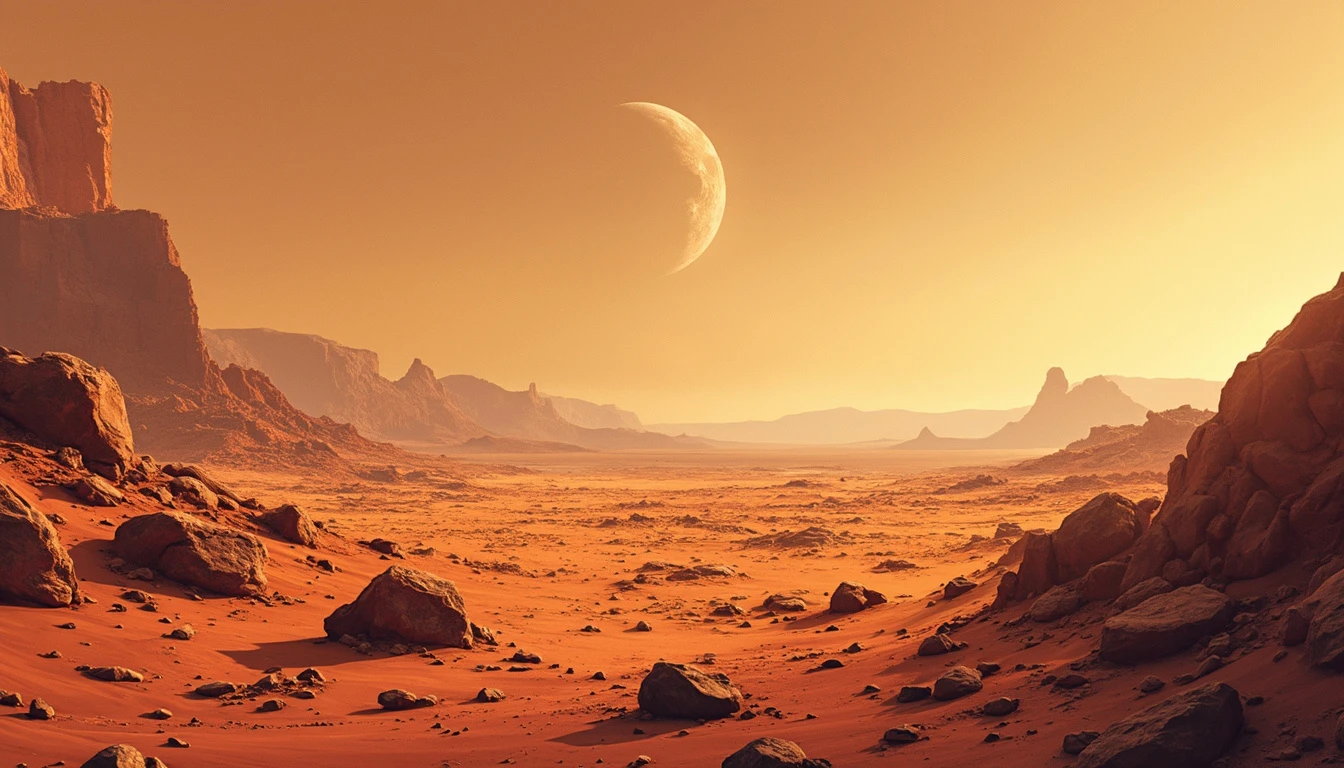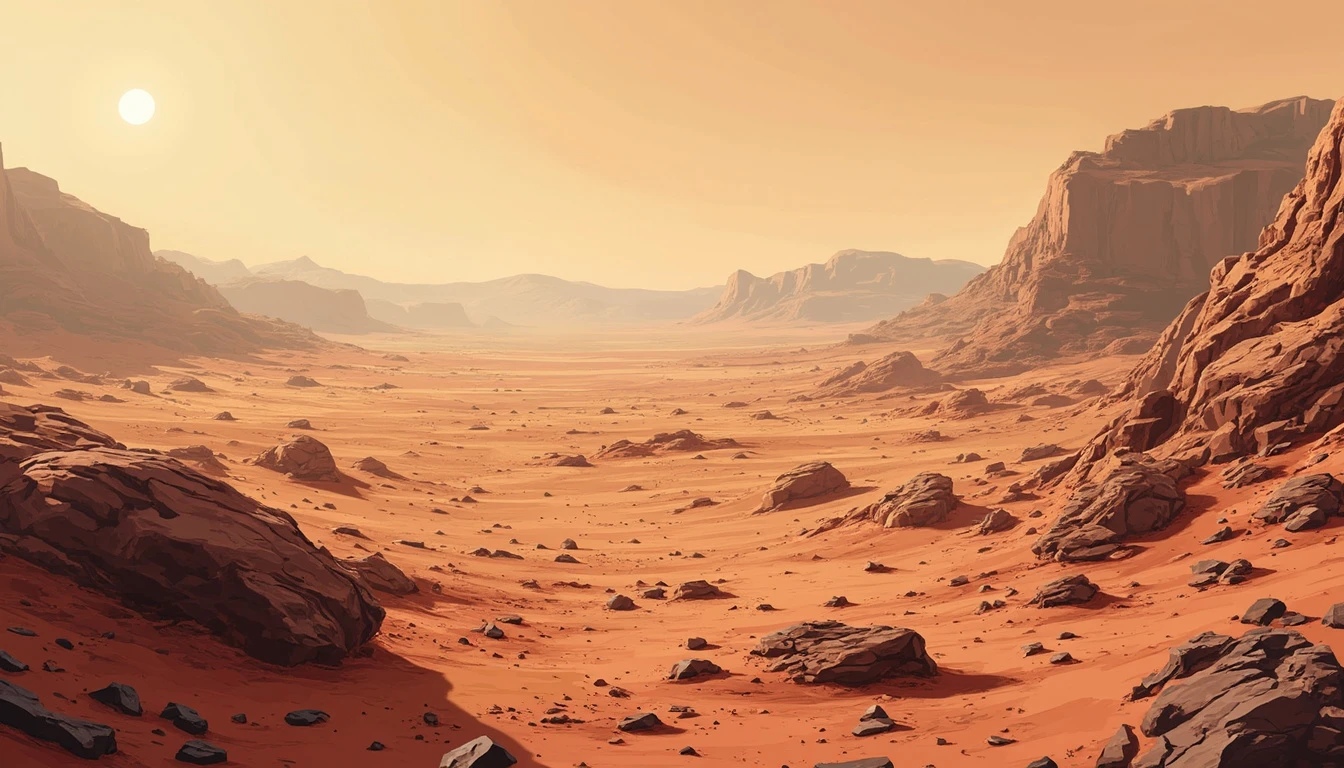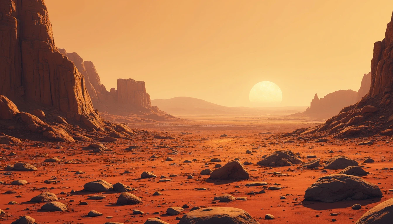 **First-Person View of Mars' Surface**, in a photorealistic style. This perspective immerses you directly on the Red Planet, capturing its distinctive landscape with high detail. **Foreground Details**: From your viewpoint, the Martian surface is covered in a reddish, dusty terrain with a mix of rocky outcrops and loose soil. You see a variety of textures, including fine sand, pebbles, and larger boulders scattered around. The ground shows signs of erosion and past volcanic activity, with cratered patches and uneven features. **Surrounding Environment**: Looking around, you observe a vast, barren landscape stretching out in all directions. The horizon is dotted with distant, rugged mountain ranges and large canyons. The surface has a reddish-brown hue, characteristic of Mars, with subtle variations in color and texture. Occasionally, you might see patches of darker basaltic rock or lighter, dust-covered areas. **Sky and Atmosphere**: The sky is a pale, dusty orange, with a thin, sparse atmosphere that gives a hazy, diffused appearance to the sunlight. The sky is mostly clear, with a few wispy clouds or dust storms visible in the distance. The sunlight is bright but less intense than on Earth, casting a warm, reddish glow over the landscape. **Lighting and Shadows**: The lighting is relatively even, with soft shadows cast by the uneven terrain. The sun, appearing smaller than it does on Earth, provides a warm, reddish light that enhances the planet’s characteristic color. Shadows are subtle but add depth to the craters and rock formations. **Overall Experience**: The photorealistic view provides a detailed and immersive perspective of Mars’ surface, showcasing its dusty, rocky terrain and the distinctive reddish hue of the planet. The scene captures the barren, yet captivating environment, offering a lifelike representation of one of the most explored planets in our solar system.