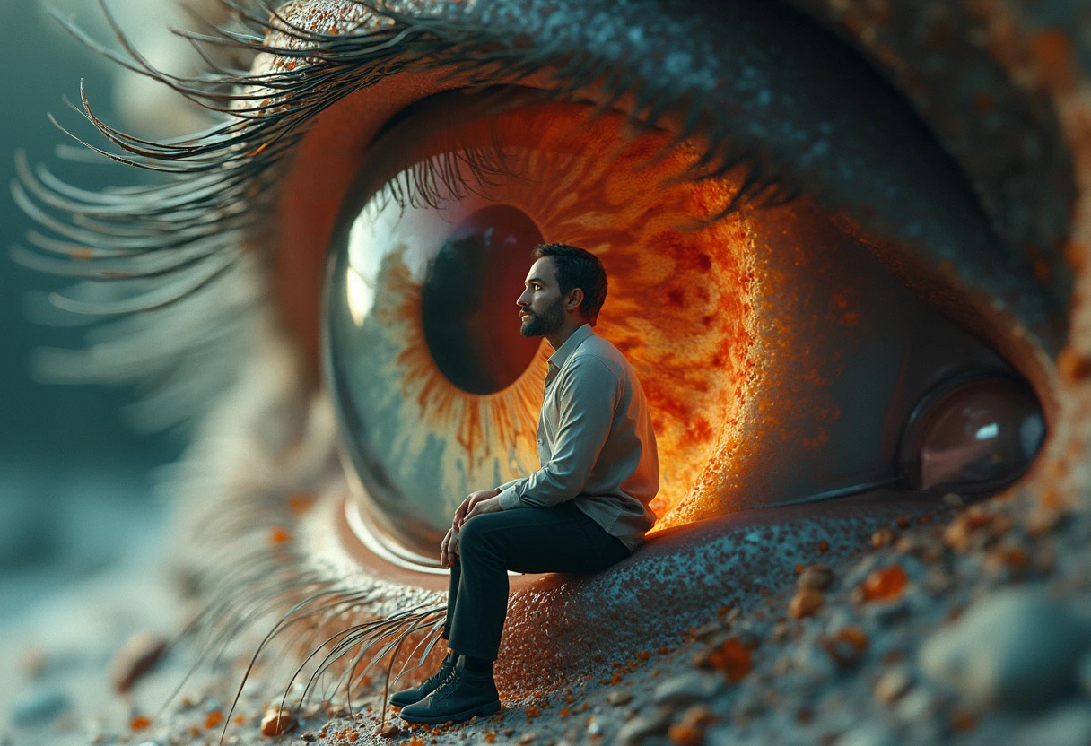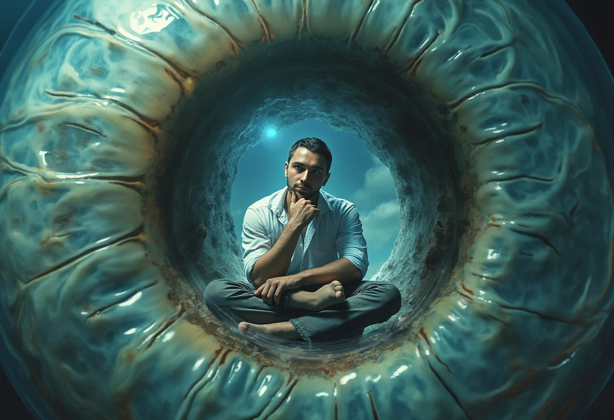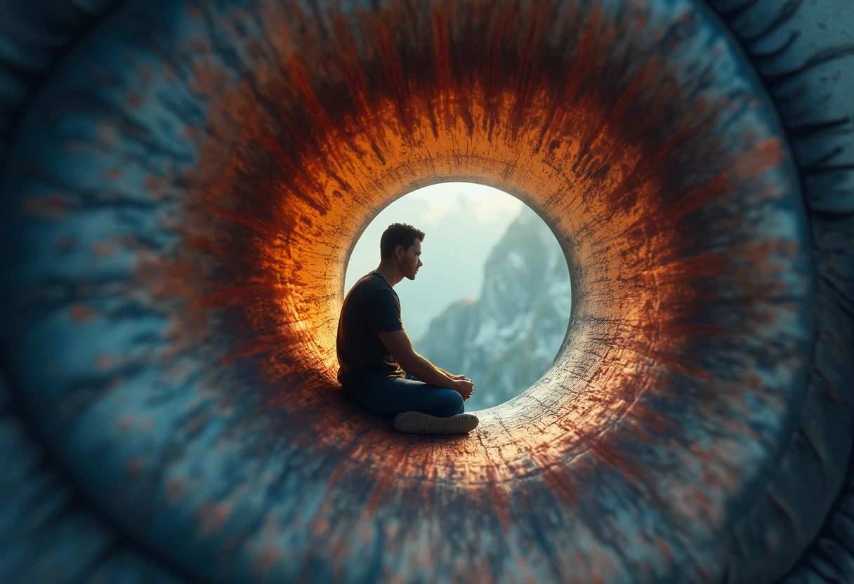 **Photorealistic Scene of a Contemplative Man Sitting Inside a Human Eye**. In this surreal and detailed visualization, a man sits cross-legged in deep thought within the interior of a human eye. The eye’s iris and sclera surround him, rendered with intricate textures and colors. The iris displays rich patterns and gradients, while the lens offers a semi-transparent view of the external world. The scene is softly illuminated from within the eye, casting gentle, diffuse light that highlights the man’s features and the eye’s details. Shadows are subtle but enhance the depth and realism, creating a striking and imaginative depiction of introspection within a biologically significant setting.