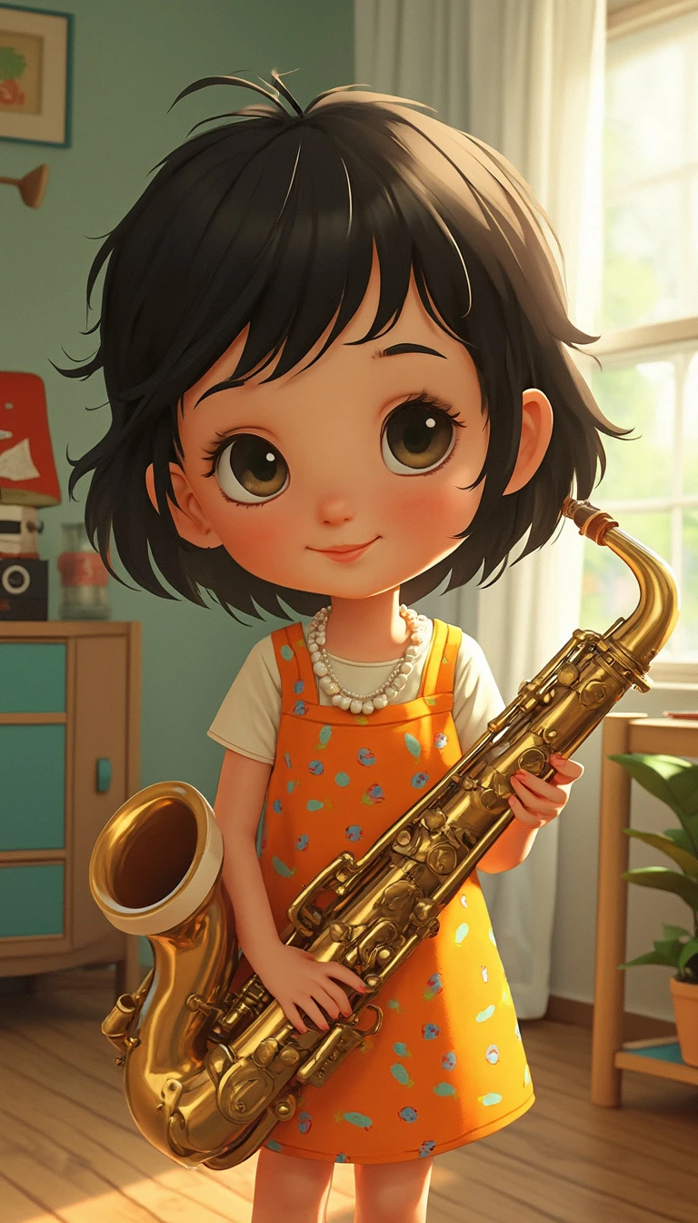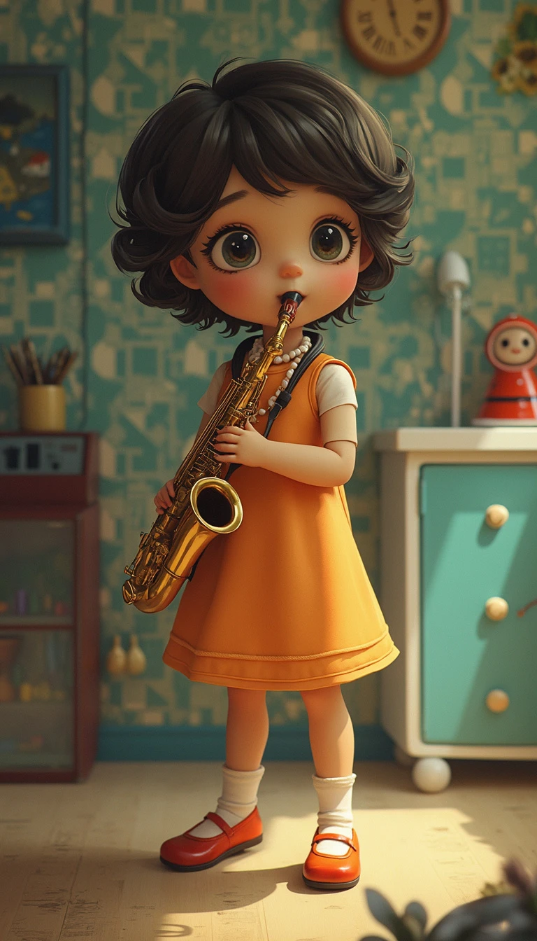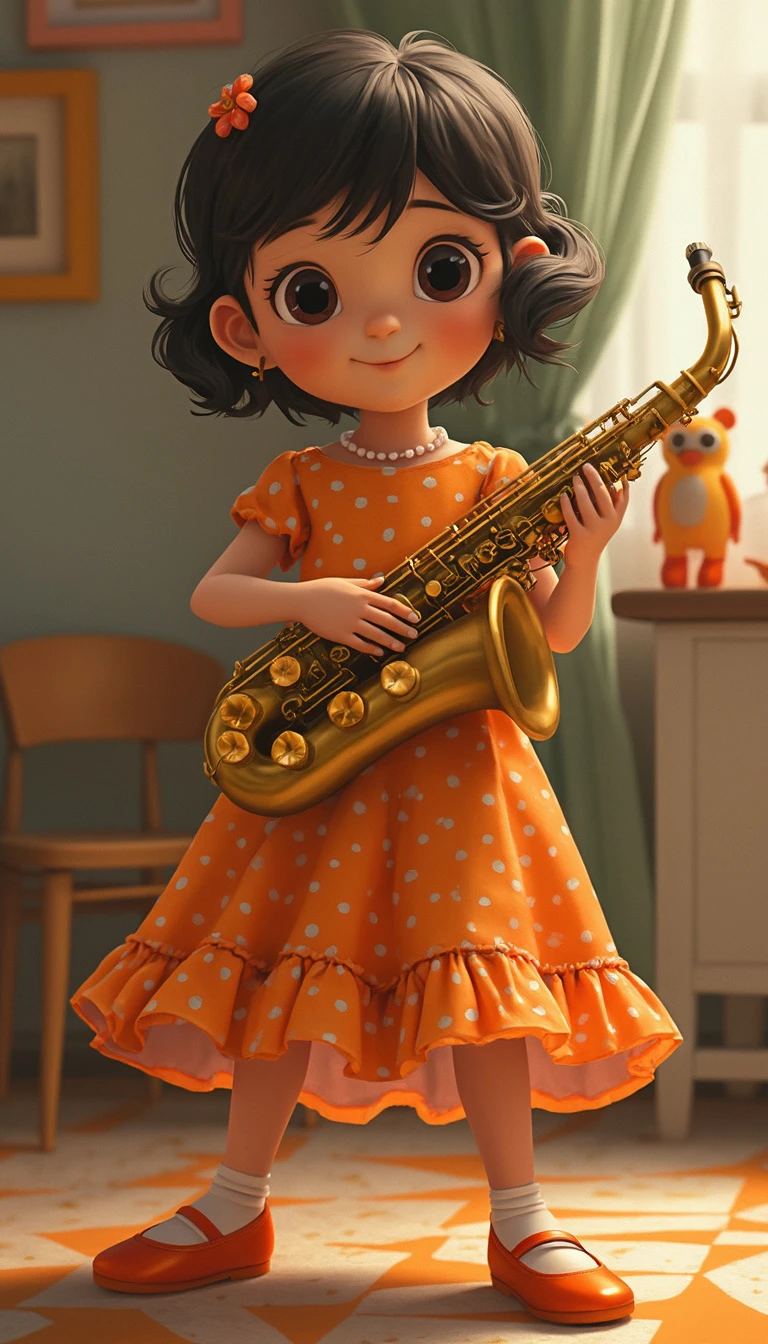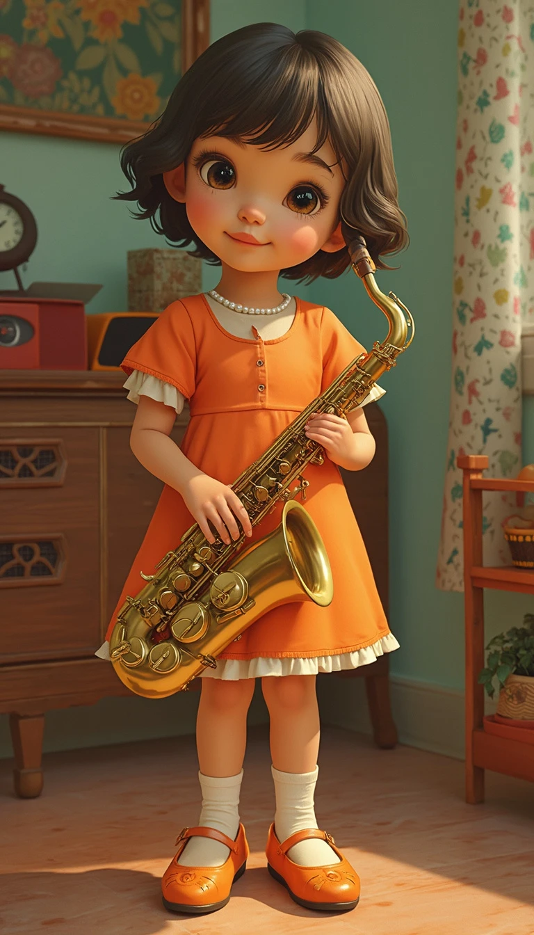 **Photorealistic 1980s-Style Portrait of a Young Girl** A young girl around 8 years old with a round face and expressive features, captured in a nostalgic, warm setting. Her skin tone is realistic and natural, with a youthful glow. Her large, bright eyes and a short, spiky hairstyle She wears a vibrant orange dress with a playful 1980s design,. Complementing her dress, she wears a white pearl necklace and matching orange ballet flats. She is holding a saxophone, highlighting her musical interest. The background features a typical 1980s domestic setting with bright colors, geometric patterns, and vintage furnishings like a retro toy or patterned wallpaper.