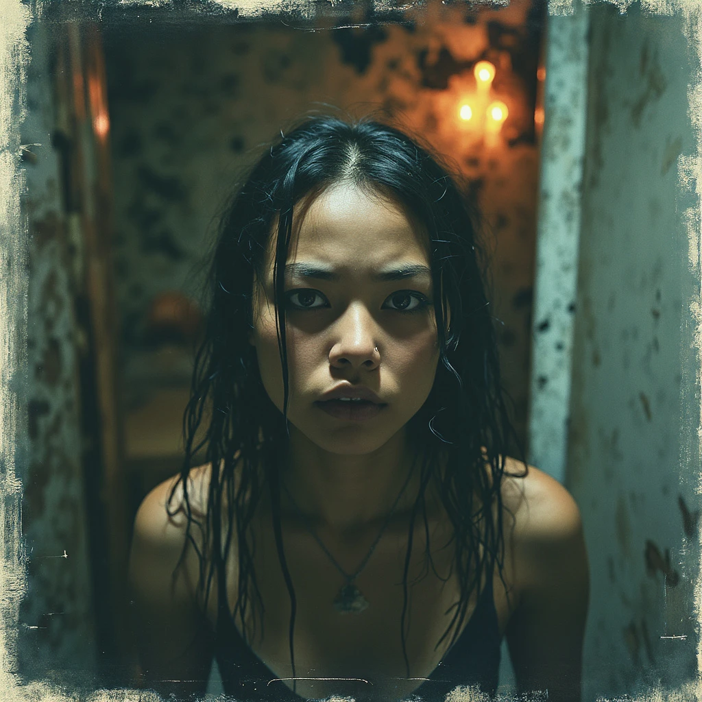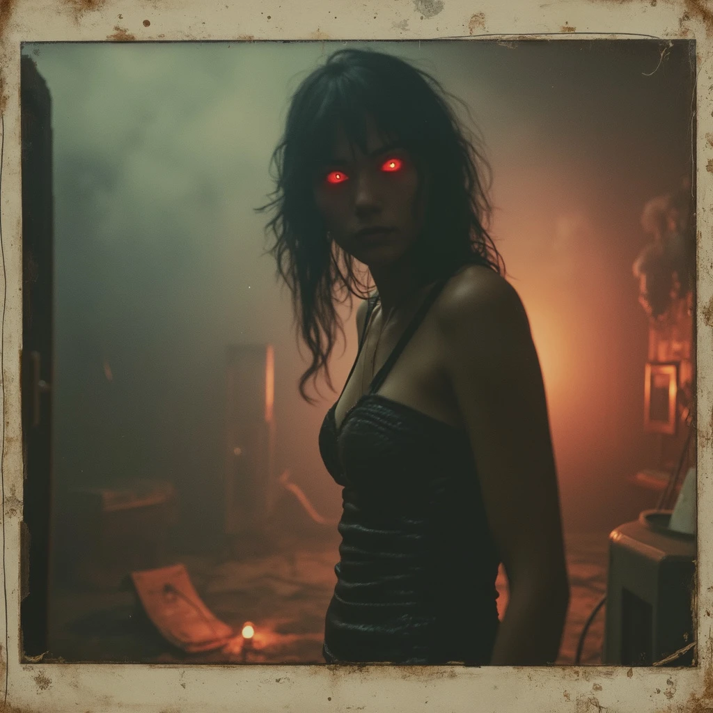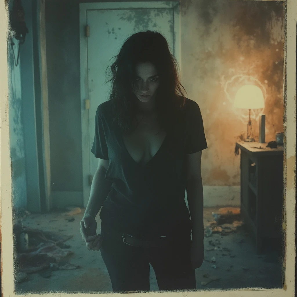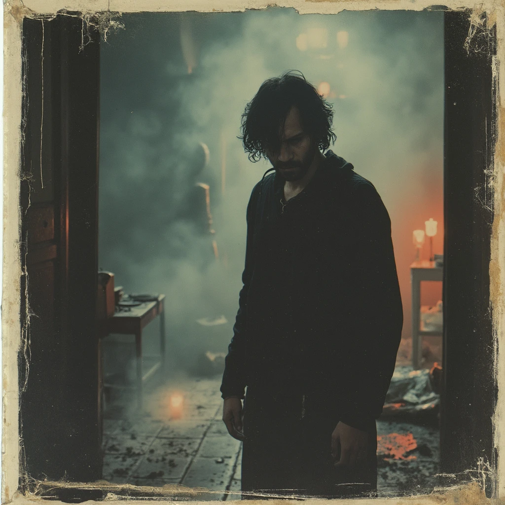 **Blurry polaroid photo of a dark, intense scene: a figure stands with a conflicted expression, as if grappling with hidden rage and betrayal. The setting has a brooding atmosphere, with shadows and dark hues emphasizing a sense of inner turmoil. The background features dimly lit, chaotic elements, representing the struggle between temptation and redemption. The figure's eyes reflect a piercing intensity, suggesting a battle with their own inner demons. The overall mood is one of confrontation and self-realization, capturing the essence of the lyrics' themes of regret and self-discovery.**