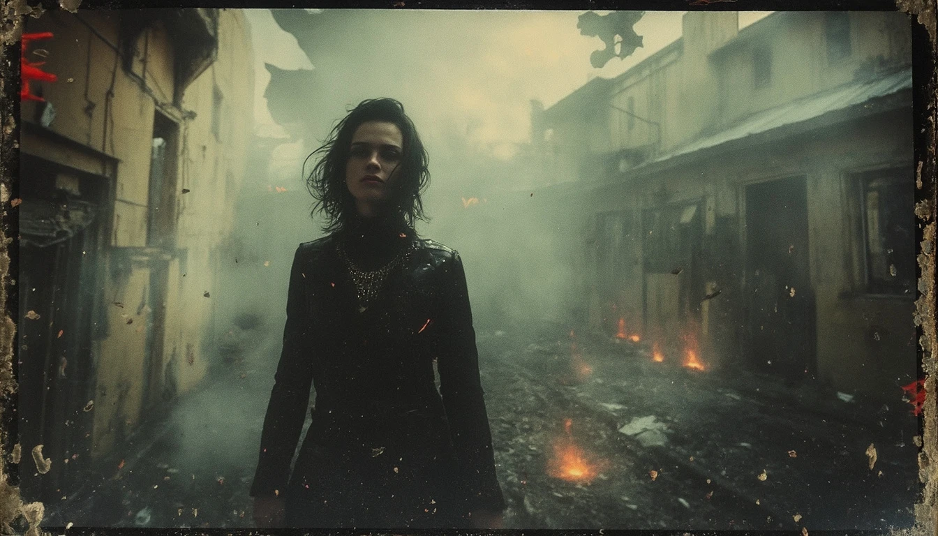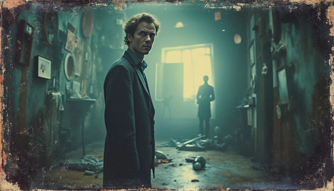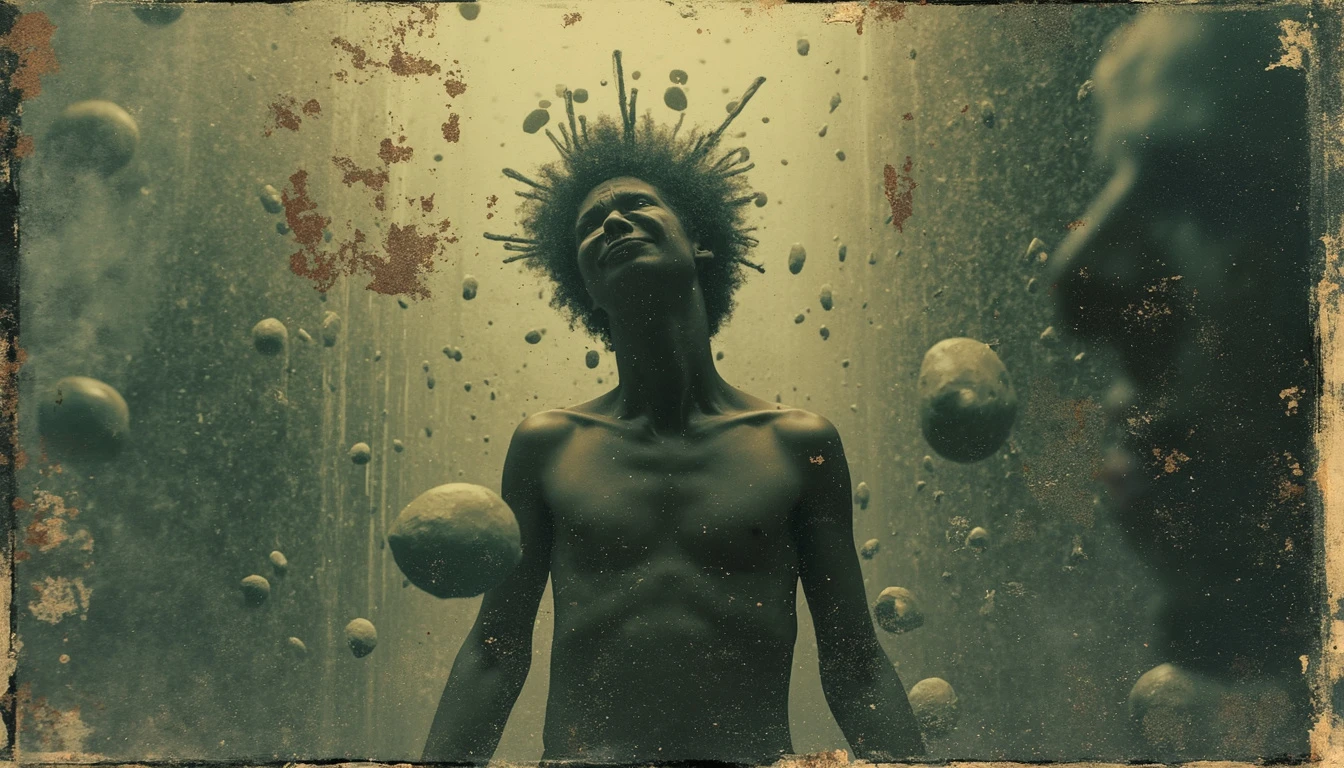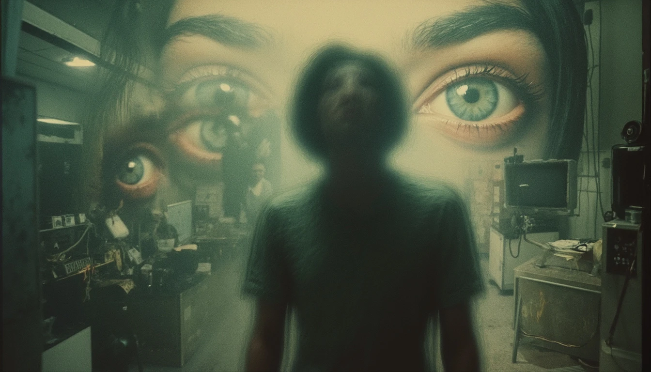 **Blurry polaroid photo of a chaotic scene: a person with a distressed expression, standing in a surreal, distorted environment that represents internal conflict and madness. The background features fragmented elements and disorienting perspectives, symbolizing confusion and a sense of disconnection. The setting includes abstract references to Marlon Brando’s eyes, adding a layer of cinematic and symbolic depth. The color palette is dark and gritty, enhancing the intense emotional tone of the lyrics.**