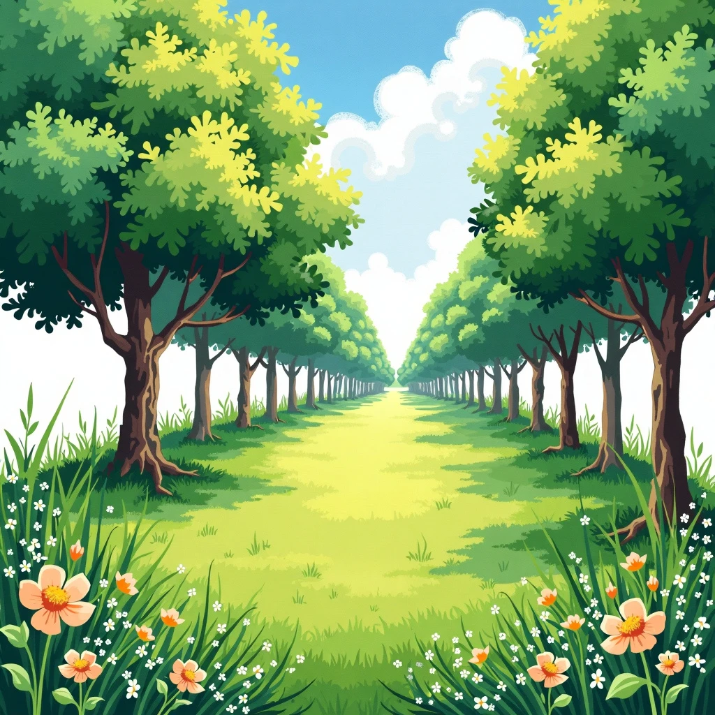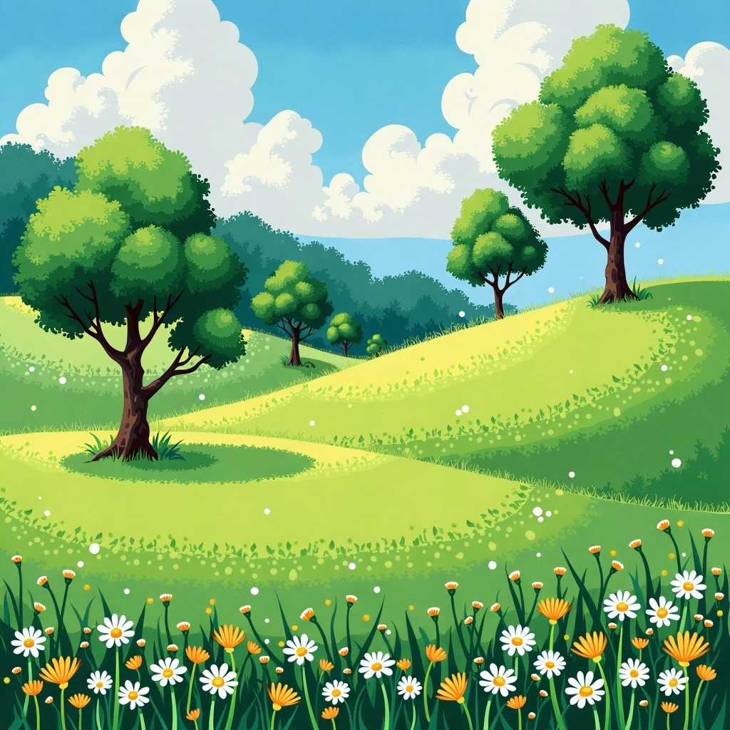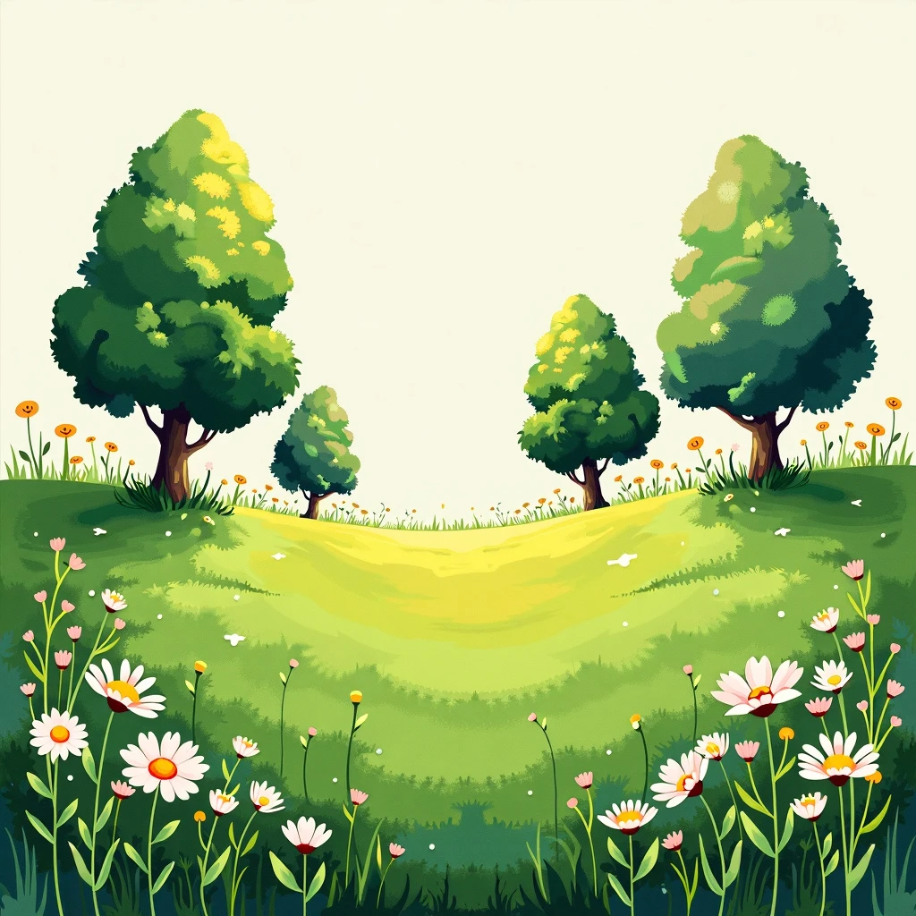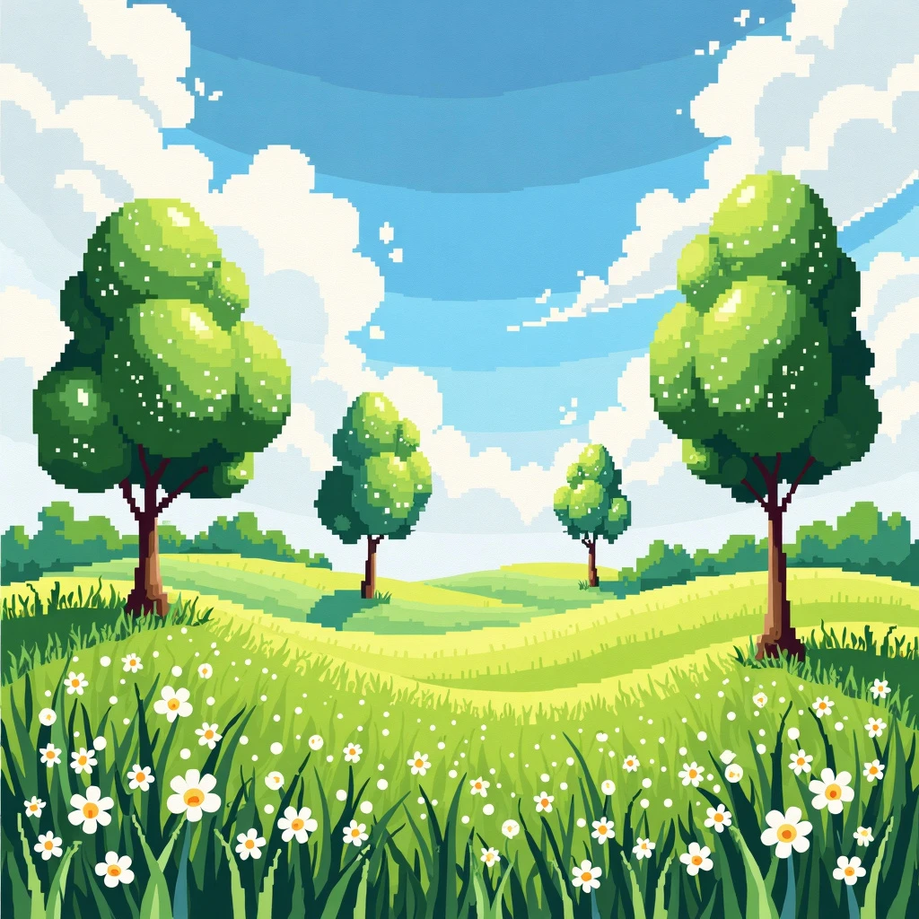 A mixed media art. It is a lawn picture. Grass in the medium of watercolor. Few trees in the style of pixel art. Tiny flowers in the style of impasto.