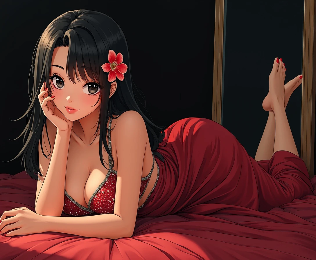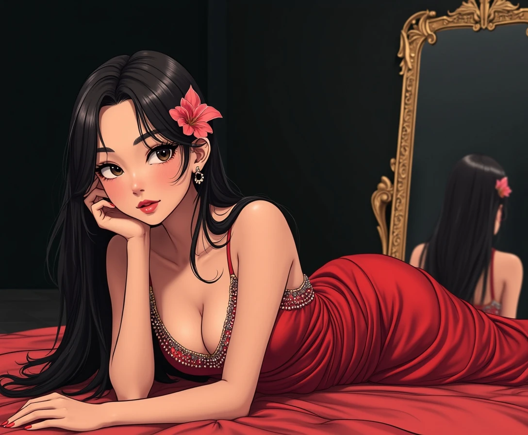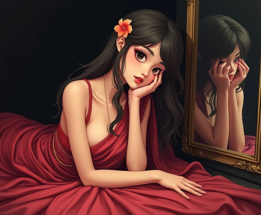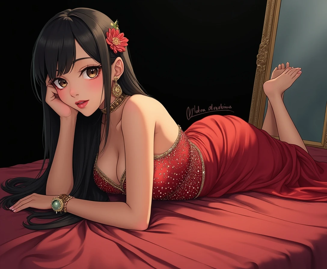 in a medium, eye-level shot, a fair-skinned woman with long dark hair lies on her stomach, her gaze directed at the camera. she's dressed in a red saree, adorned with sequins and a plunging neckline. a flower is pinned to her left ear, adding a touch of whimsy to her appearance. the woman's left hand rests on her stomach, while her right hand delicately touches her face. her gaze is directed at the camera, her lips slightly parted, adding a touch of intrigue to her expression. the saree's texture is rough, contrasting with the soft sheen of the fabric beneath her. the backdrop is a stark black, providing a stark contrast to the woman's attire. to the right of the frame, a mirror reflects the woman's reflection, adding depth to the composition.