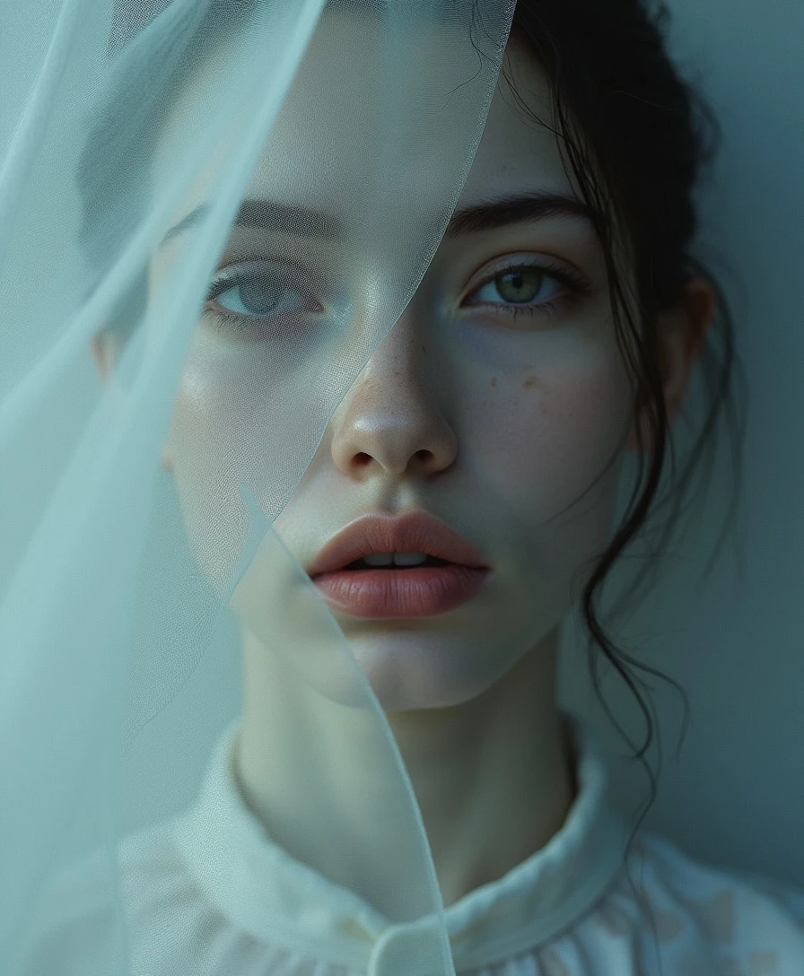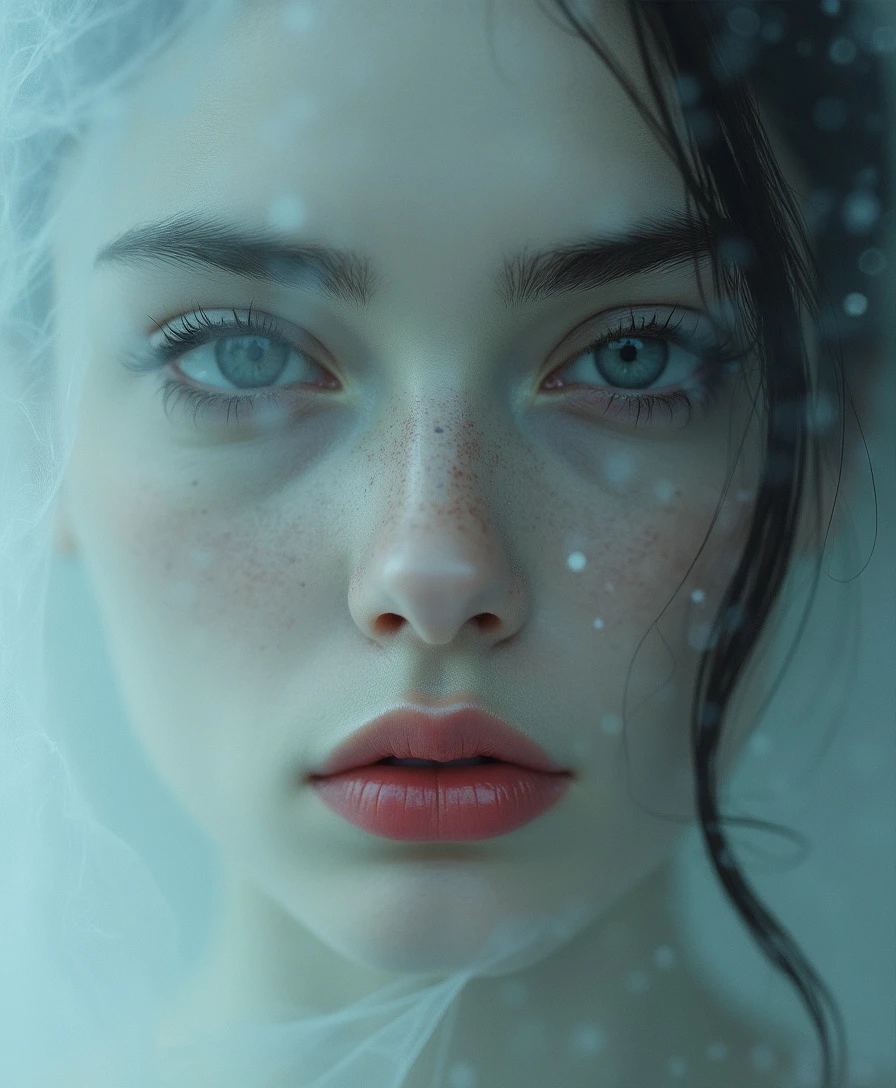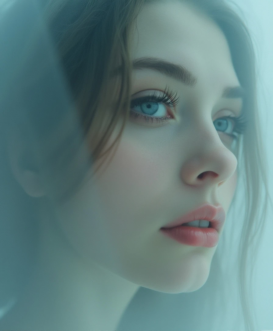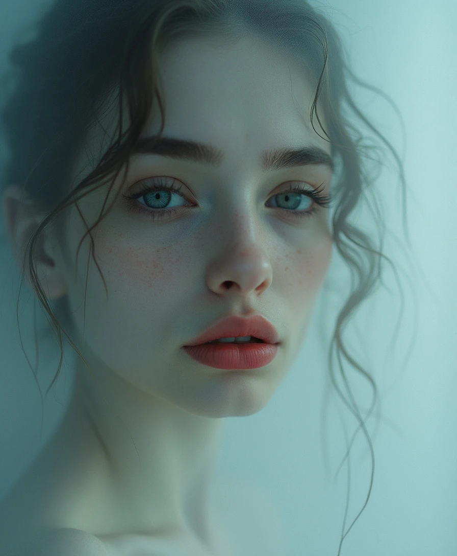A captivating minimalist portrait of a melancholic and alluring woman. The left half of her face is visible, with her delicate features seamlessly merging into a blurry sand glass canvas of bluish white. Her soft, bright lips contrast against the monochromatic background, drawing the viewer's attention. Her eyes hold a subtle, sad and mysterious expression that exudes both haunting and lonliness vibes. The simplicity of the composition, with its stark contrast, evokes a sense of ethereal beauty. by Sasan