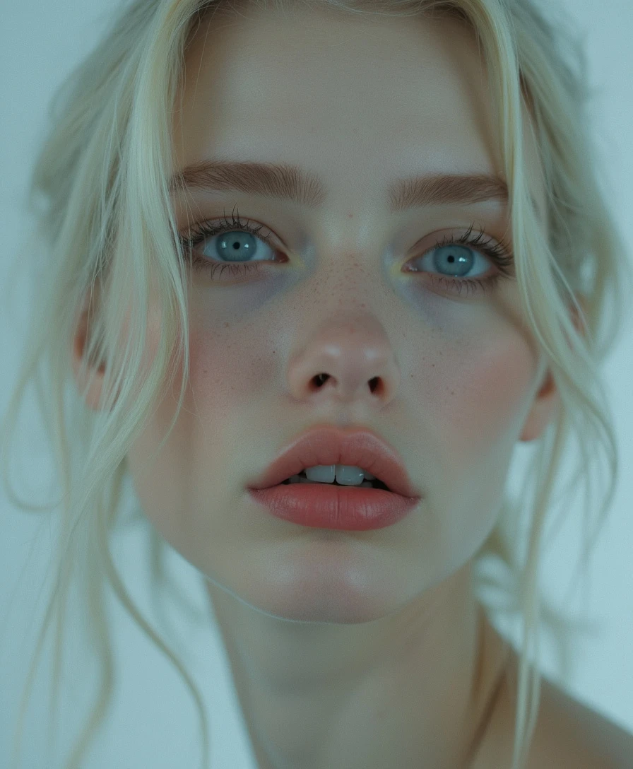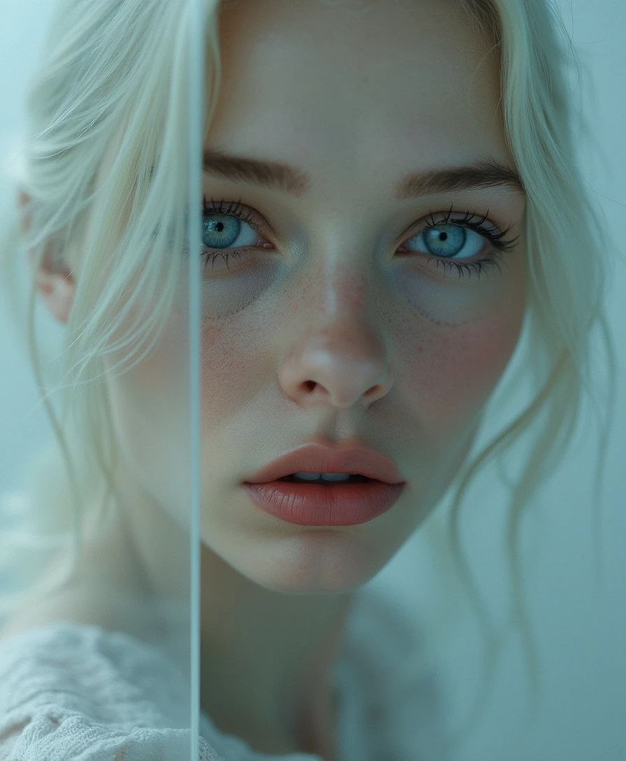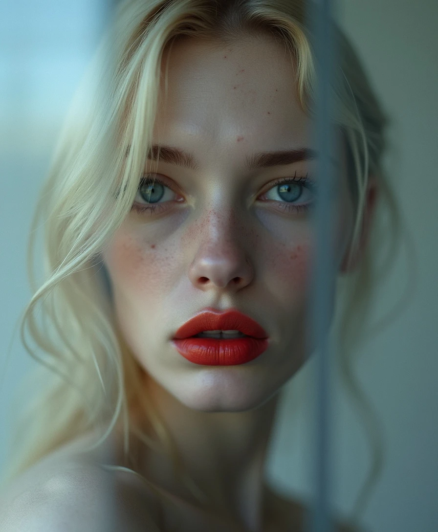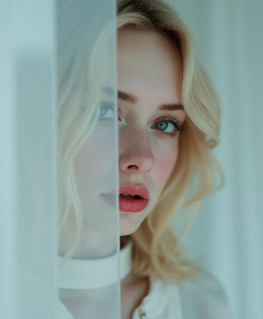 A captivating minimalist portrait of a melancholic and alluring blond woman. The left half of her face is visible, with her delicate features seamlessly merging behind a blurry glass canvas of bluish white. Her soft, bright lips contrast against the monochromatic background, drawing the viewer's attention. Her eyes hold a subtle, sad and mysterious expression that exudes both haunting and loneliness vibes. The simplicity of the composition, with its stark contrast, evokes a sense of ethereal beauty.