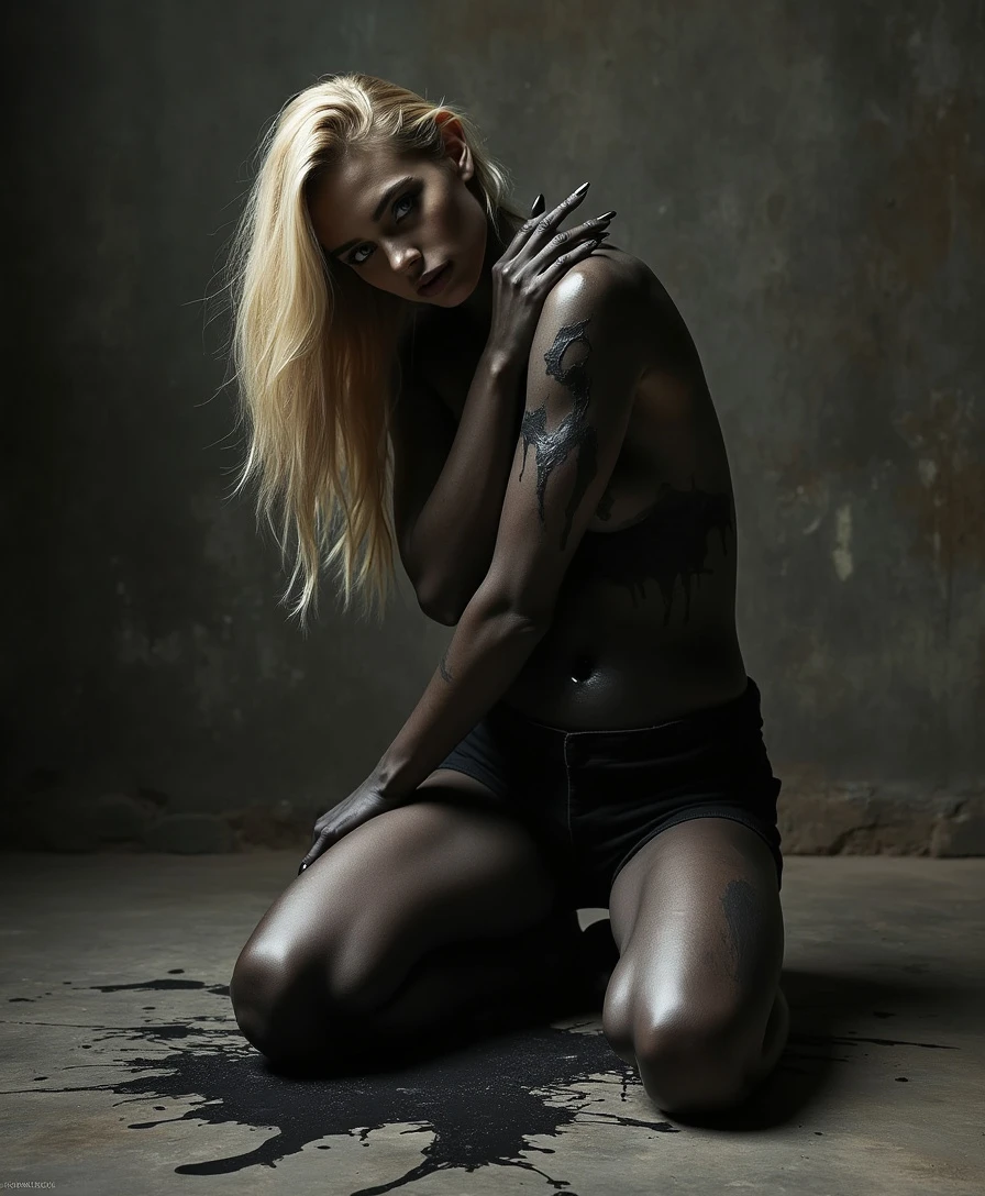 The black paint is covering her body. She is the blond perfection itself, body, like a live sculpture, in a dramatic, yet artistic pose, kneeling on the floor, hiding her body, while the hard shadows concealing details, the light highlights her strengths. The background is textured and very dark. Photorealistic. Very detailed. Art gallery work. Award winning photograph.