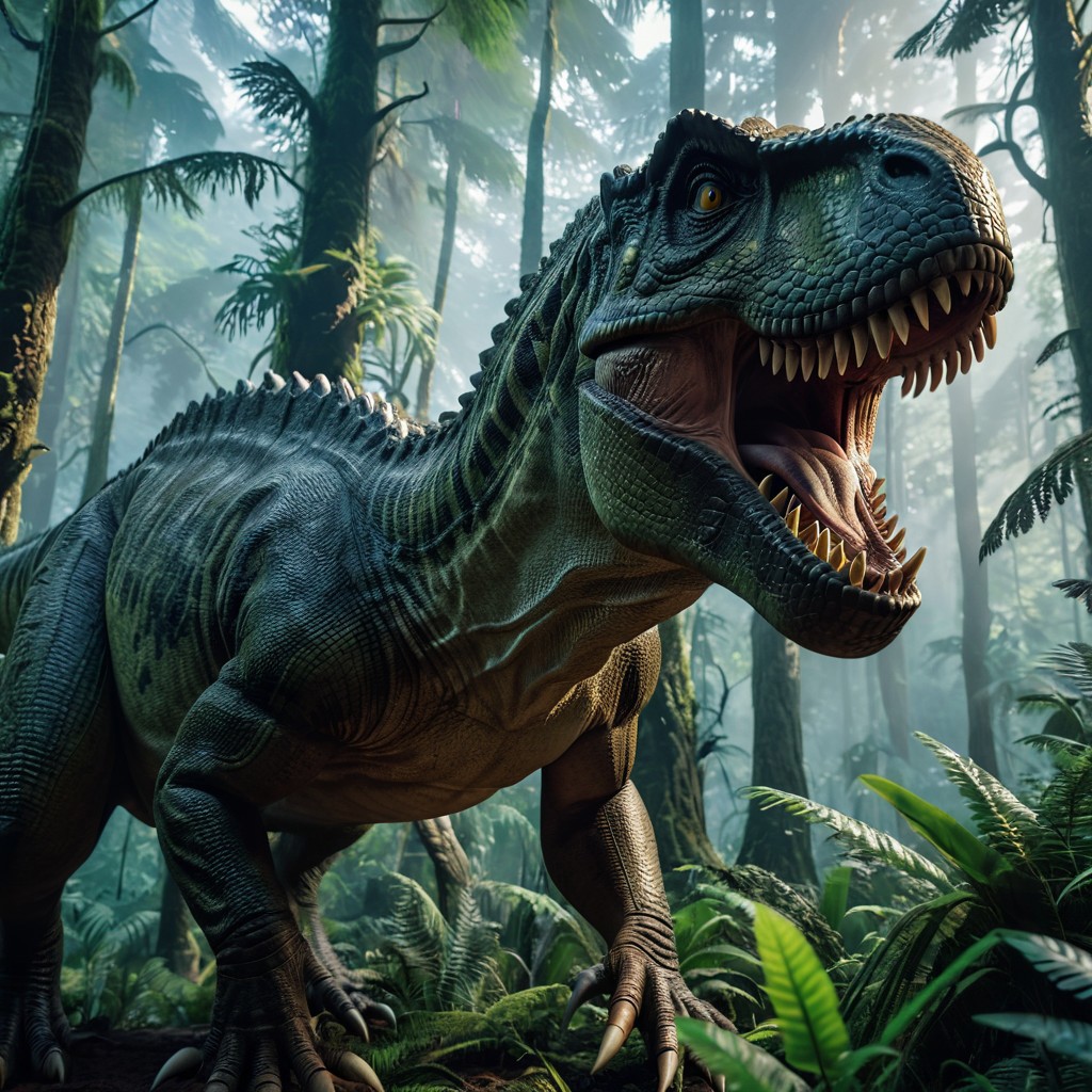 A big T-Rex in a prehistoric forest, ultra detailed, intrincate details, roaring, threatening, ultrarealistic, best quality, cinematic lighting, masterpiece, epic, 8k