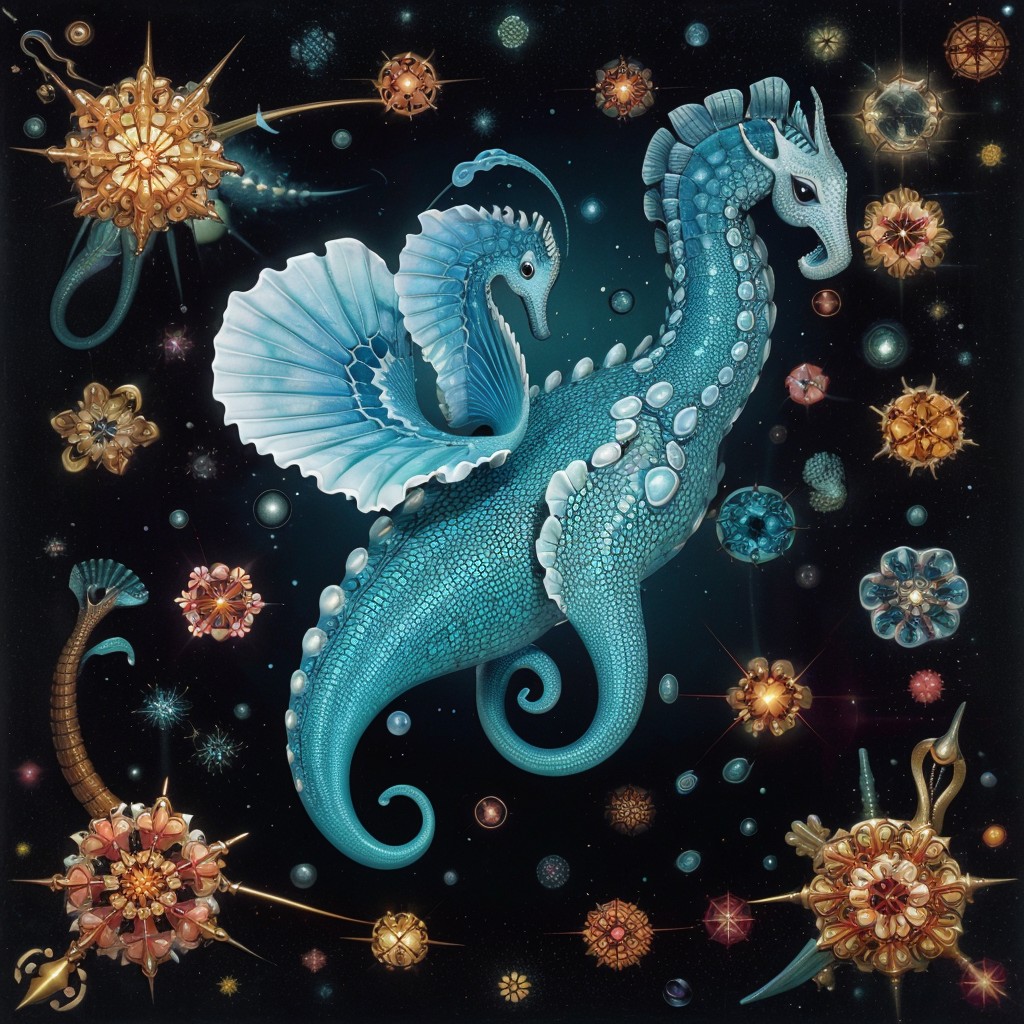 (masterpiece, top quality, best quality, official art, beautiful and aesthetic:1.2), neonpophaeckel, a seahorse and plankton, black background (no humans:2) <lora:Neon Pop Haeckel:1.0>
