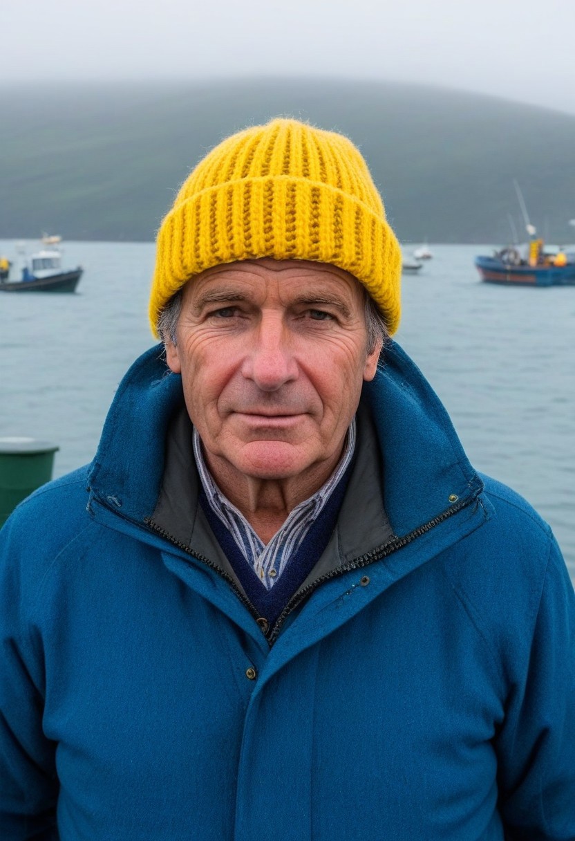 A fisherman with the face skin with subtles wrinkles, due to the weather, blue woolen cap, and yellow jacket, with boats in the background