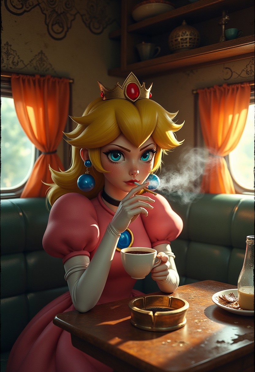 photorealist, amateur polaroid photo,1girl,peach from mario bros videogame, pink dress, collar, drinking coffee and smoking cigarette, (full ashtray:1.2), inside an old filthy caravan , looking at viewer, orange curtains, messy hair, grumpy face, intricate interior caravan details, rusty small crown on shelf