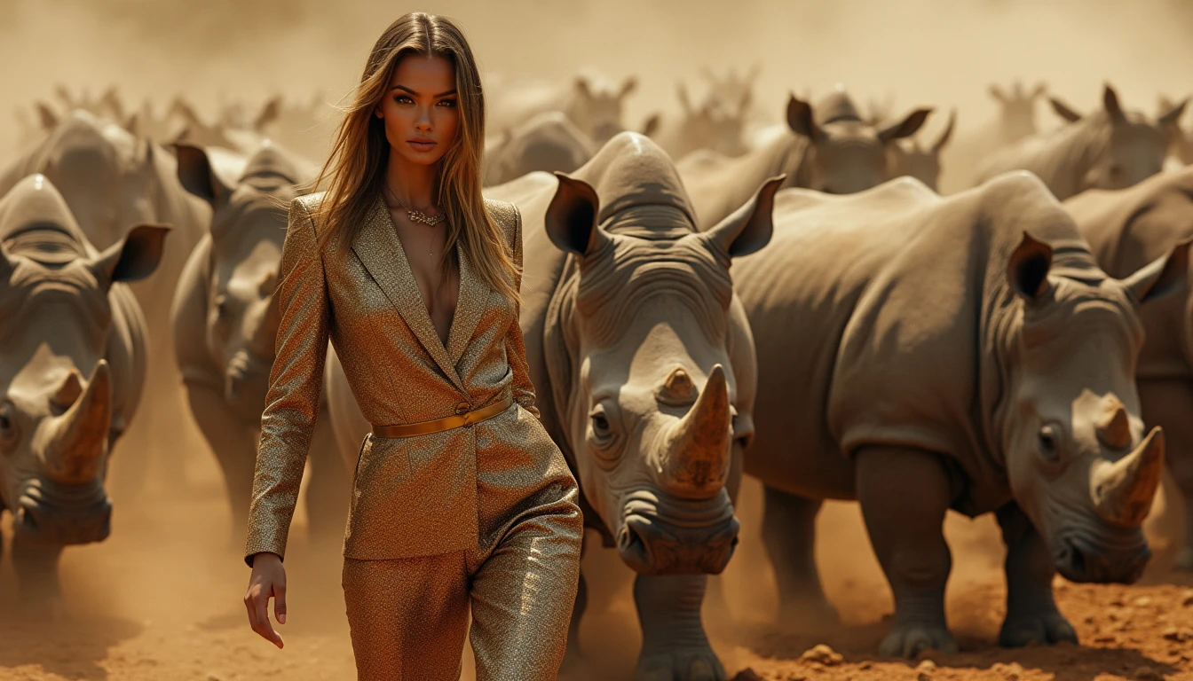A top model amidst a stampeding herd of rhinoceroses. Hyperrealistic skin with visible texture and pores. Creative, arrogant poses, aesthetically and artistically original and striking, in the style of a Vogue editorial. The scene captures the raw energy of the stampede, with dust and movement in the air. The model’s luxurious, high-fashion outfit contrasts with the wild environment. Impeccable makeup, styling, and hairstyling by the world’s top artists.