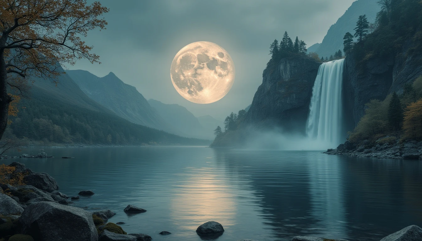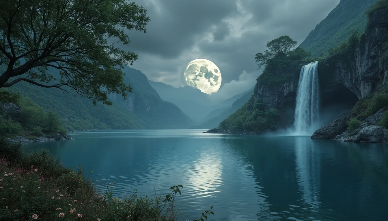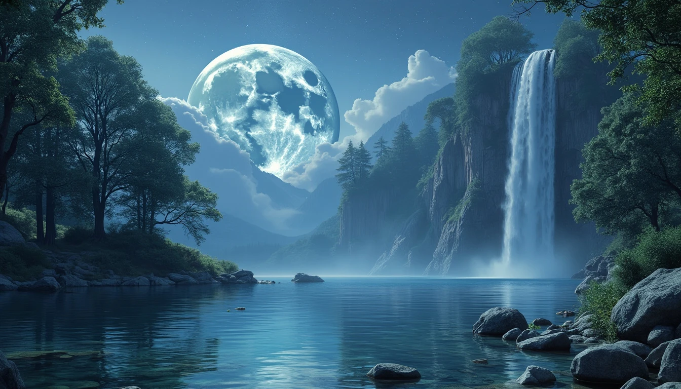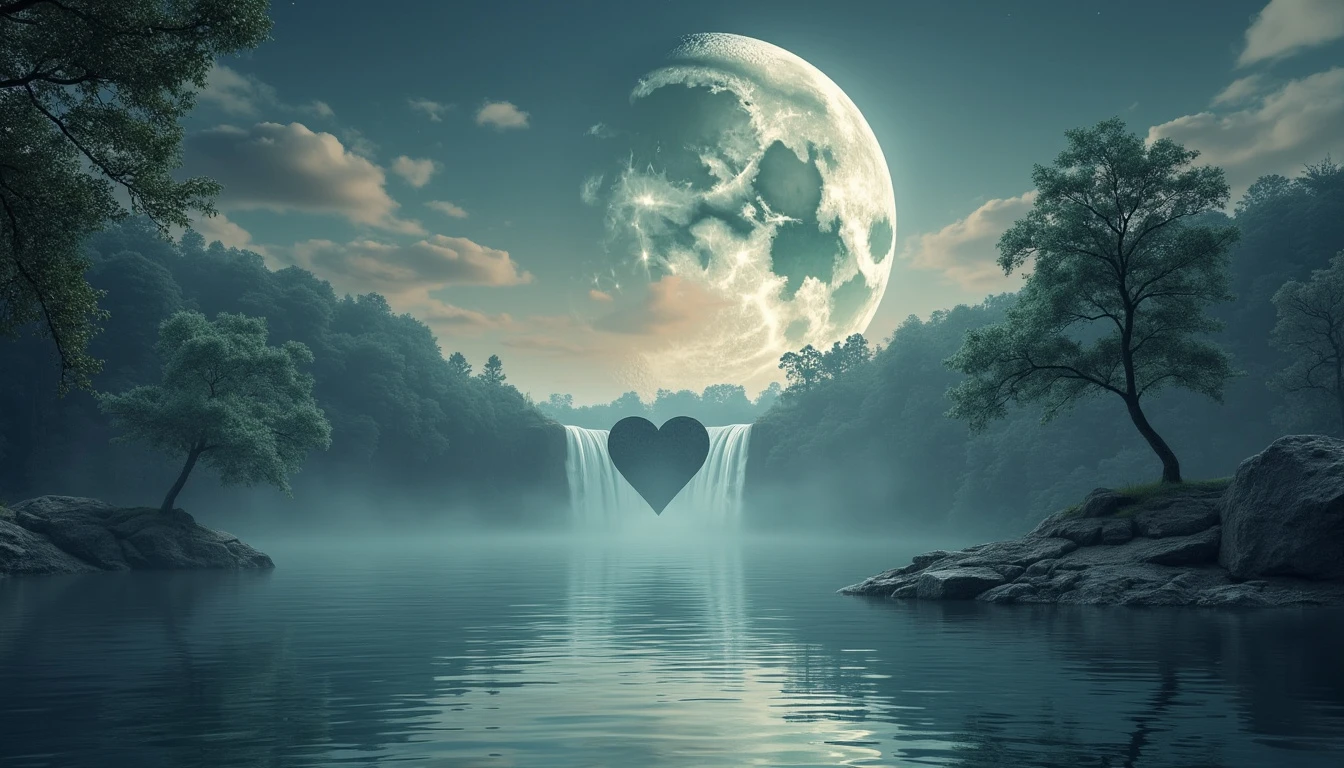 A hyper-realistic image moon a heart-shaped lake and a waterfall