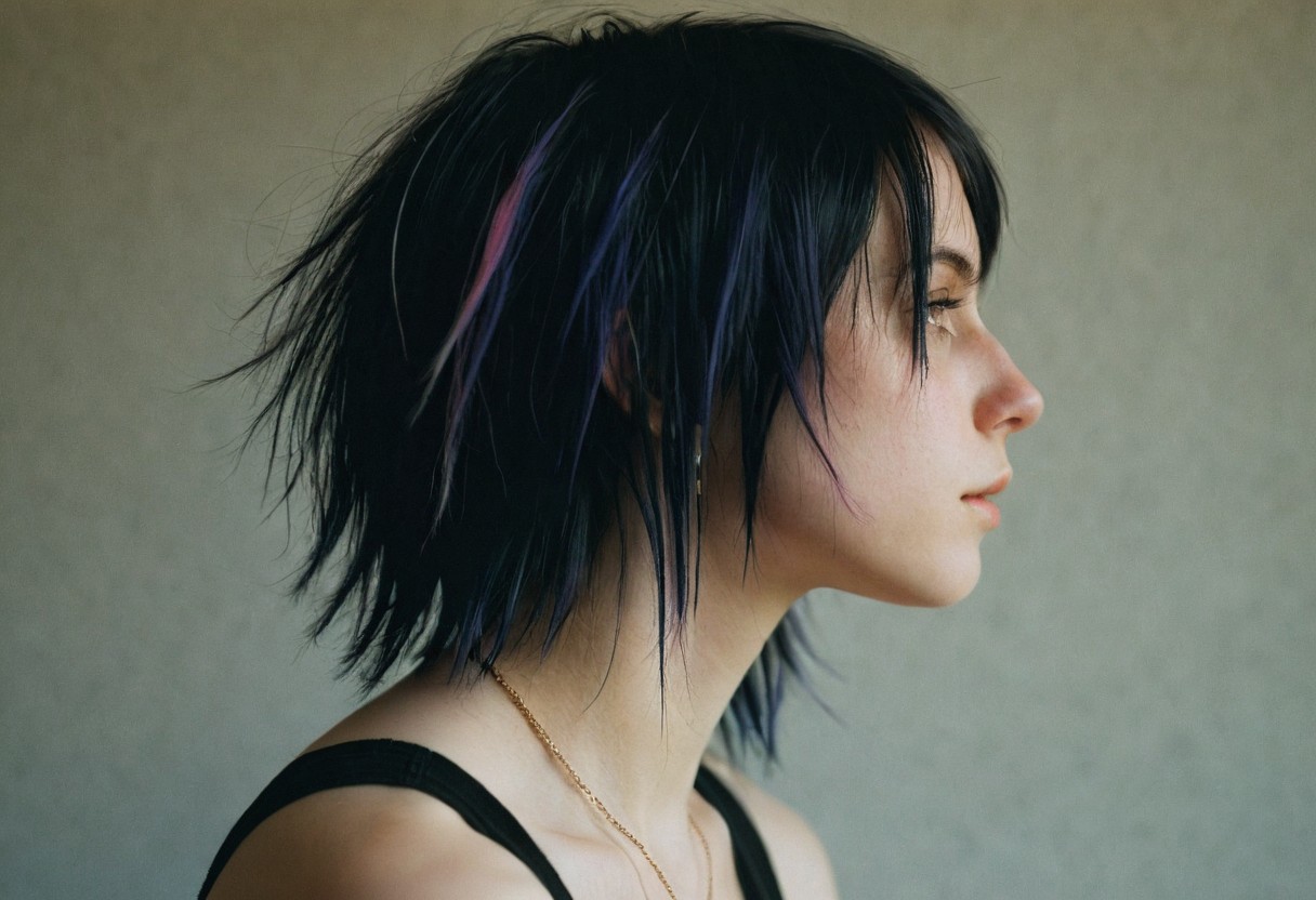 RAW photo, hip-level-shot:1.3, from the side, 20 year old American Emo woman, sensual, award winning, high detailed, 8k, natural lighting, analog film, detailed skin, amazing composition, intricate details, colorful, vellus hairs, amazing textures, filmic, chiaroscuro, soft light