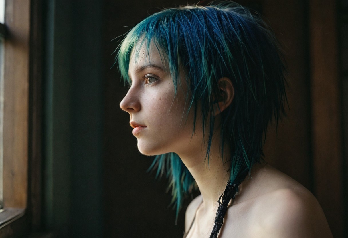 RAW photo, hip-level-shot, from the side, 20 year old American Emo woman, sensual, award winning, high detailed, 8k, natural lighting, analog film, detailed skin, amazing composition, intricate details, colorful, vellus hairs, amazing textures, filmic, chiaroscuro, soft light
