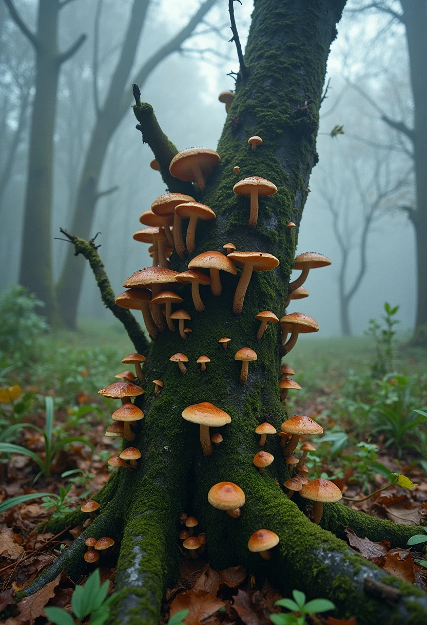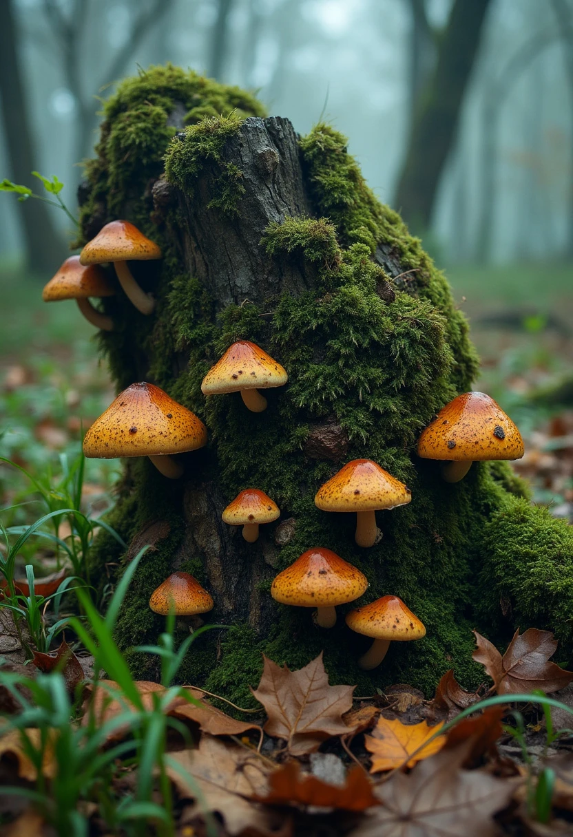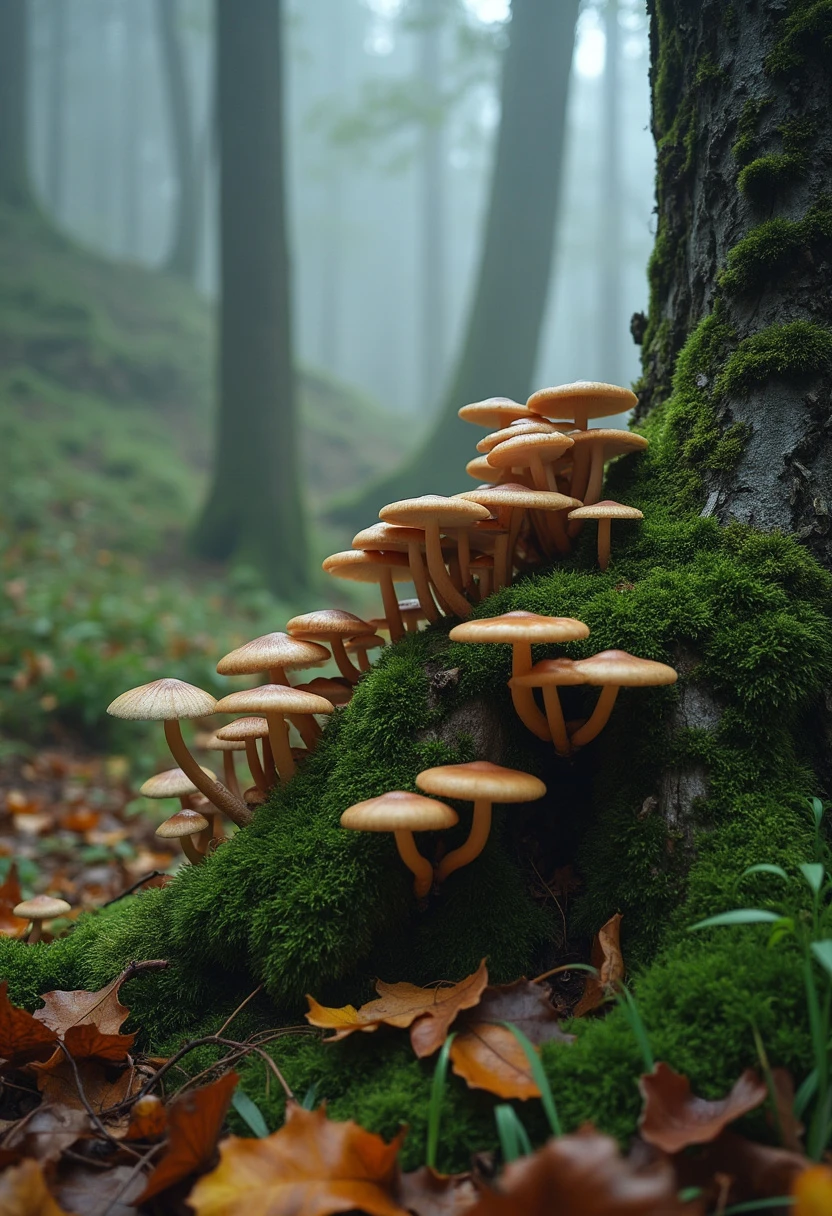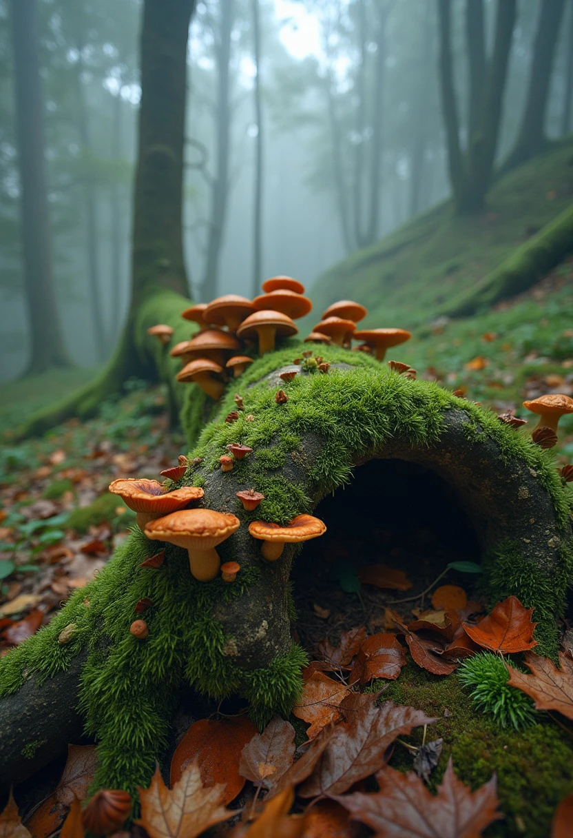 In the misty forest, there is an old moss-covered tree trunk with many mushrooms growing on it. The ground around it is covered in fallen leaves and green grasses, creating a dreamlike atmosphere in nature photography. This scene is captured with an ultra-wide-angle lens, resulting in super-high-resolution and high-definition details.