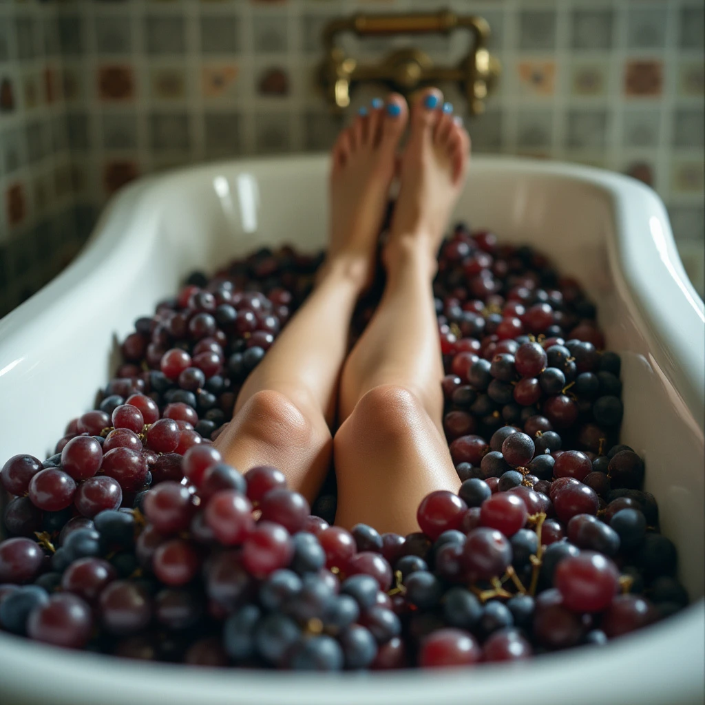 a photograph of a woman lying in a tub of grapes with her feet sticking out of the grapes, metallic blue nail polish, tub is fancy and white, in a classy bathroom