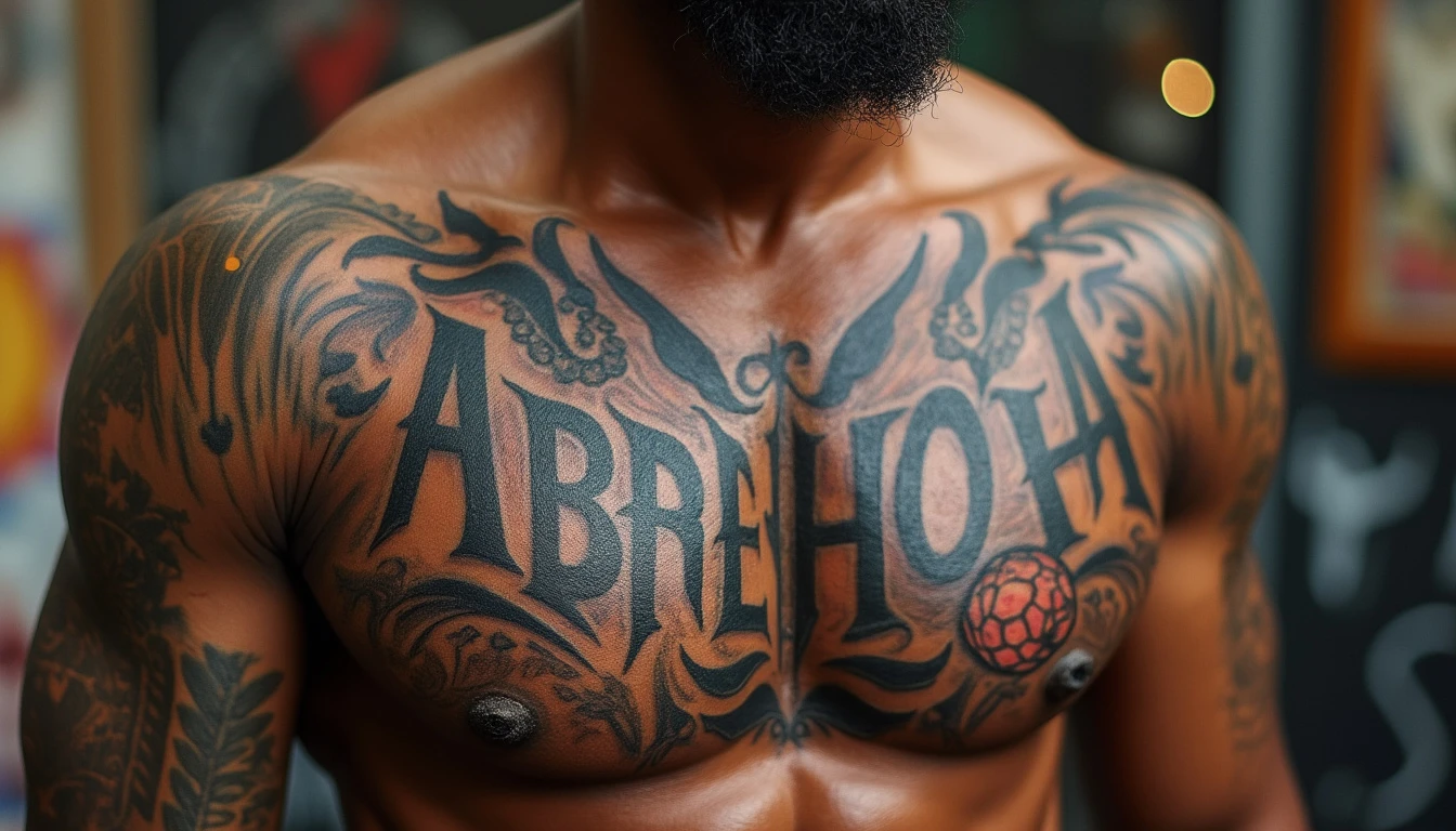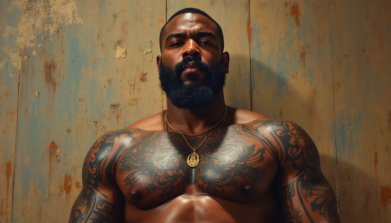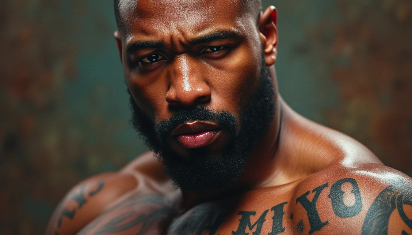 A hyper-realistic Michael Jai White, Tattoo text "Paulinho Loko"