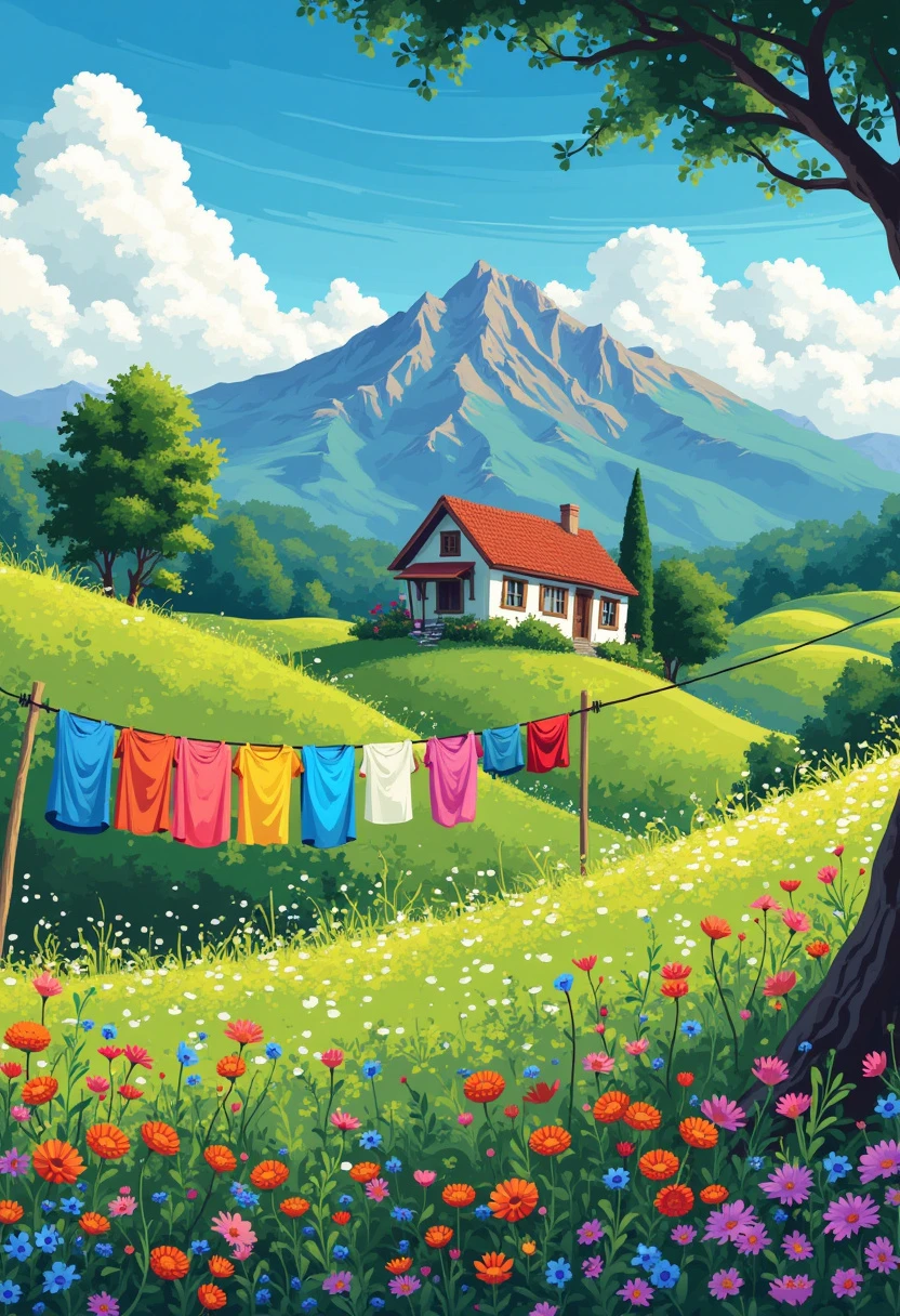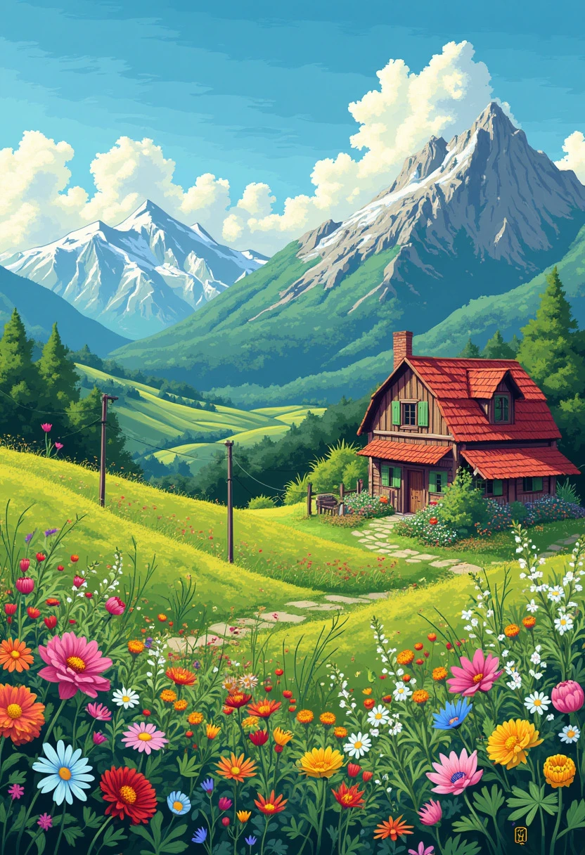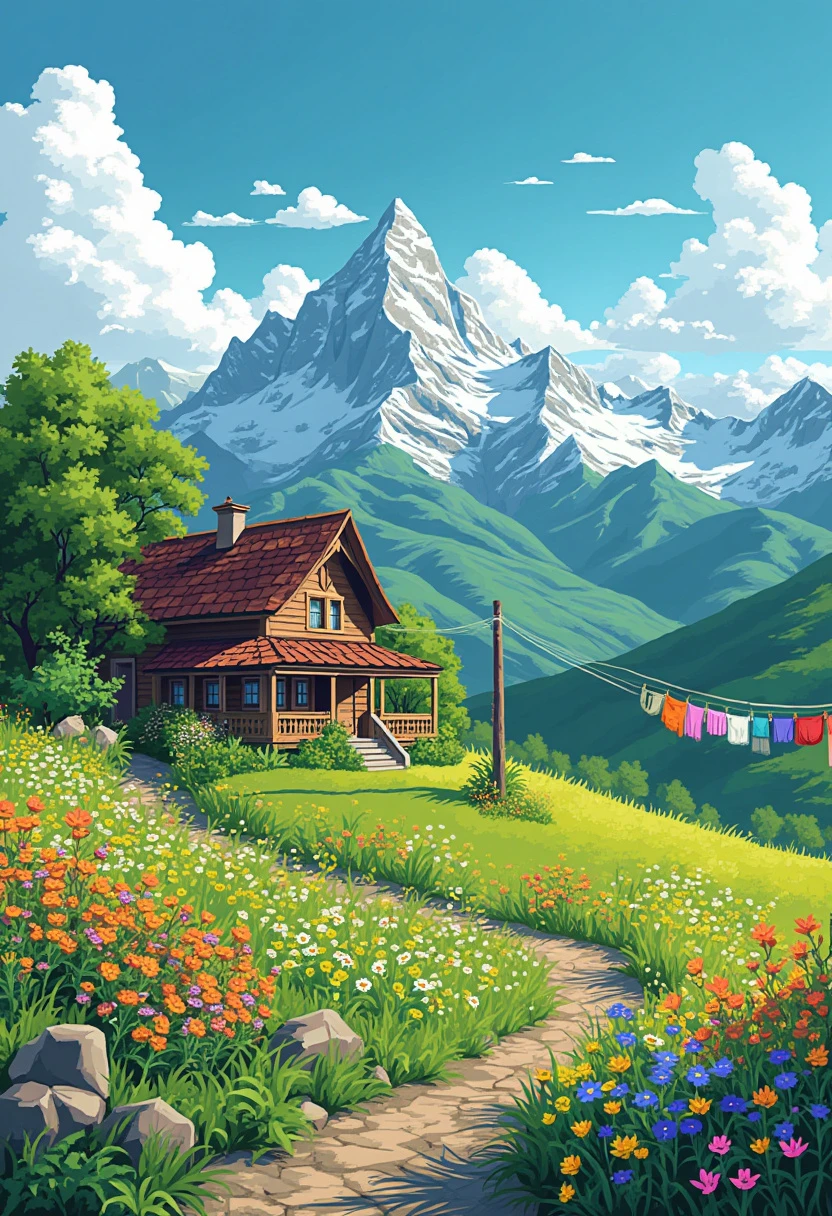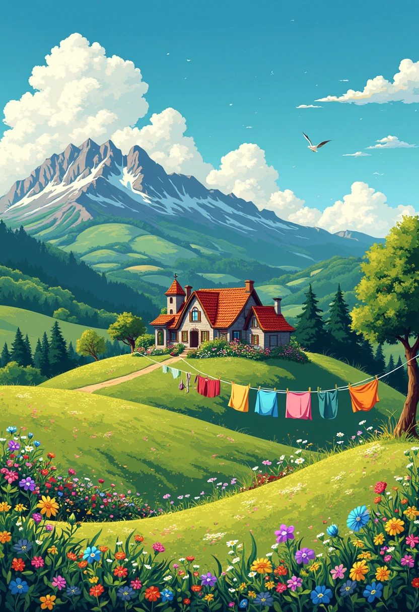 Create a vibrant, detailed landscape art in the style of Pixel art using green monochrome ink pen, featuring a charming farmhouse surrounded by colorful wildflowers, rolling green hills, and a majestic mountain range in the distance. A clear blue sky with fluffy white clouds completes the scene. Include a clothesline with brightly colored garments swaying gently in the breeze.