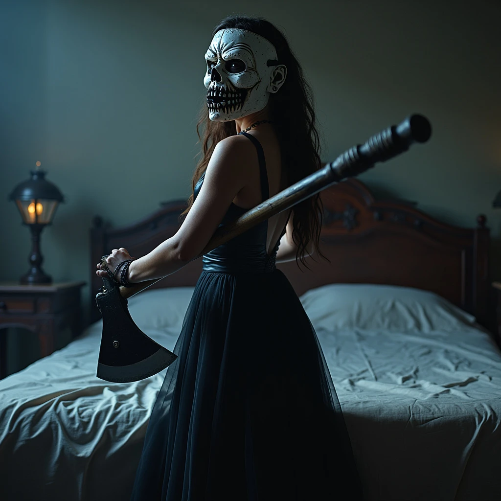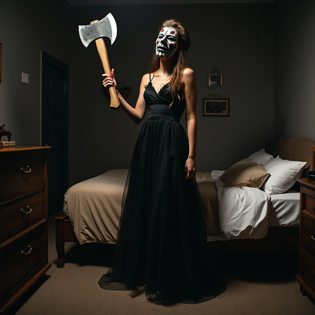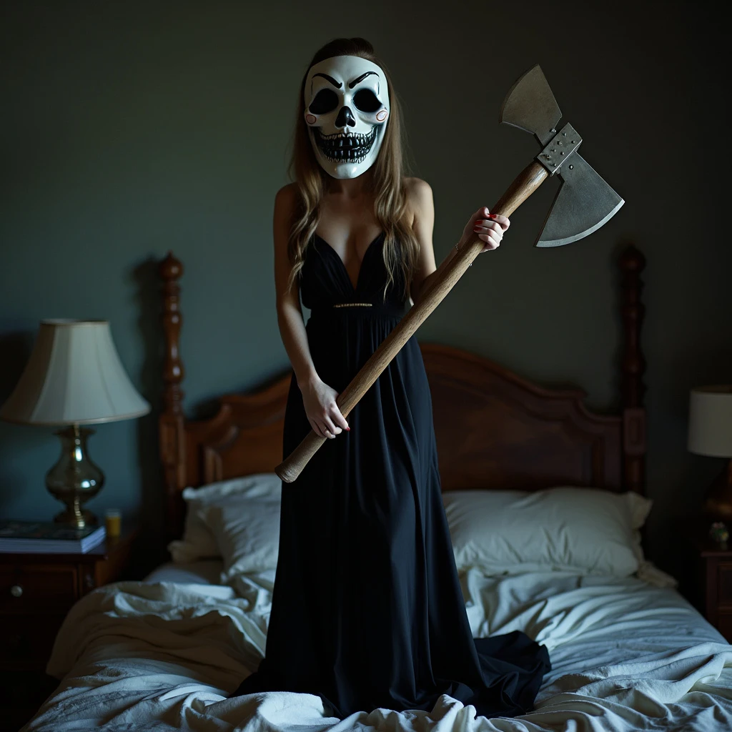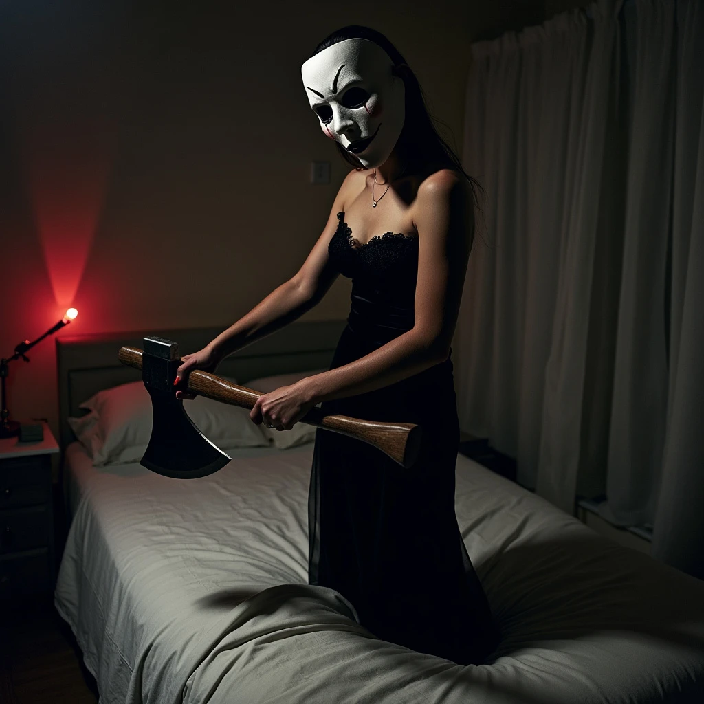 a 20 year old women in a black evening gown wearing a scary oversized mask and holding a very large axe, she stands at the foot of a bed, in a dark room, dramatically lit
