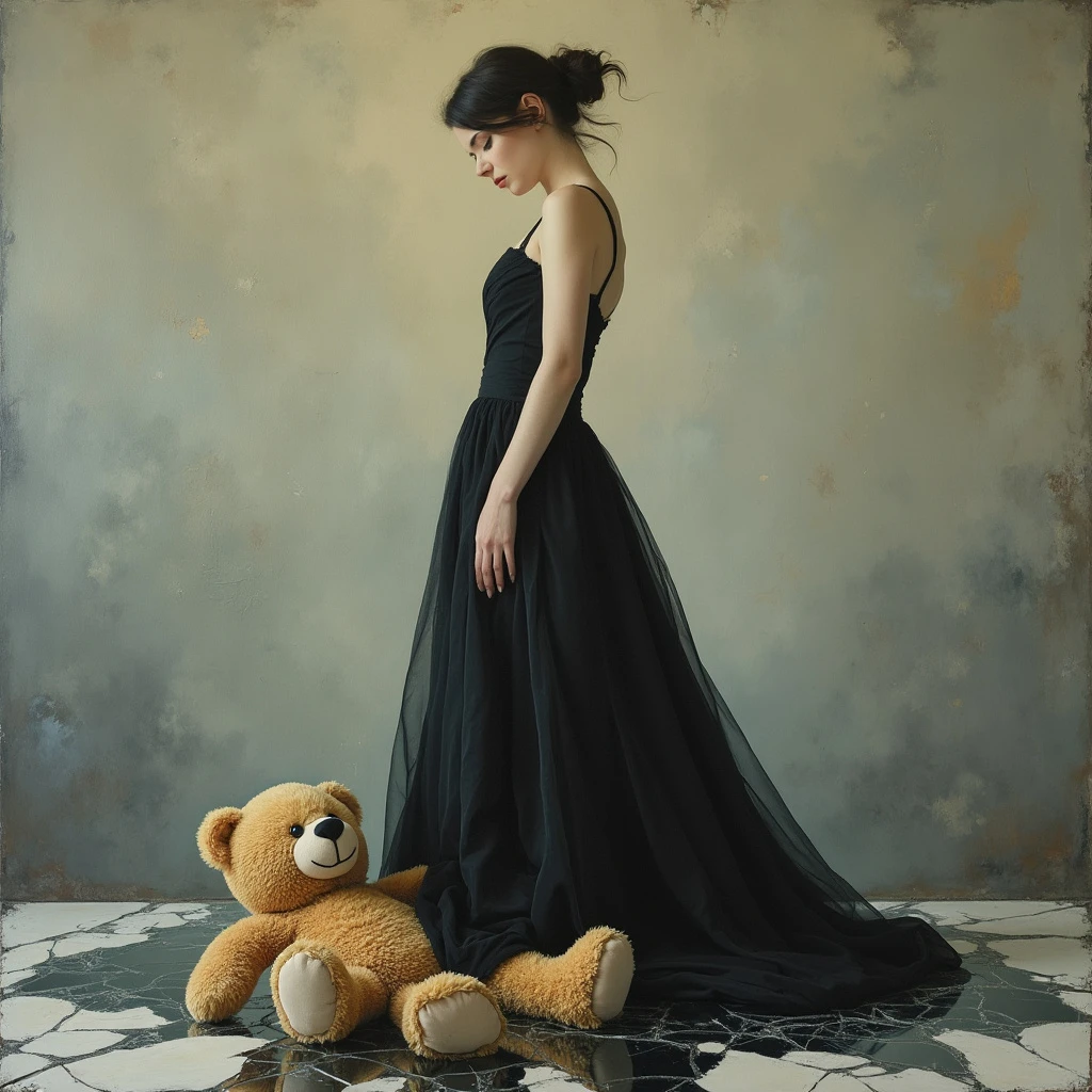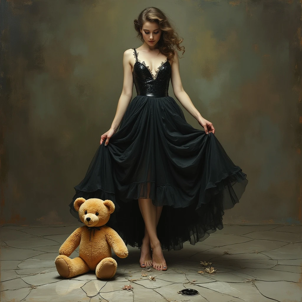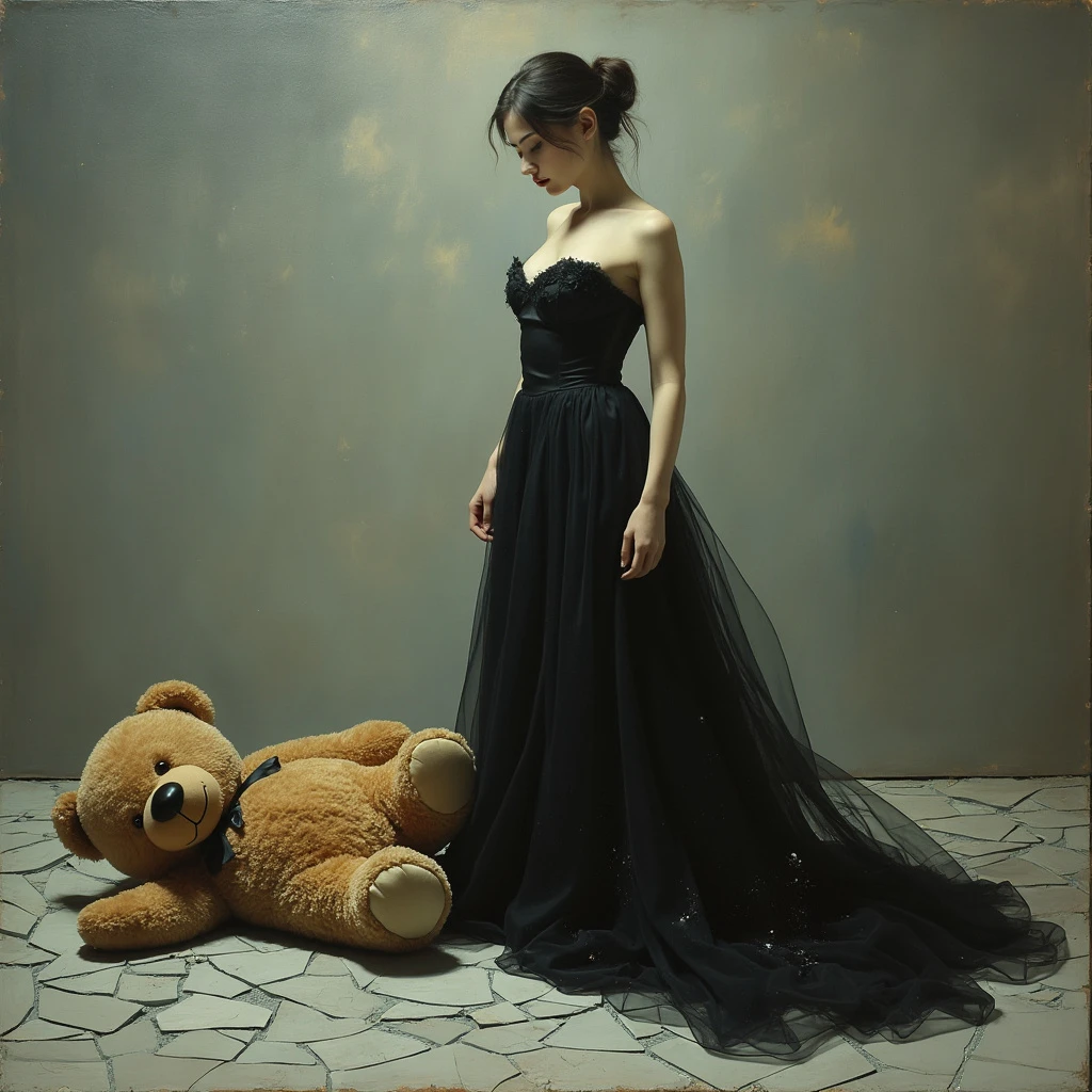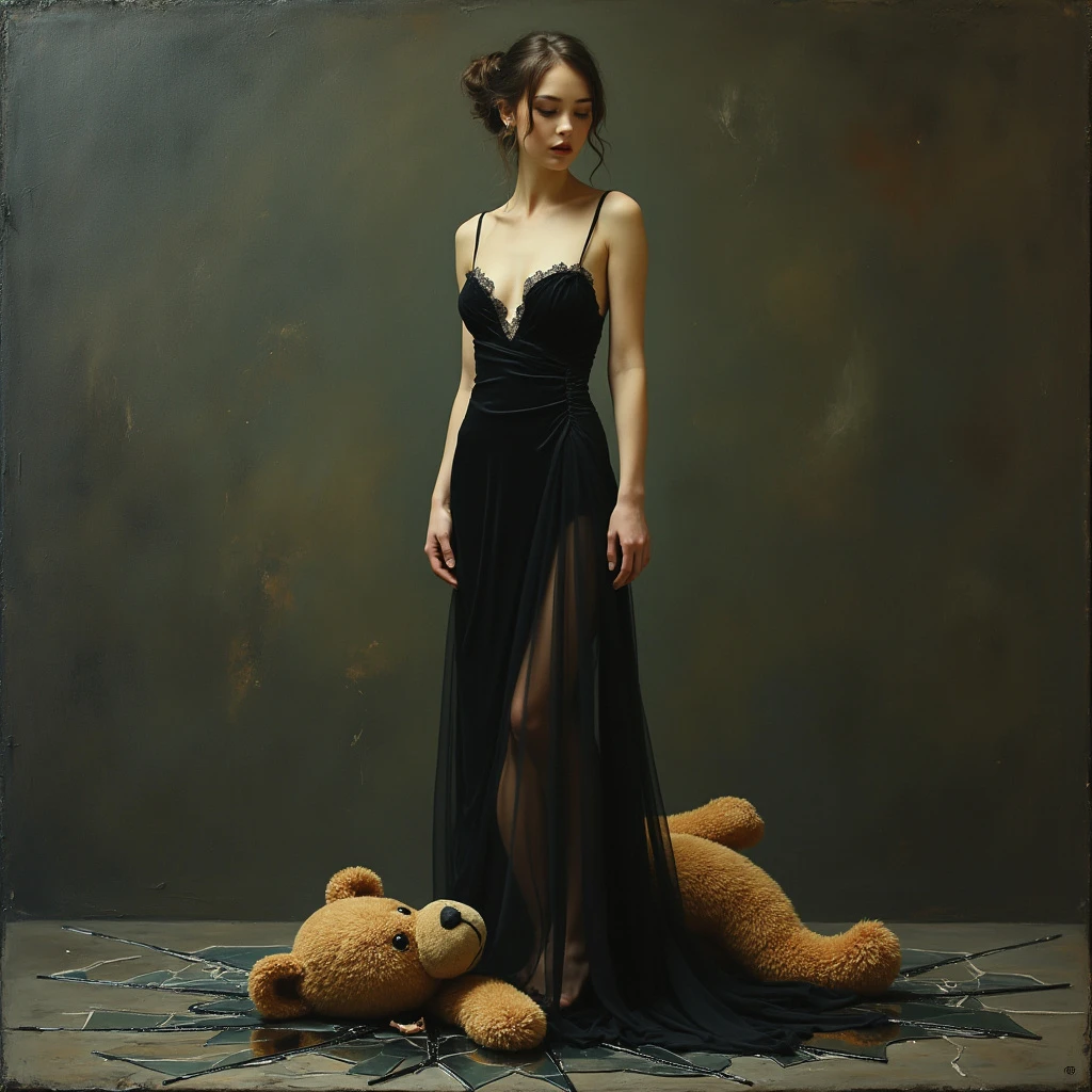 a 20 year old women in a black evening gown wearing standing on broken glass, surreal, avant-garde, detail, delicate, masterpiece, oil painting, impressionist, standing over a teddy bear with its head torn off