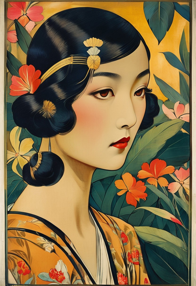 perfect anatomy, perfect proportions, best quality, masterpiece, high_resolution, high quality, art deco poster, a portrait of an Asian woman,1920s, Taishō Roman, modan garu, flapper girl, looking at viewer, eye contact, vibrant, vivid, beautiful, charming, alluring, stardom, glamorous, aesthetic, absurdres, retro, old fashioned, background of fabric with black&gold&tan art-deco abstract geometric patterns, old technicolor film style, film grain, aged film stock, insanely detailed, masterpiece, extraordinary achievement, award-winning, expressionist, style of Henri Rousseau