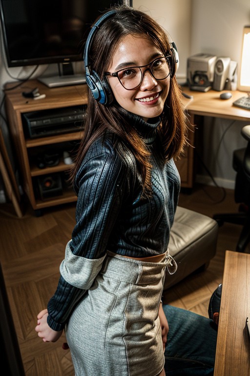 (MASTERPIECE BEST QUALITY:1.4), 1girl,(asian girl,confident,cozy),(seductive smile,),(messy hair),(thick black glasses:1.1),looking at viewer),(gaming headphones:1.1),(large breasts),(nubile),(long waist:1.2),bubble butt,(big butt:1.1), [(full body photograph:1.1),fashion photography of cute girl,upper body view showing her face and (cleavage:1.2),Photograph of (view from above:1.22),(full view of face:1.4),(wide angle lens:1.1),dynamic angle,(fisheye lens:1.2),upper body photo,film grain,candid,full body photo),(bent over:1.2)],sharp focus on subject,very detailed,high detailed texture,depth of field,cinematic illumination,(cinematic lighting,rim lighting,high-quality texture,detailed texture,photograph,photorealistic), (gaming accessories,modern apartment,modern room interior), <lora:HugeASS:0.1>,<lora:hairdetailer:0.4>,