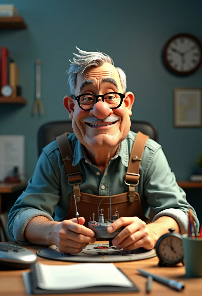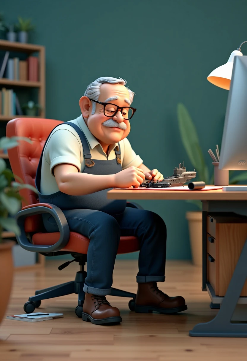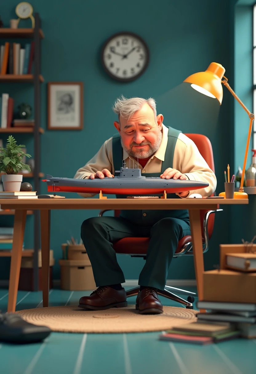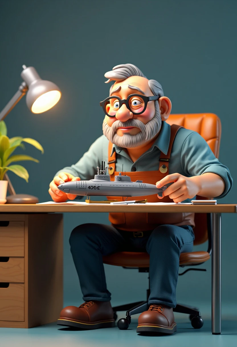 wide angle frontal shot 3d render of an short and fat old electrical engineer sitting around his work desk trying to fix a broken submarine model, simple one color background