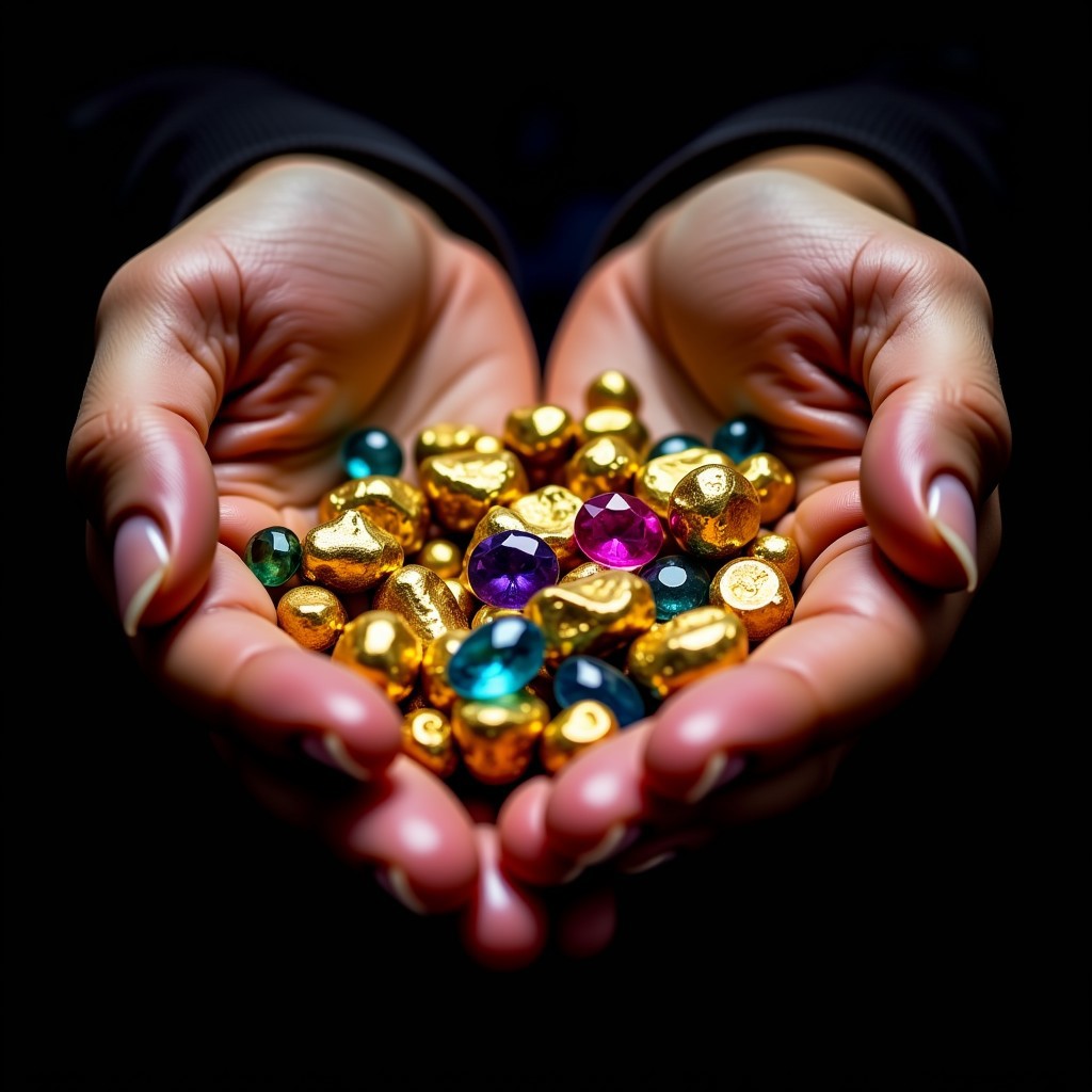 A mans hands cupping several large gold nuggets, cut diamonds and rubies and saphires, hands full of valuable treasure in the form of raw gold chunks and cut gems, priceless treasures within both hands