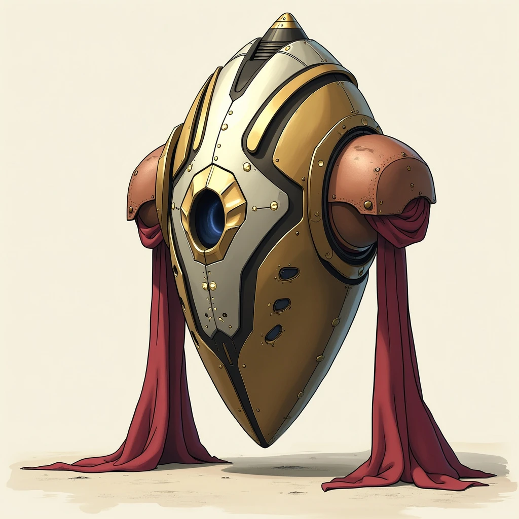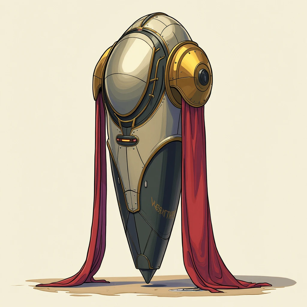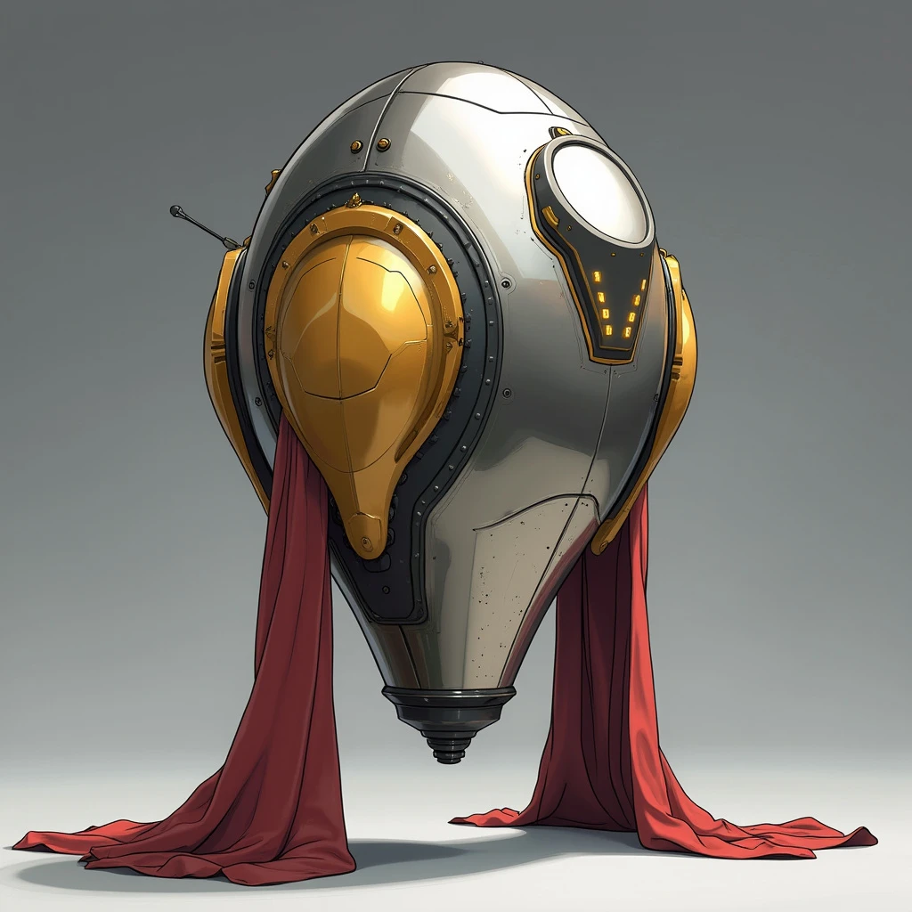 a metallic pod standing about 60cm tall, narrow and tapered at the bottom but widening at the top, the sides curve symmetrically almost organically into rounded shoulders, the top is smooth except for a ridge along the center that widens as it moves from back to front where it widens and extends forward like a short blunt snout, the snout is angular and has rows of small glowing lights on either side, decadent fabric drapes down from the shoulders, the pod hovers several centimeters above the floor, the pod has sections of gold and silver and then some painted in red or black