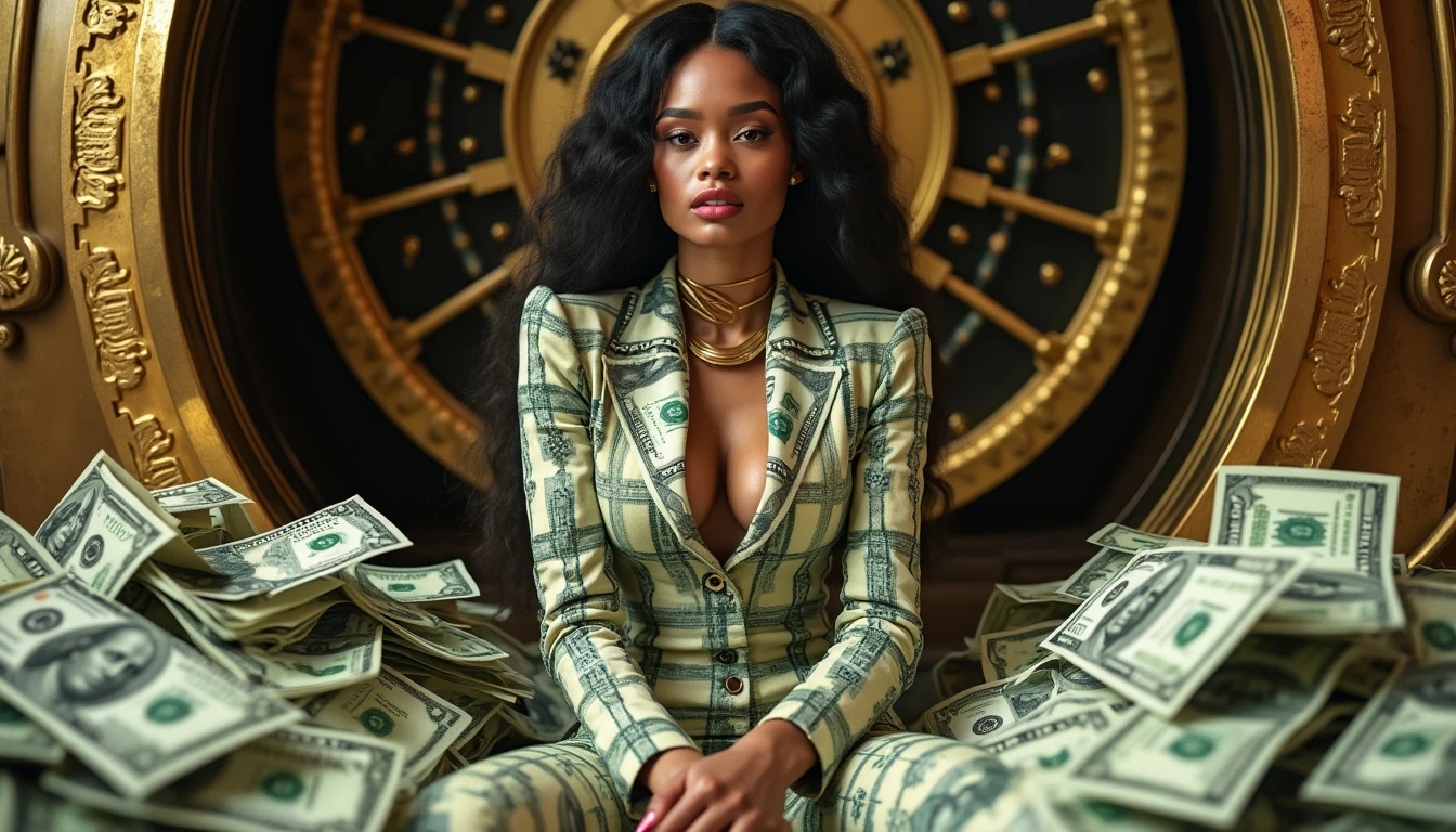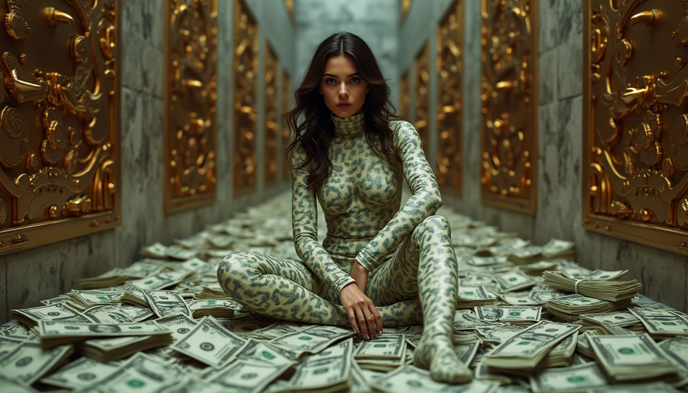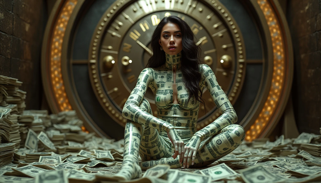 A hyperrealistic top model sitting confidently in the middle of an opulent bank vault, surrounded by piles of millions of dollars in cash. Her entire skin is made of intricately detailed dollar bills, with each bill forming the texture and structure of her body. Her eyes, lips, and accessories blend seamlessly into this money-made form, but retain a hyperrealistic quality. The composition follows the rule of thirds, with the model striking an artistically original and captivating Vogue editorial pose, exuding power and wealth.
