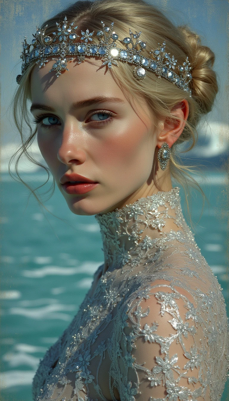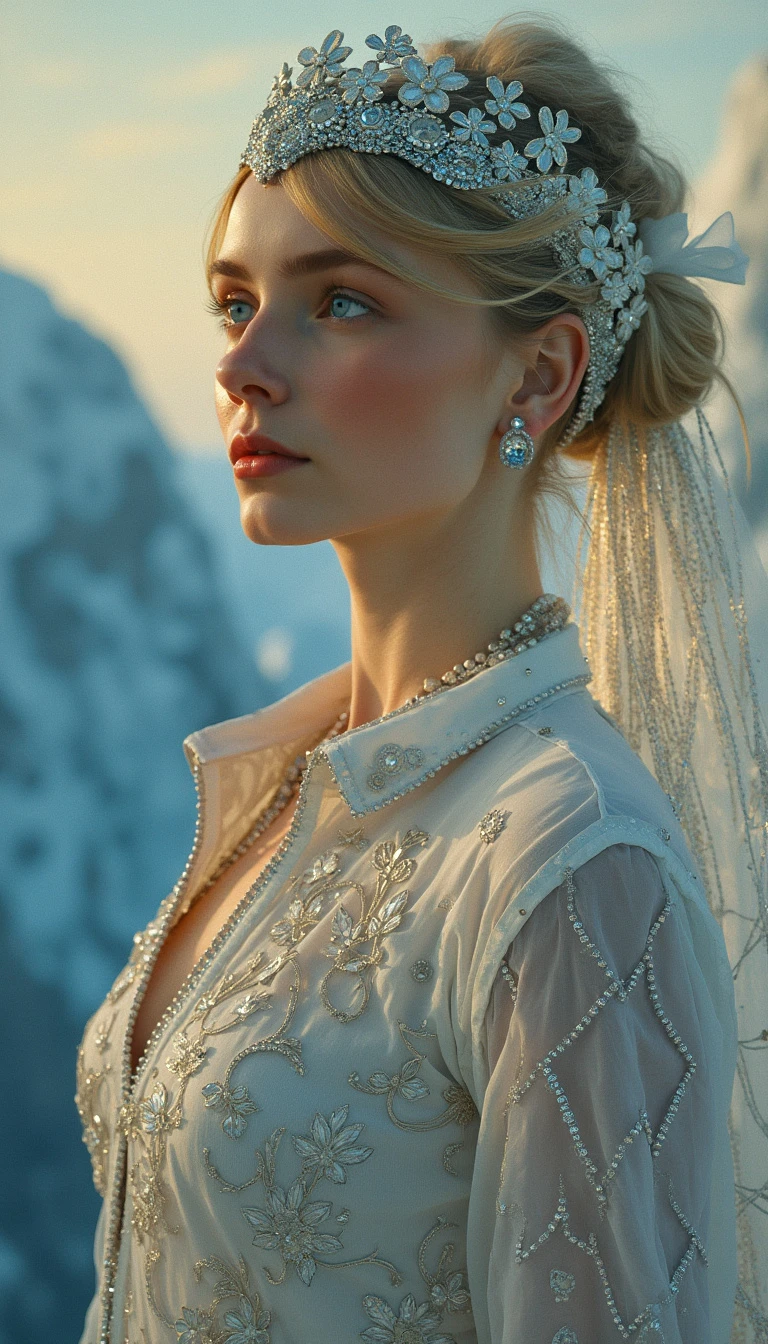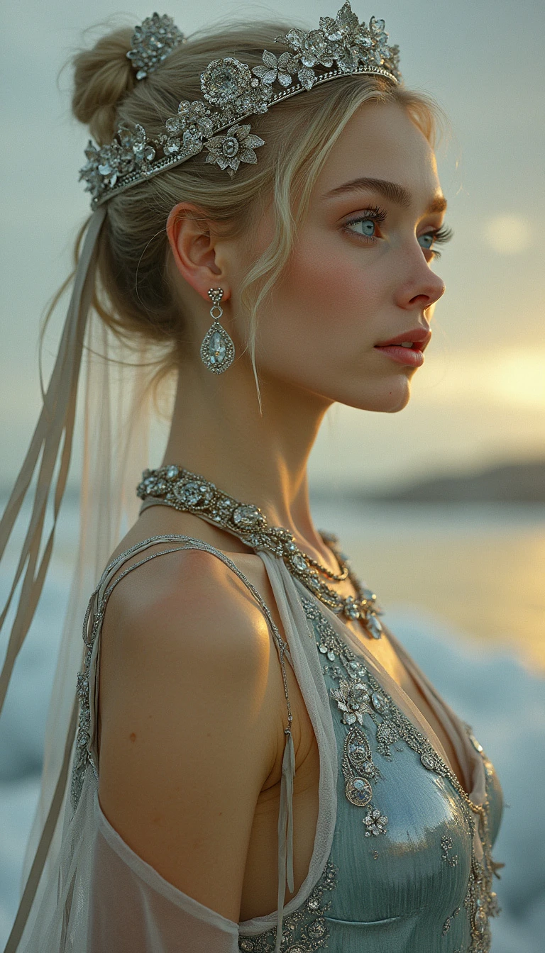 art nouveau art by Gerhard Munthe and Abram Efimovich Arkhipov, erotisch, lasziv, Slim Icelandic maiden with piercing blue eyes reflecting glacial purity and platinum waves, As the sun slowly dips below our horizon for some to call out as a middle aged and futuristic gymnastics competition takes hold. But this time, no matter the intensity of their creation, tiara adorns its head, displaying a unique ensemble. Clad entirely in sleek, silver designs from the same fabric â it is adorned with delicate geometric shapes depictoring an eclectic mix of colors and forms, , Norwegian National Romanticism, decorative arts, folk motifs, critical realism, rural landscapes, genre scenes, capturing the everyday life of Russian peasants, empathetic portrayals, social commentary