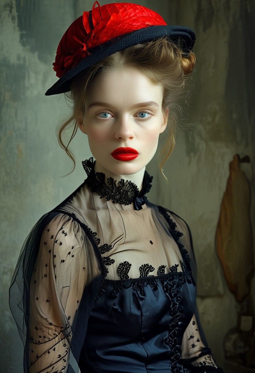 High fashion model photo, , irish woman, high detalied natural skin, (strange hair1.2), (like Orla Fitzgerald1.2), cute, suggestive, joyful expression, elegant, intense gaze, stylish, Fauvism Art of elegant clothes, gothic, medieval, Olivier Valsecchi, Albert Benois, Samuel Peploe, artwork by Klee and Kandiskhy, (red hat1.2), photo by (Paolo Roversi1.2),frontal view, studio lighting, in the style reminiscent of Vermeer's lighting techniques, bathed in soft lighting, Bauhaus still background, low angle shoot, sharply focused, trending of artstation