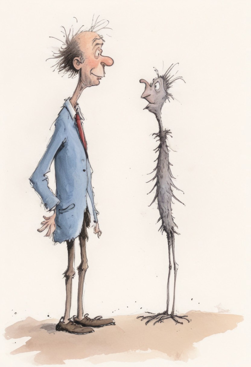 <lora:Quentin Blake Style:1>Quentin Blake Style - Quentin Blake illustration of a talking person standing