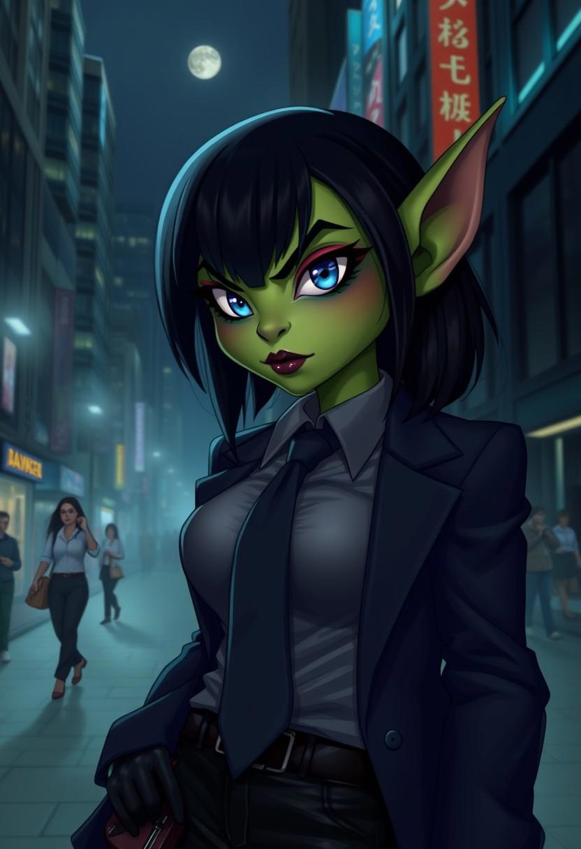 goblin girl, green skin, medium breasts, stylish, dramatic angle, (big lips:0.8), blue eyes, suit jacket, mean face, long necktie, gray shirt, black hair, dark lips, in public, city streets, modern city, noir theme, (shortstack:0.8), leather pants, night, moonlight, fog, smirk, black gloves,