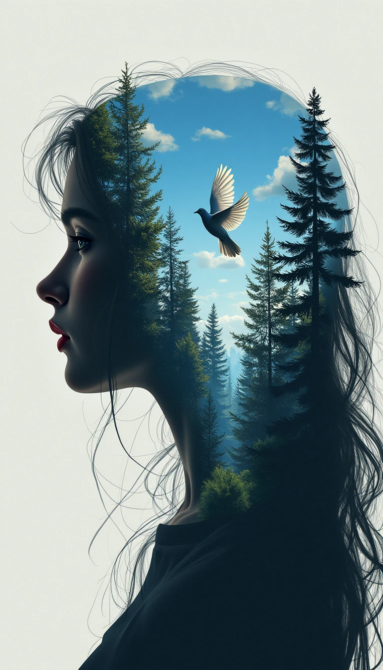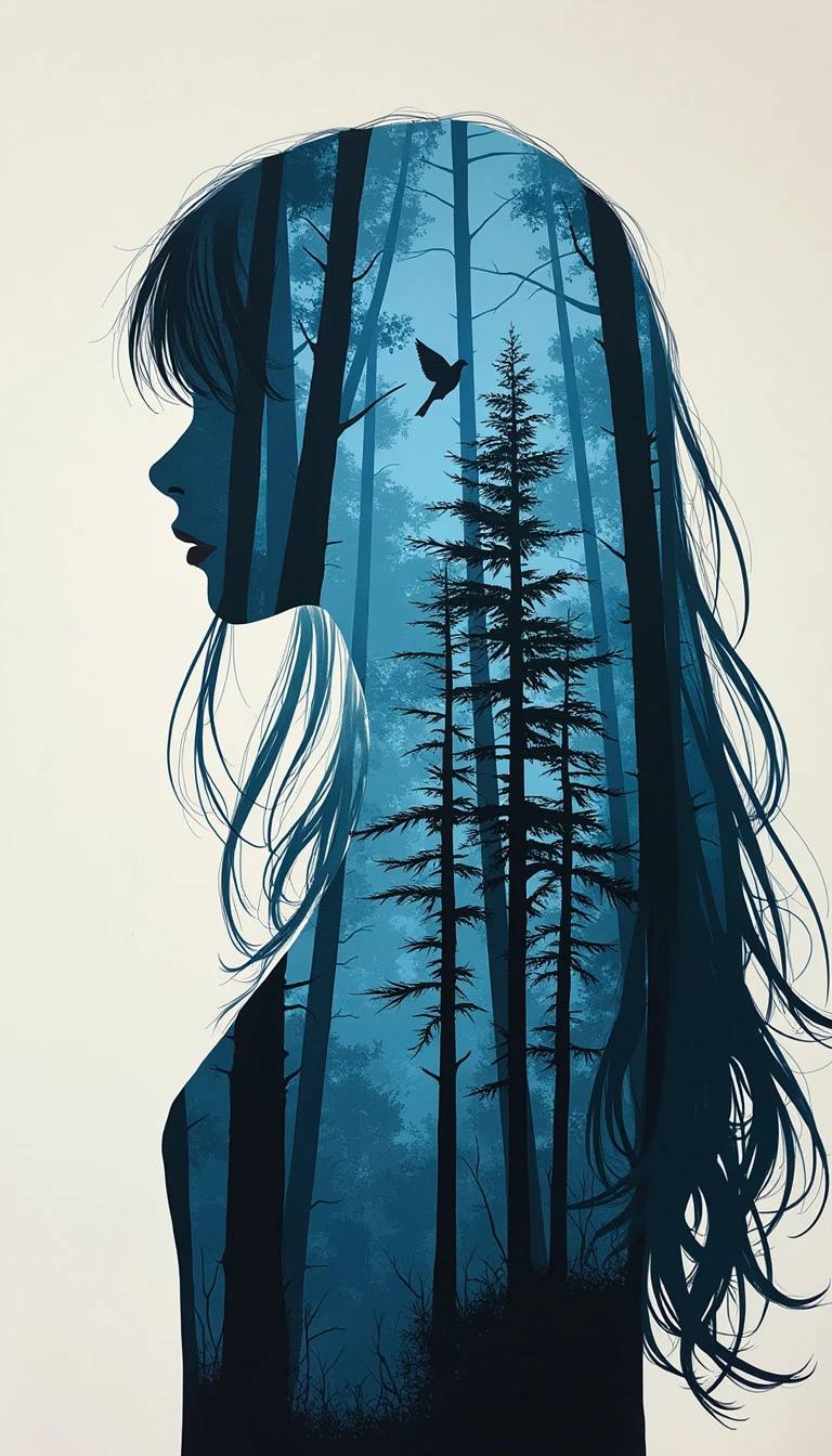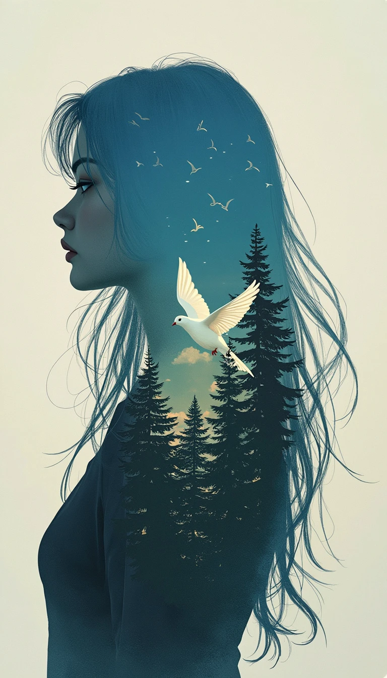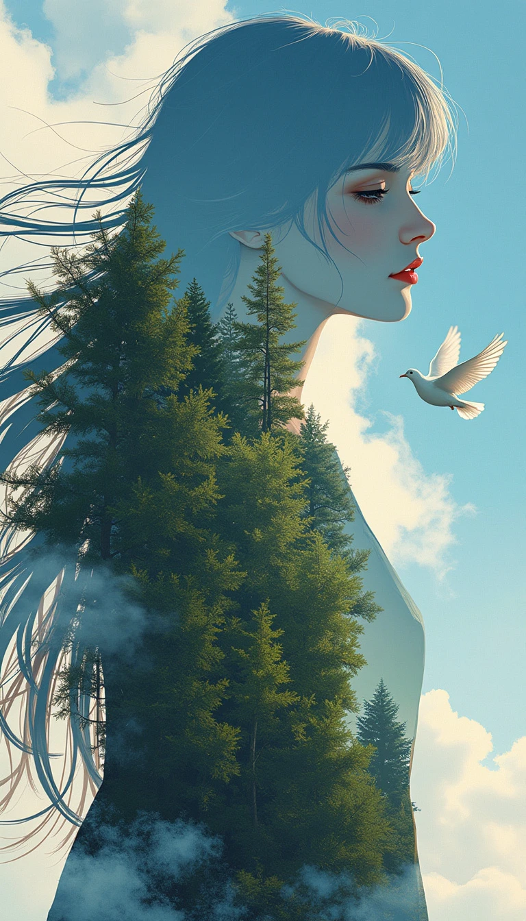 anime, illustration, cartoon, pastel, dry chalk drawing, 4k, close-up, realism, cinematic quality, Silhouette of a beautiful woman with long hair filled with a summer forest, with a dove in flight, double exposure, sharp lines, blue sky background