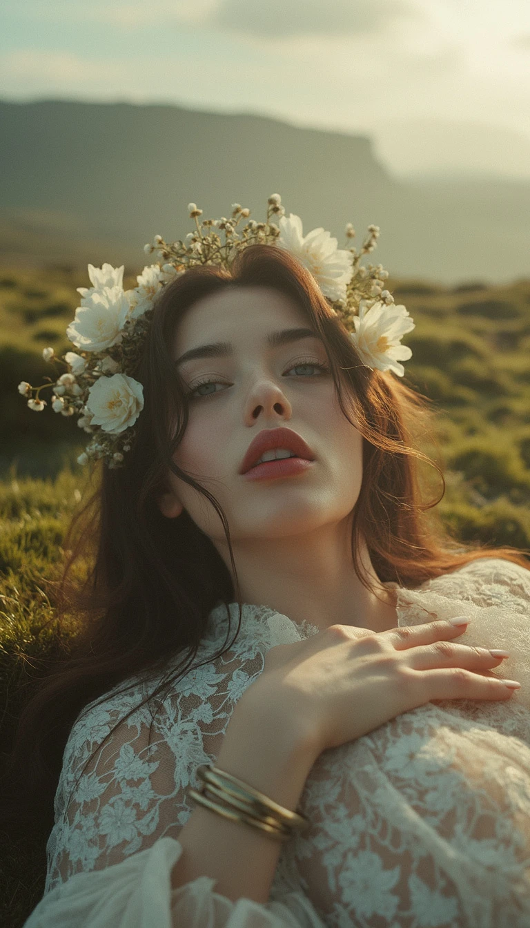 avant garde fashion photography in the style of Camilla Akrans, down angle shot, three quarters framing photo of beautiful female Korean kpop idol KARINA of AESPA, she is outdoors at a mossy field in Iceland during golden hour with slightly overcast weather, the scene is backlit by soft sunlight, she is lying down on a mossy stony field, her slender body is facing the camera, her beautiful wavy long hair is adorned with many pale wild flowers native to Iceland, she is fully nude but is covering herself by draping an expensive intricate designer embroidered sheer white lace short bridal gown by Galia Lahav, her slender thighs and shoulders and hips and breasts are visible through the fabric, she places her fingers gently around her neck, one intricate slim viking silver bangle on her wrist, she has a surprised expression, fine water condensation droplets on her face, photographed on film using a large format camera with shallow depth of field, realistic film grain is visible in the final image, no tattoo, fine water mist is floating in the air