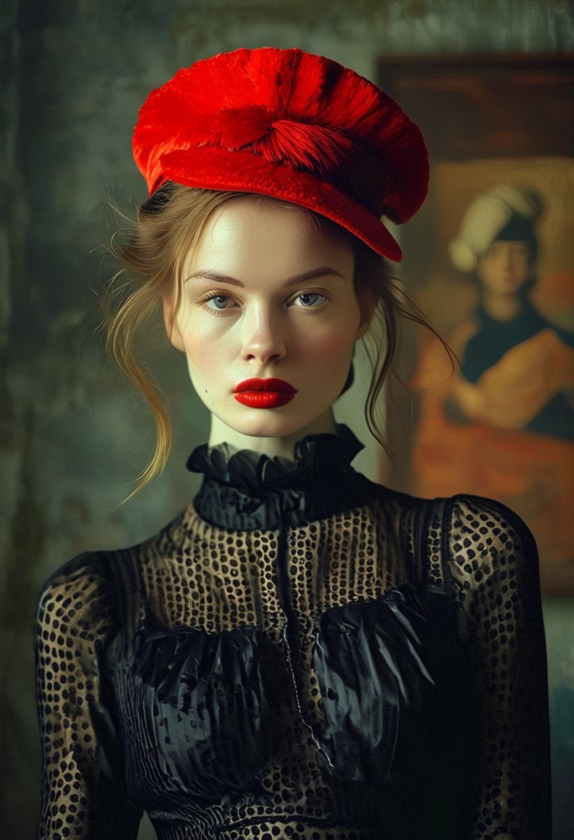 High fashion model photo, , irish woman, high detalied natural skin, (strange hair1.2), (like Orla Fitzgerald1.2), cute, suggestive, joyful expression, elegant, intense gaze, stylish, Fauvism Art of elegant clothes, gothic, style of David Alfaro Siqueiros, artwork by Klee and Kandiskhy, (red hat1.2), photo by (Paolo Roversi1.2),frontal view, studio lighting, in the style reminiscent of Vermeer's lighting techniques, , Bauhaus style background, low angle shoot, sharply focused, trending of artstation