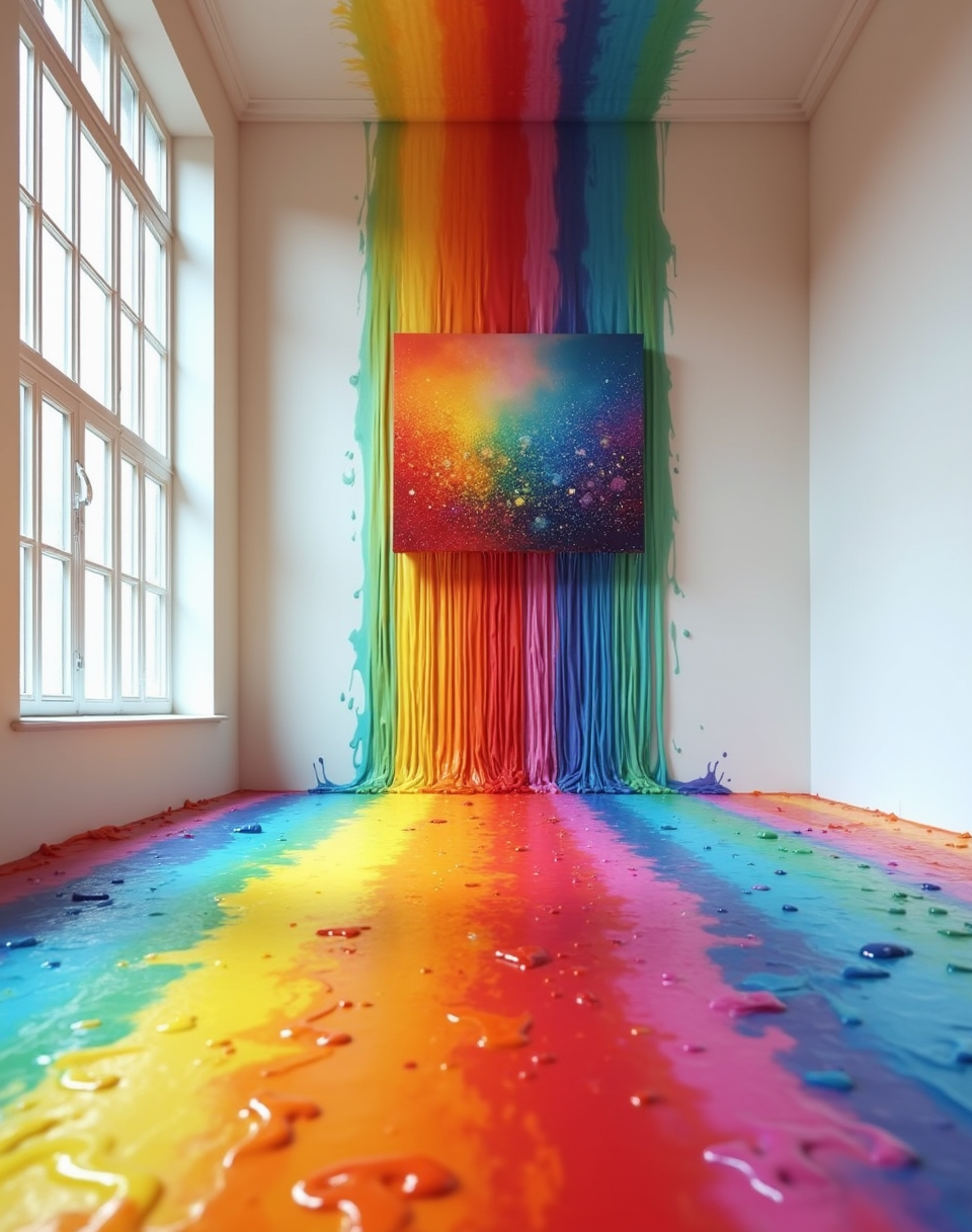 3D art of a rainbow-colored floor, dripping down the wall and into an empty room with large windows. The colors flow onto a canvas hanging on the wall, creating a beautiful abstract painting. This scene symbolizes creativity in interior design